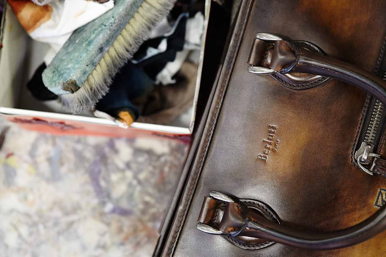 L’ensemble est marqué par la signature « Berluti pour Krug », apposée à l’intérieur comme à l’extérieur des sacs.