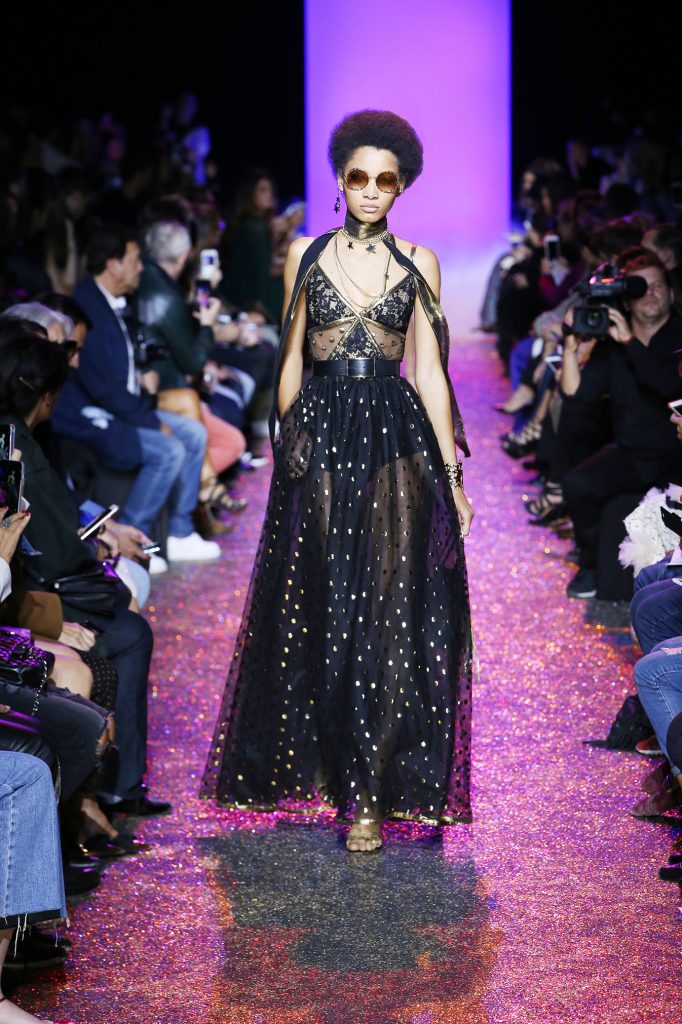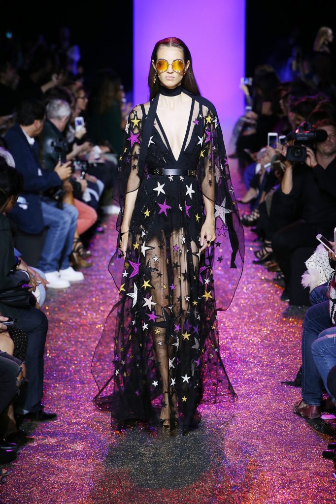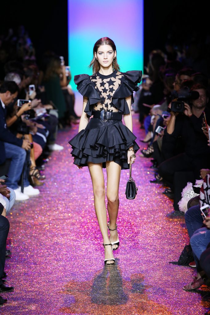 Des étoiles en technicolor dansent au fil de la collection sur des imprimés, des pans de dentelle et des broderies. Tandis qu’un jeu de prisme en noir, blanc et or dévoile une géométrie nouvelle.