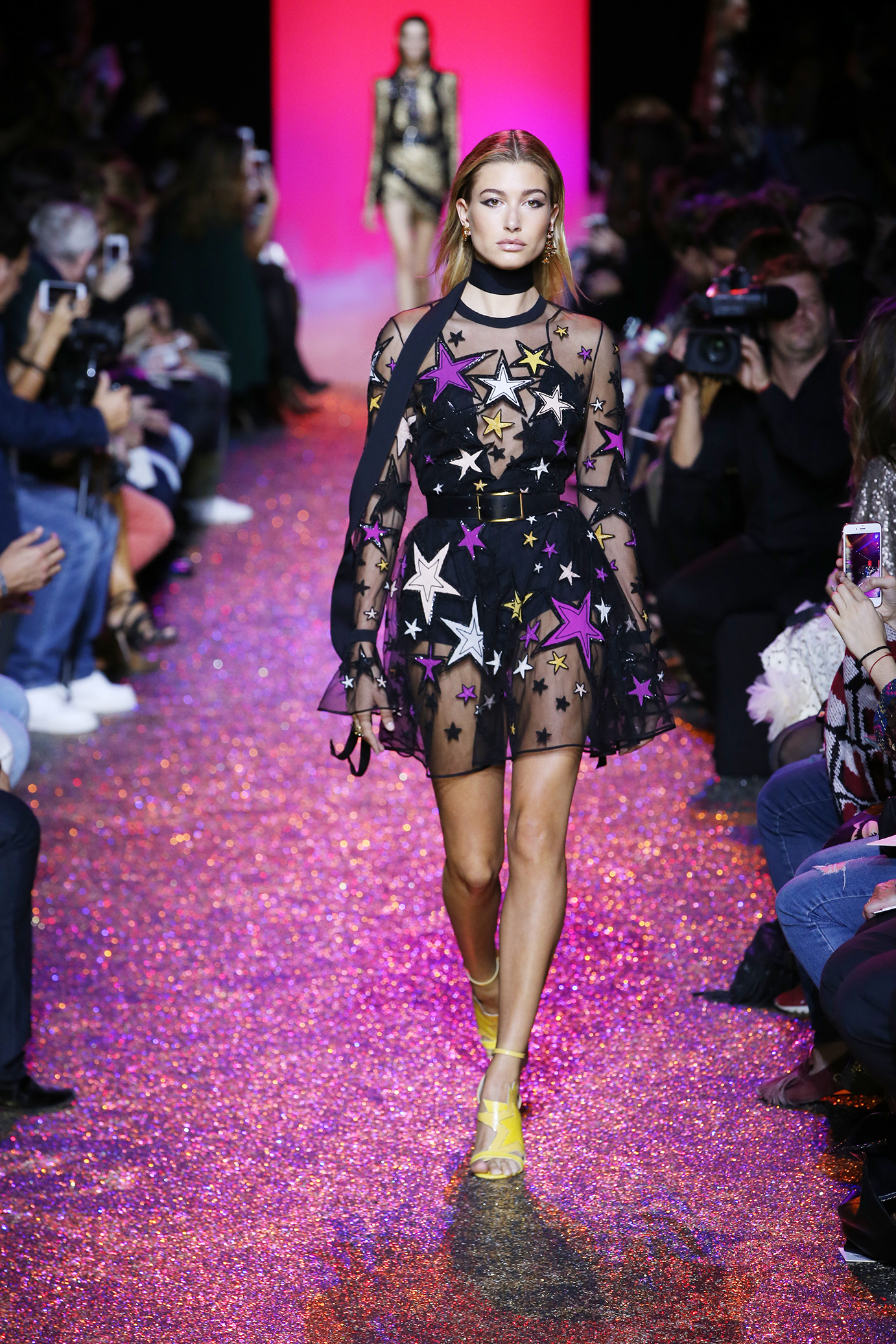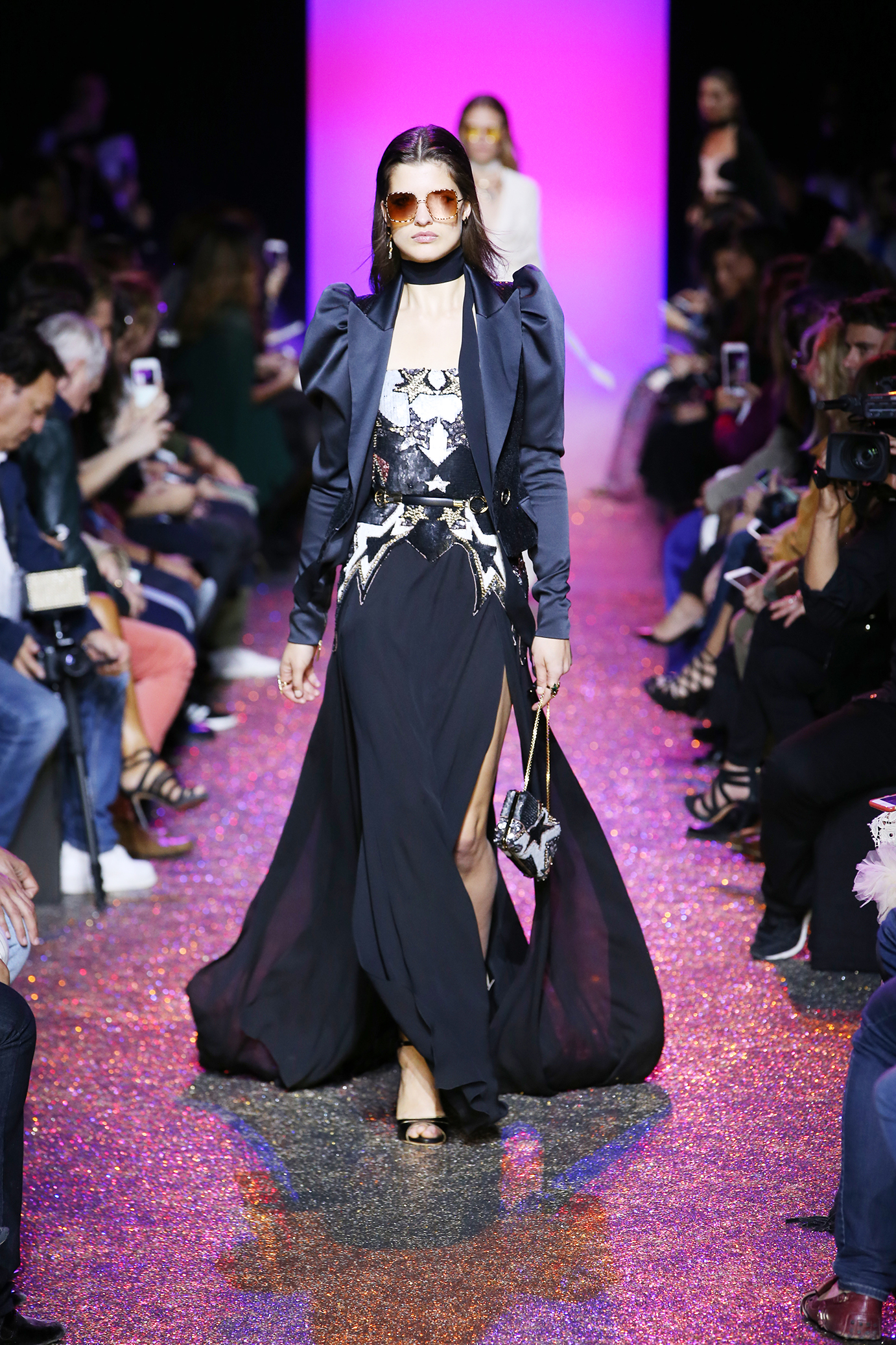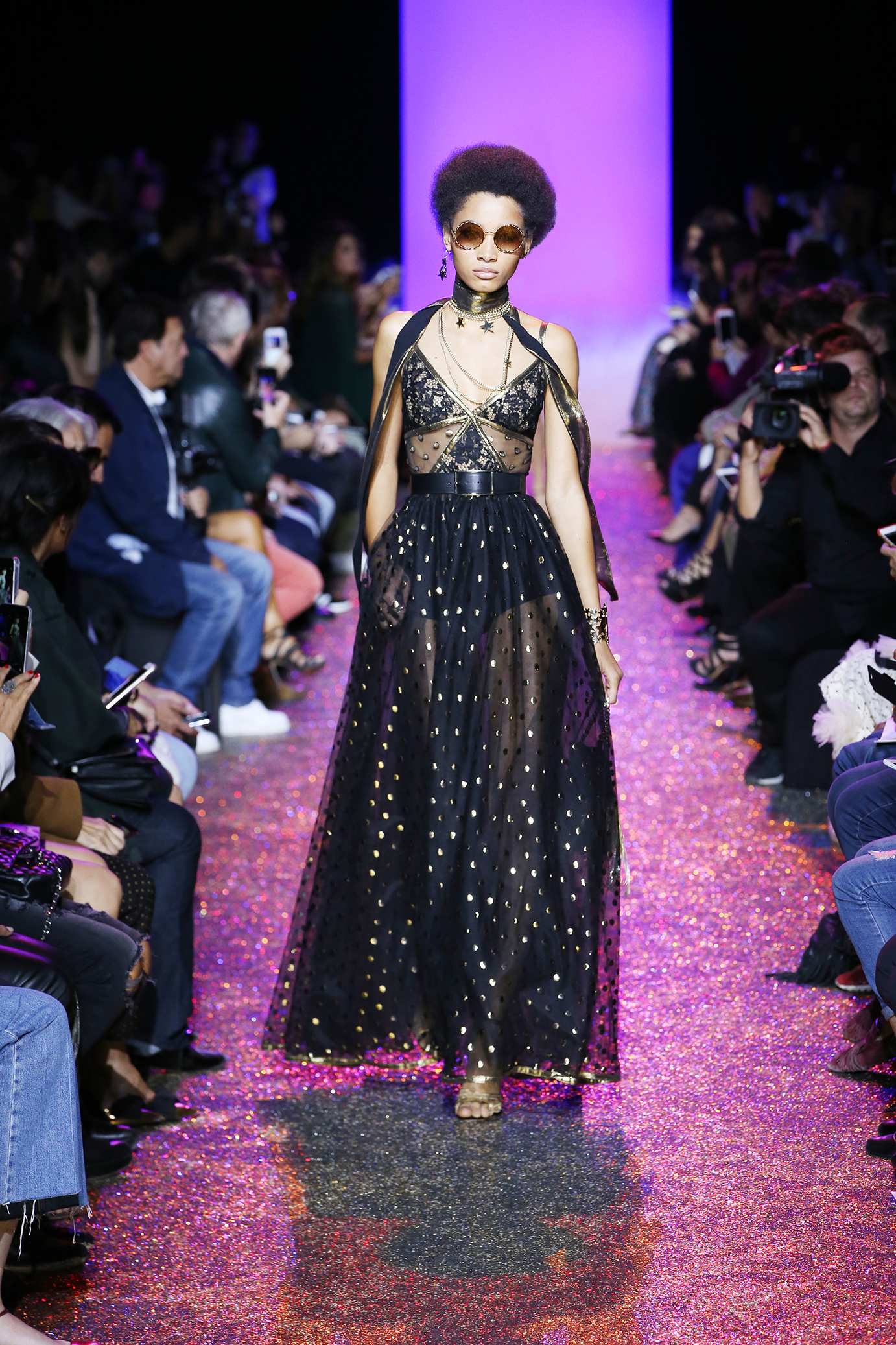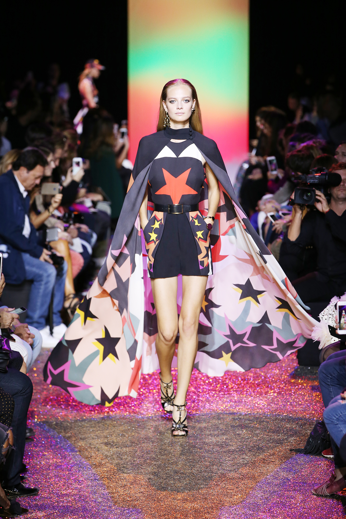 Des étoiles en technicolor dansent au fil de la collection sur des imprimés, des pans de dentelle et des broderies. Tandis qu’un jeu de prisme en noir, blanc et or dévoile une géométrie nouvelle.