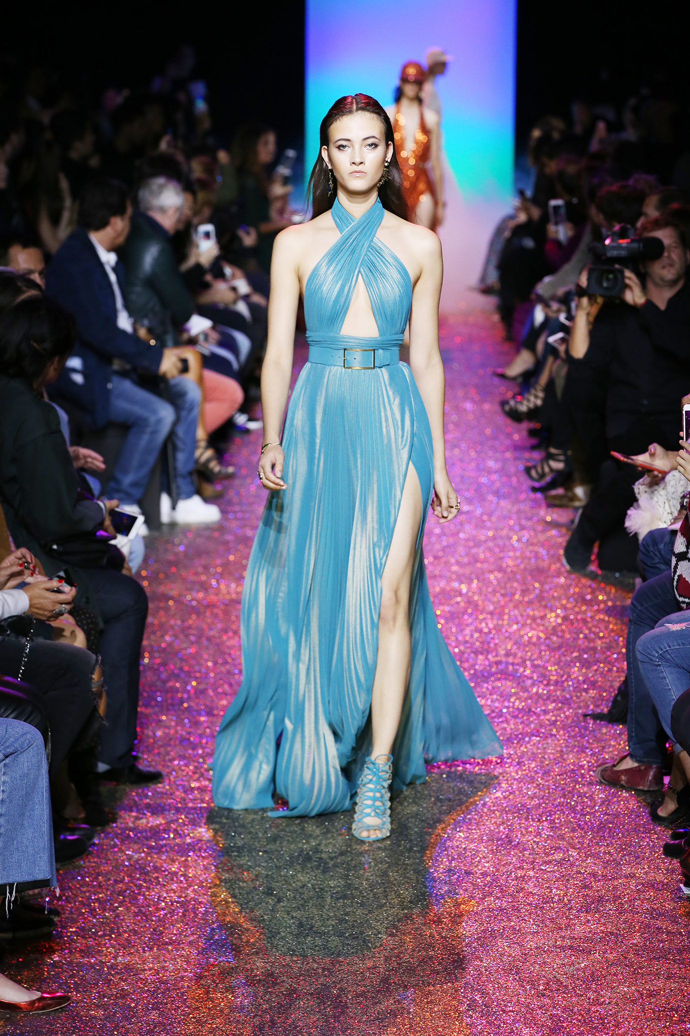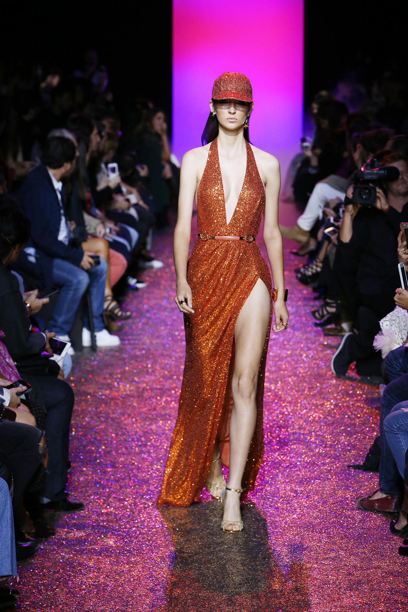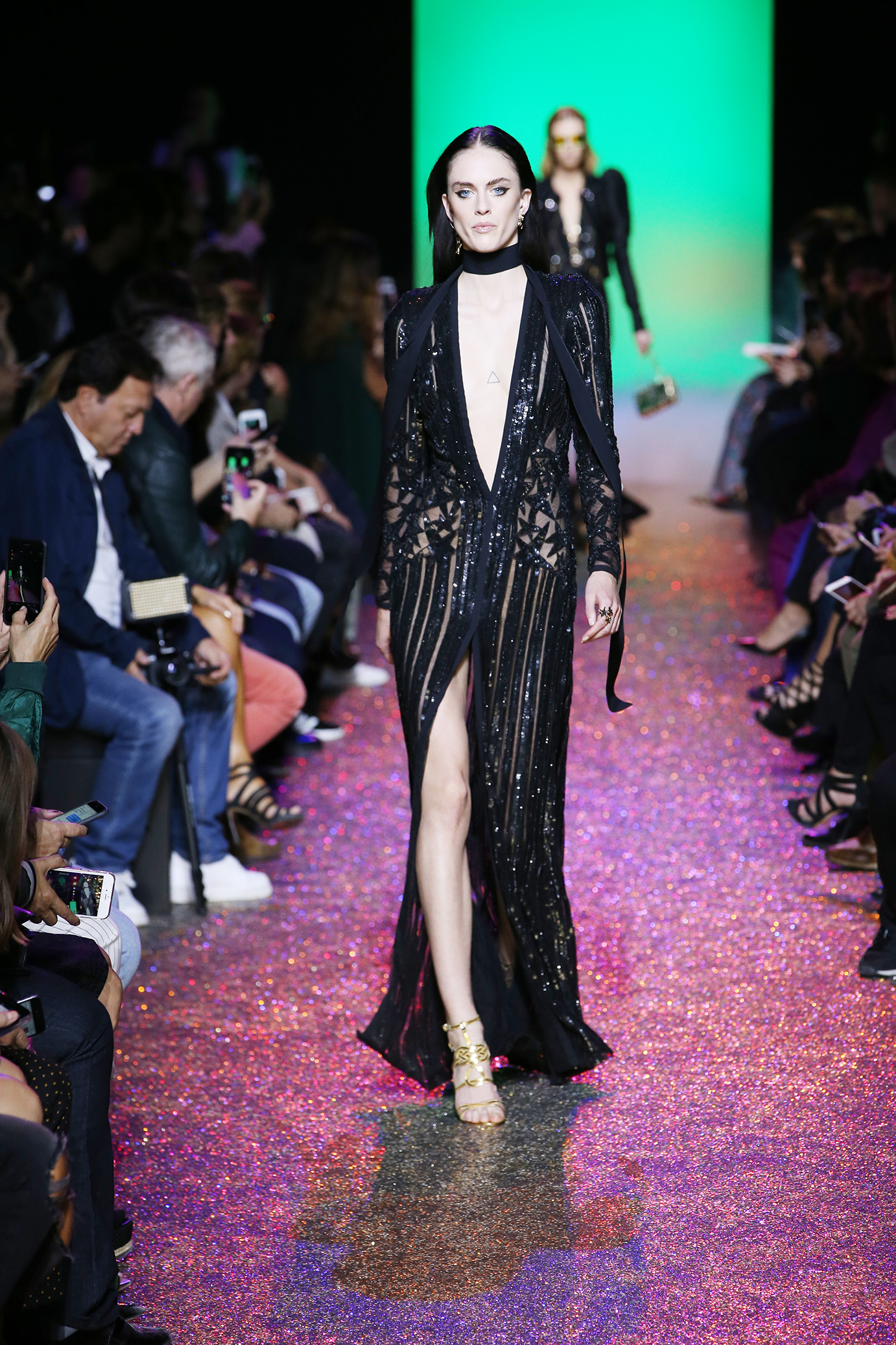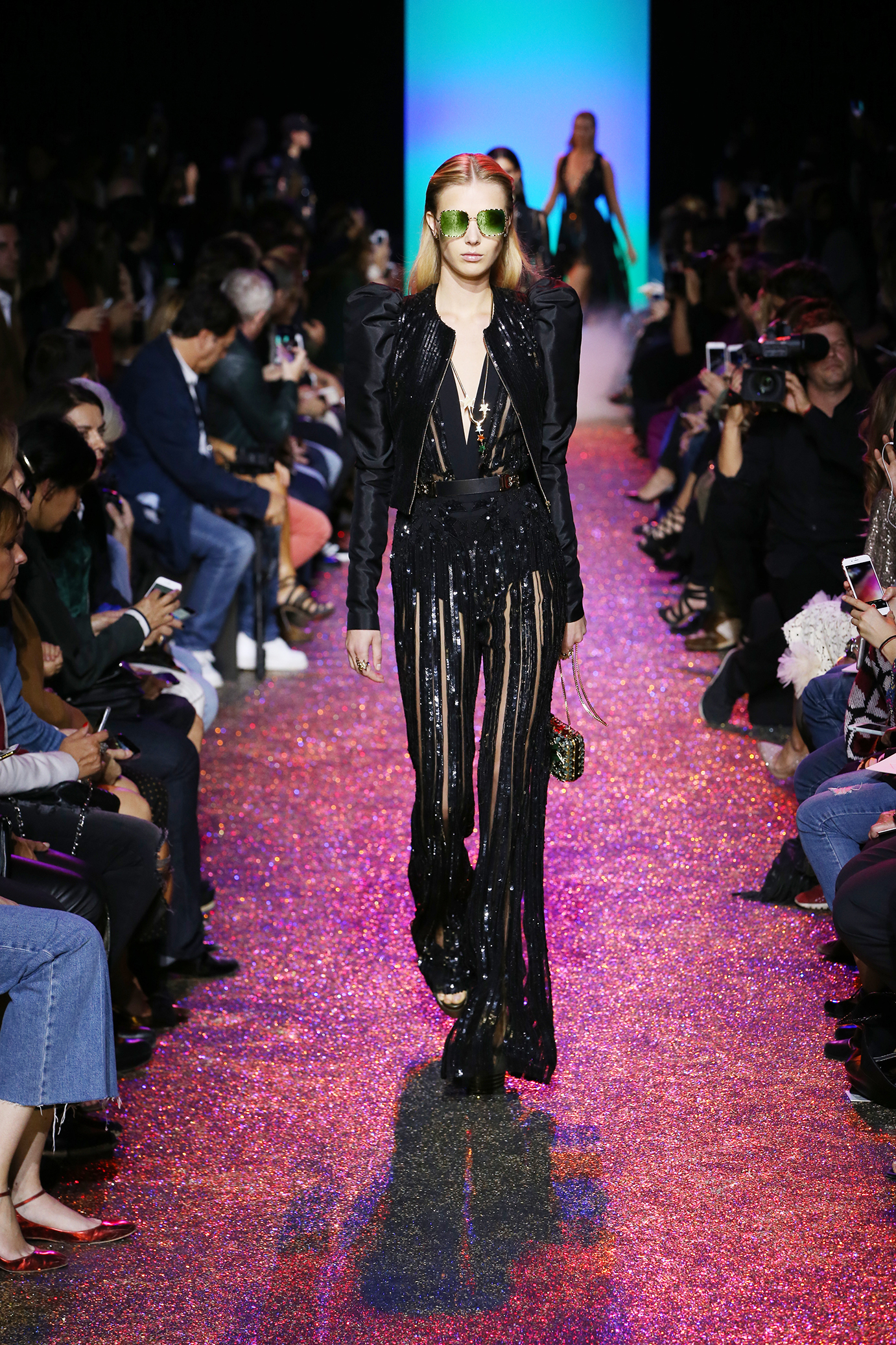 Les combinaisons pantalon ou short, signatures de la Maison, flirtent avec des pièces en cuir à œillets et des robes dont les décolletés plongeants et les fentes hautes libèrent les mouvements du corps.