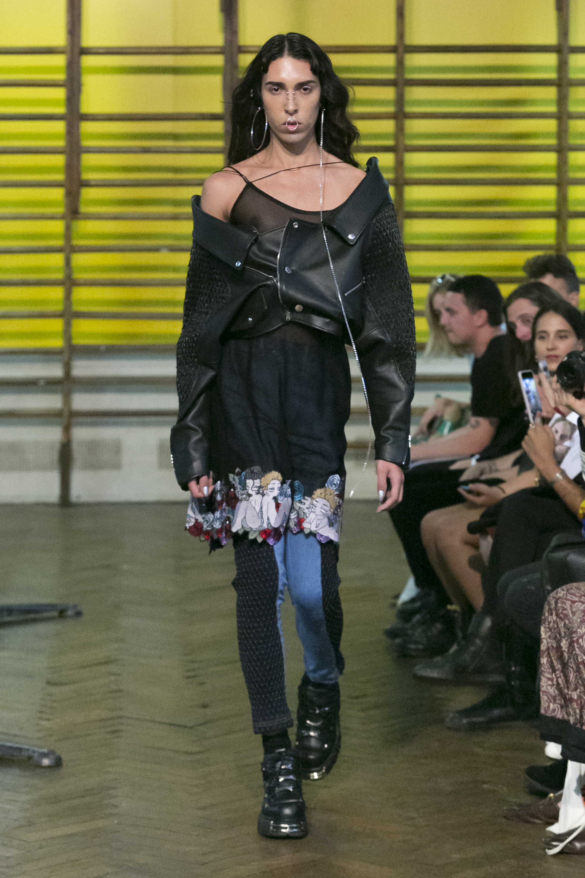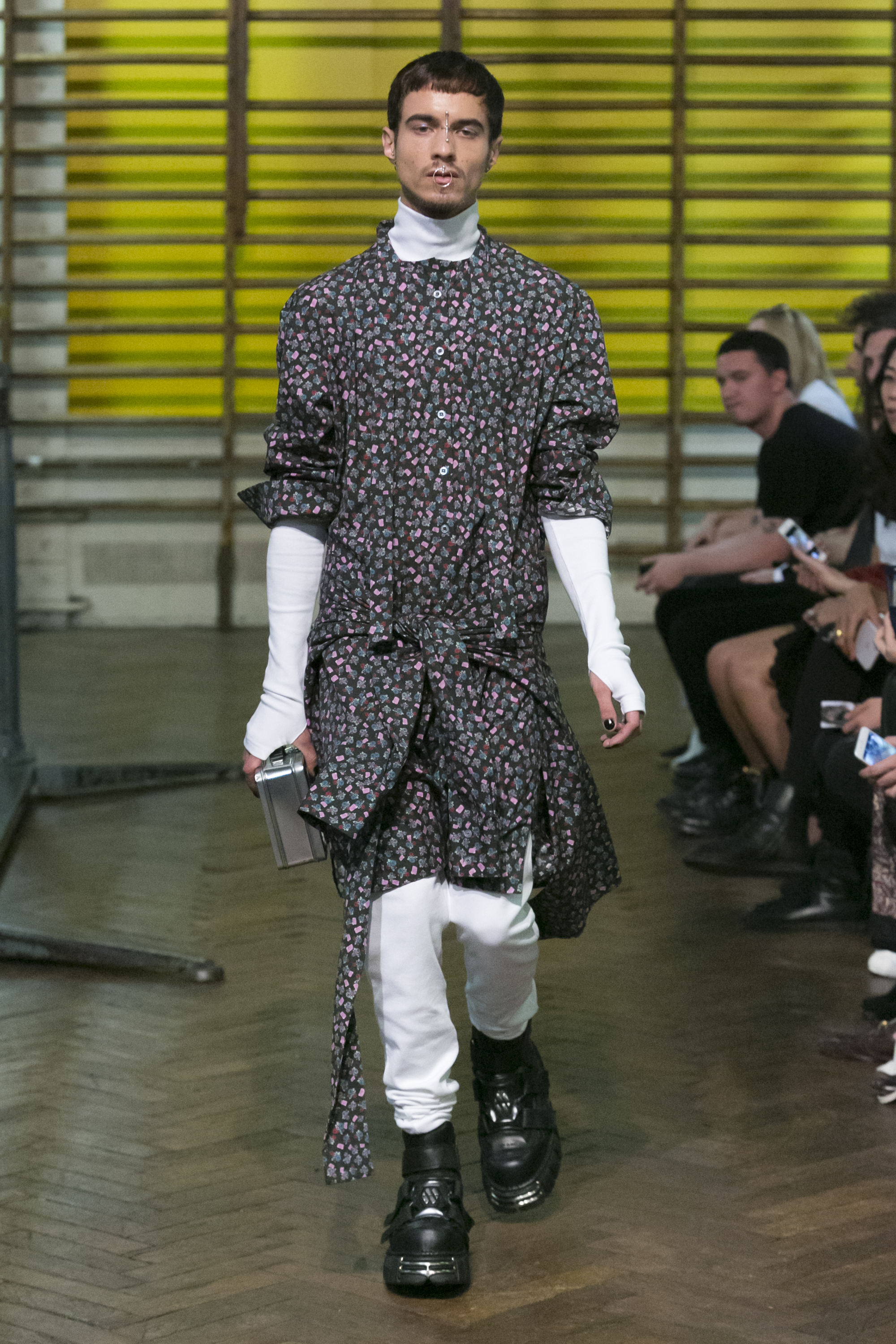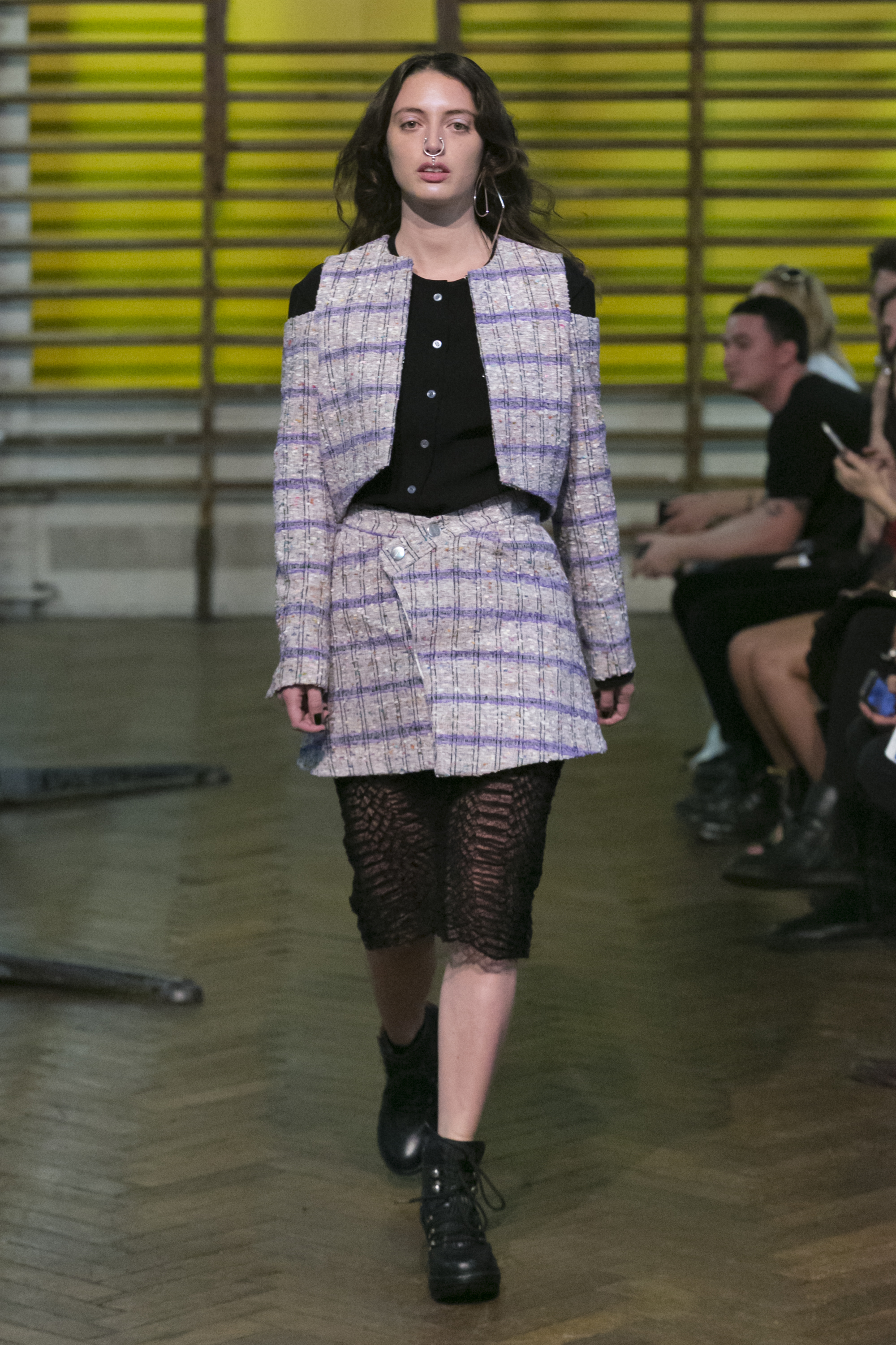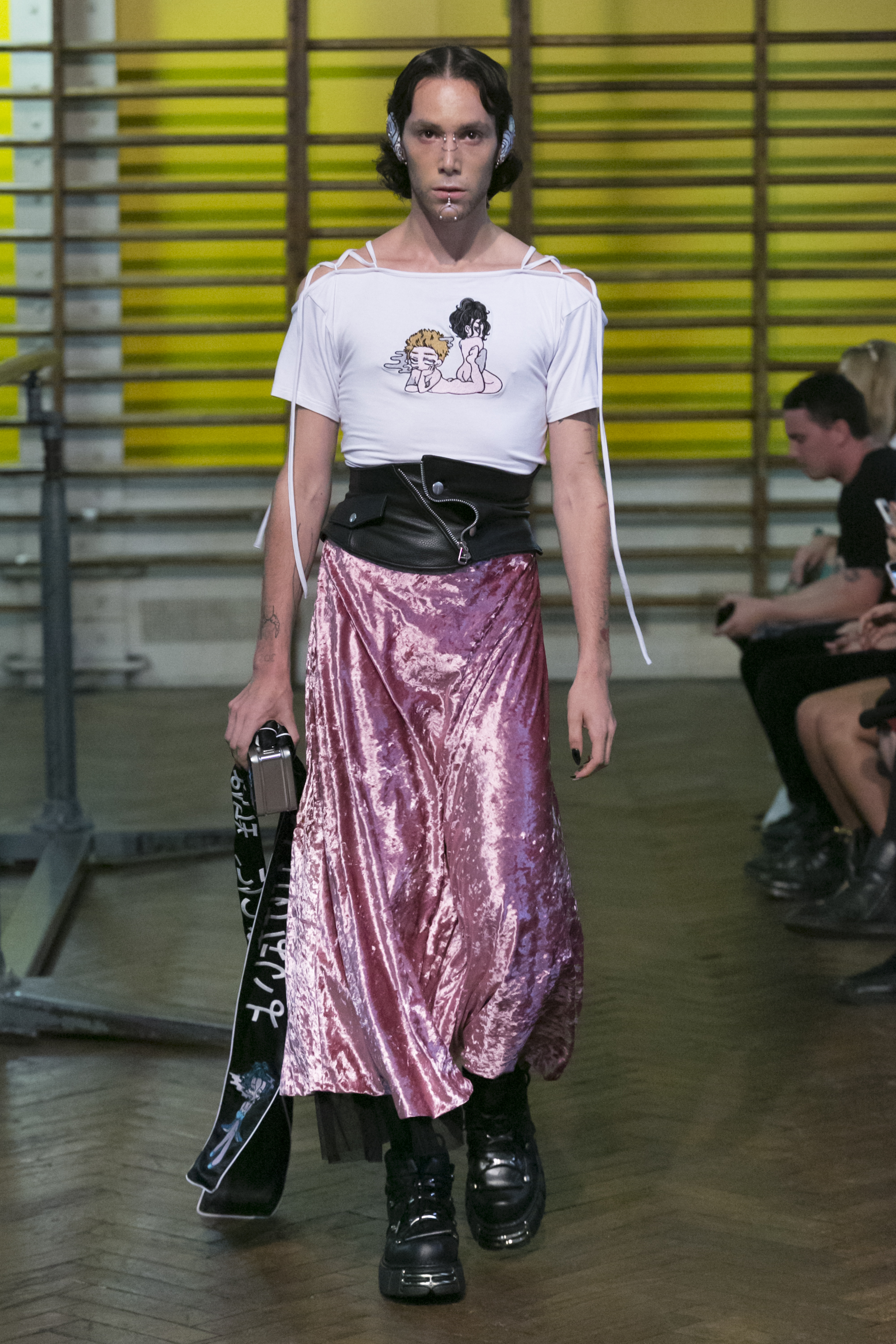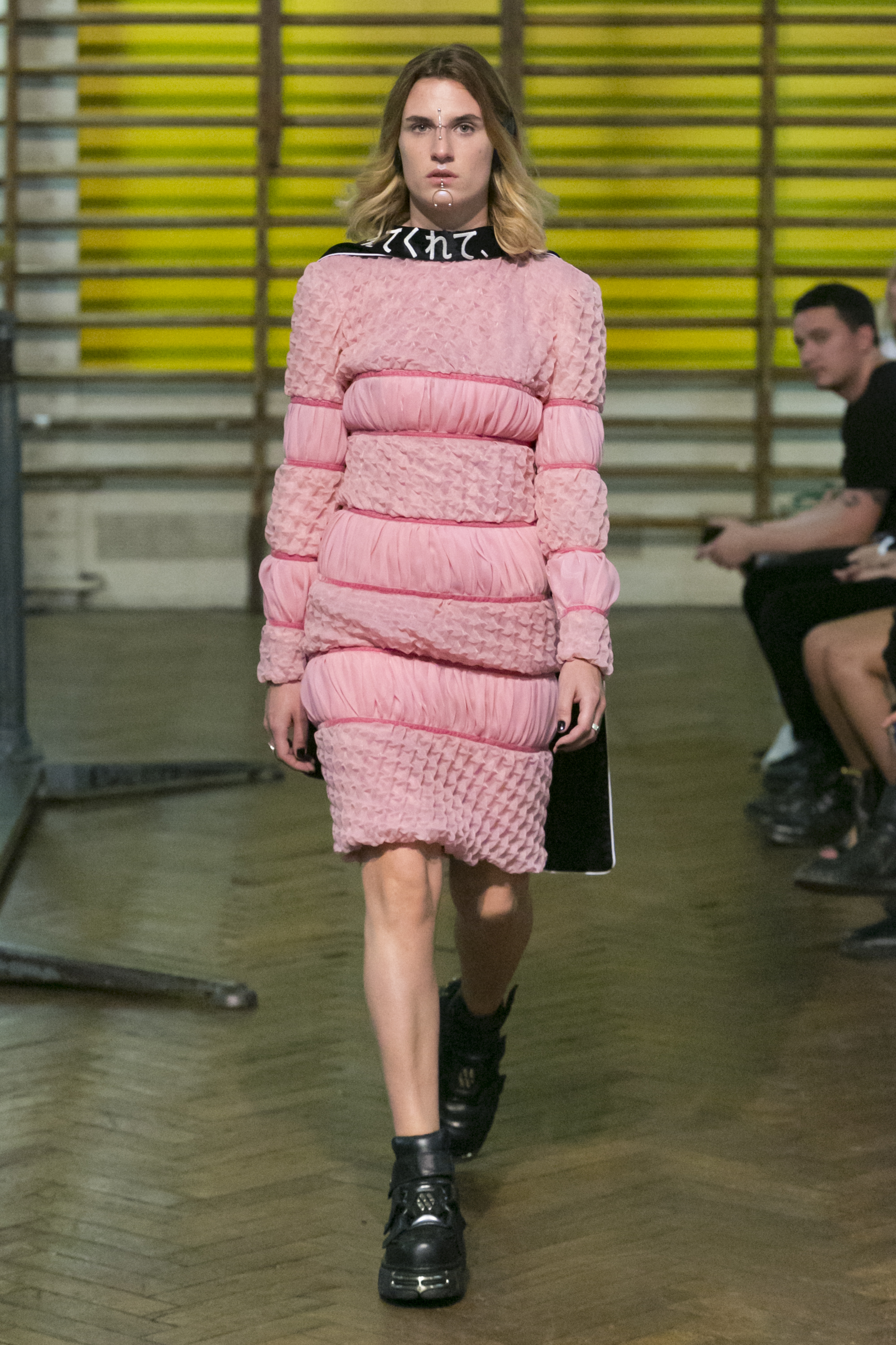 Une collection sous le signe du millénaire et de la culture, de l’avatar et des débuts d’internet. Inspirés d’artistes tel que Ben Elliot et Markus Schinwald et du film Fight Club qui a marqué la génération. Top destructurés, perfectos, robes classiques de la maison sont présentes combinés à des jacquard et des tweeds réalisées en colaboration avec l’artiste manga HIZGI avec des personnages pleins de luxure. Tout un programme.
