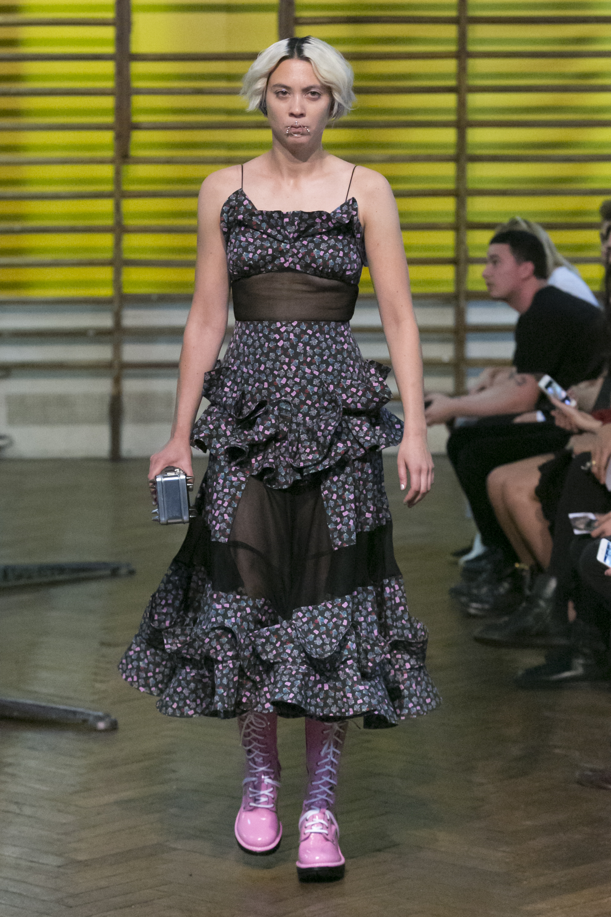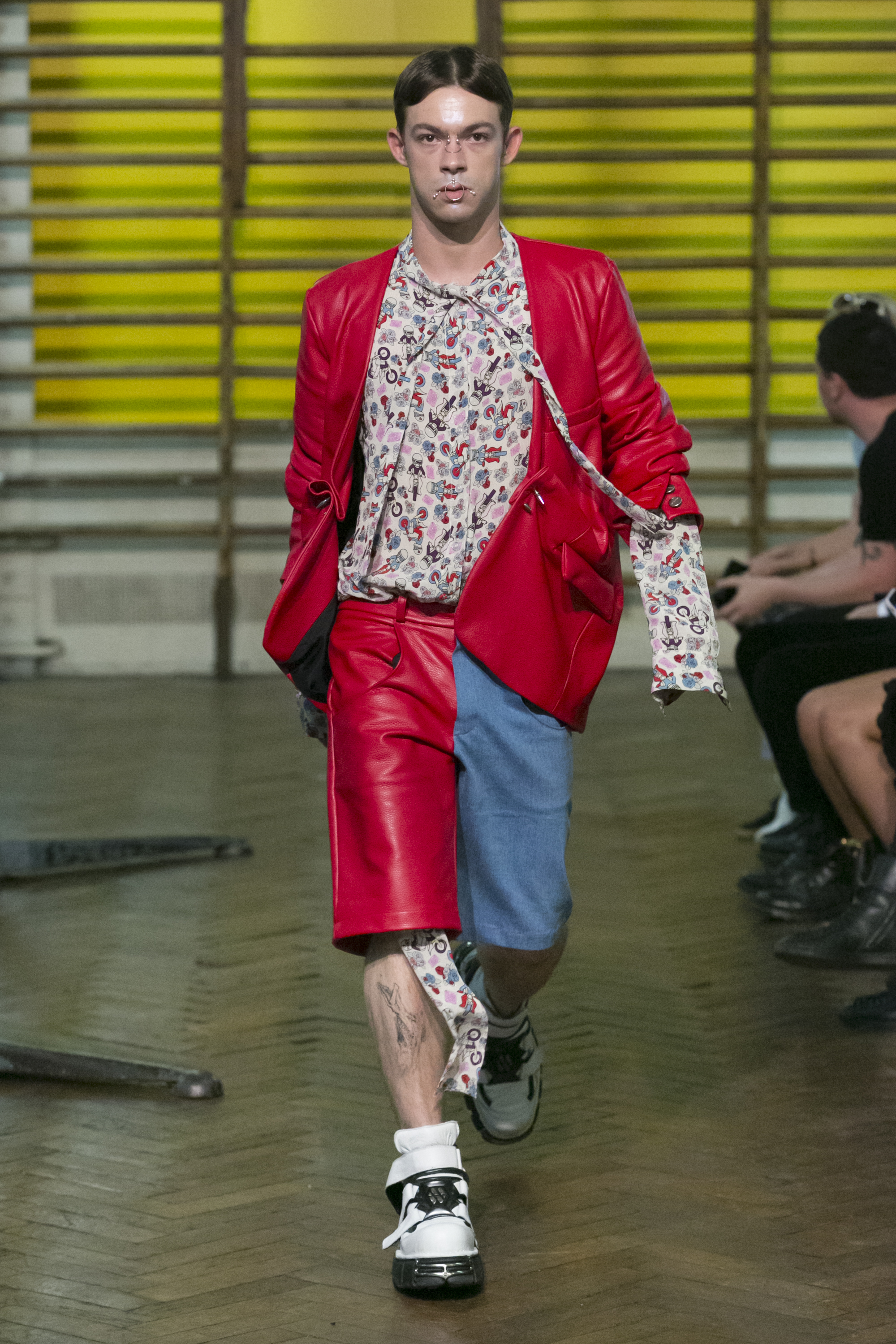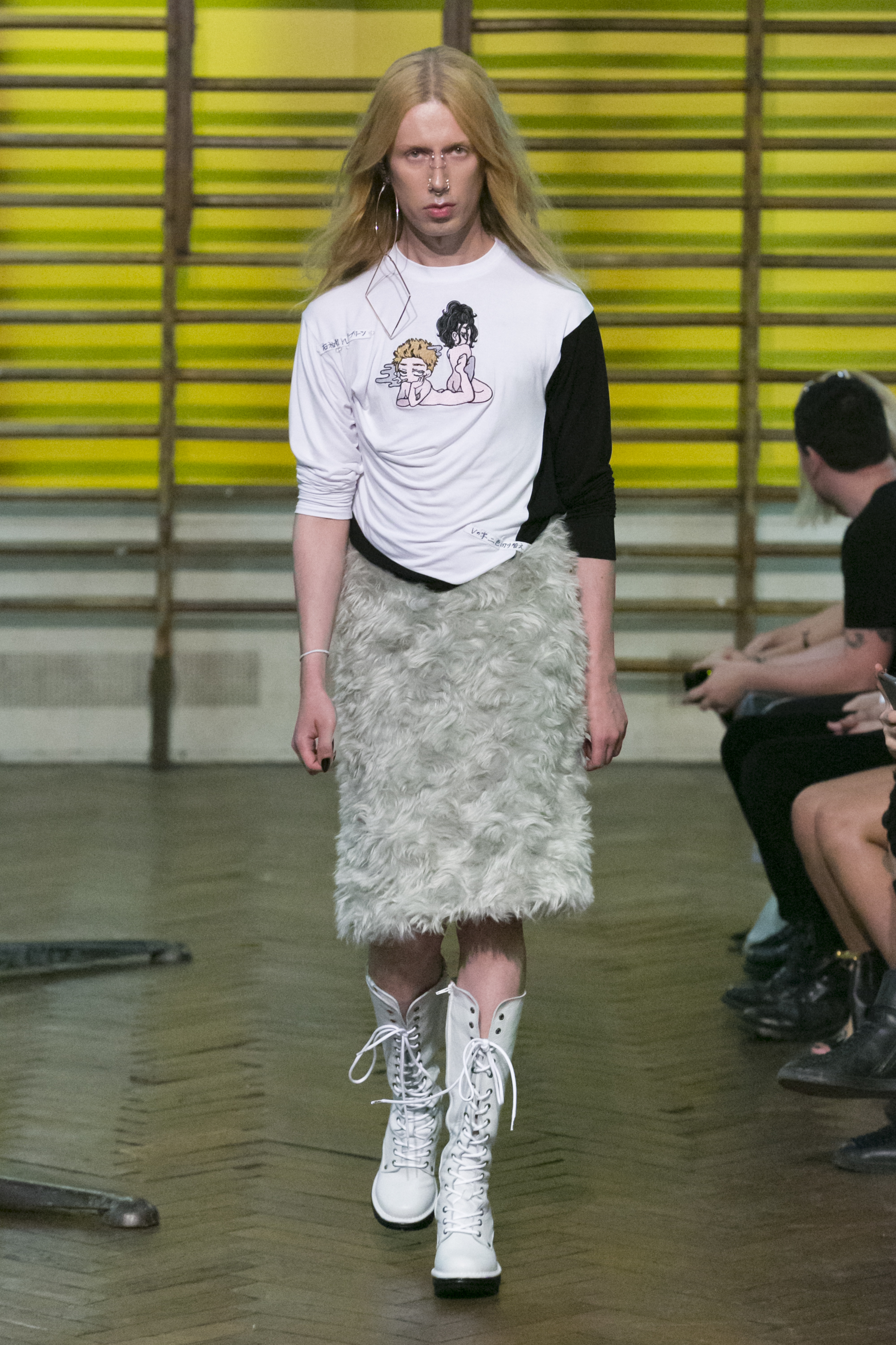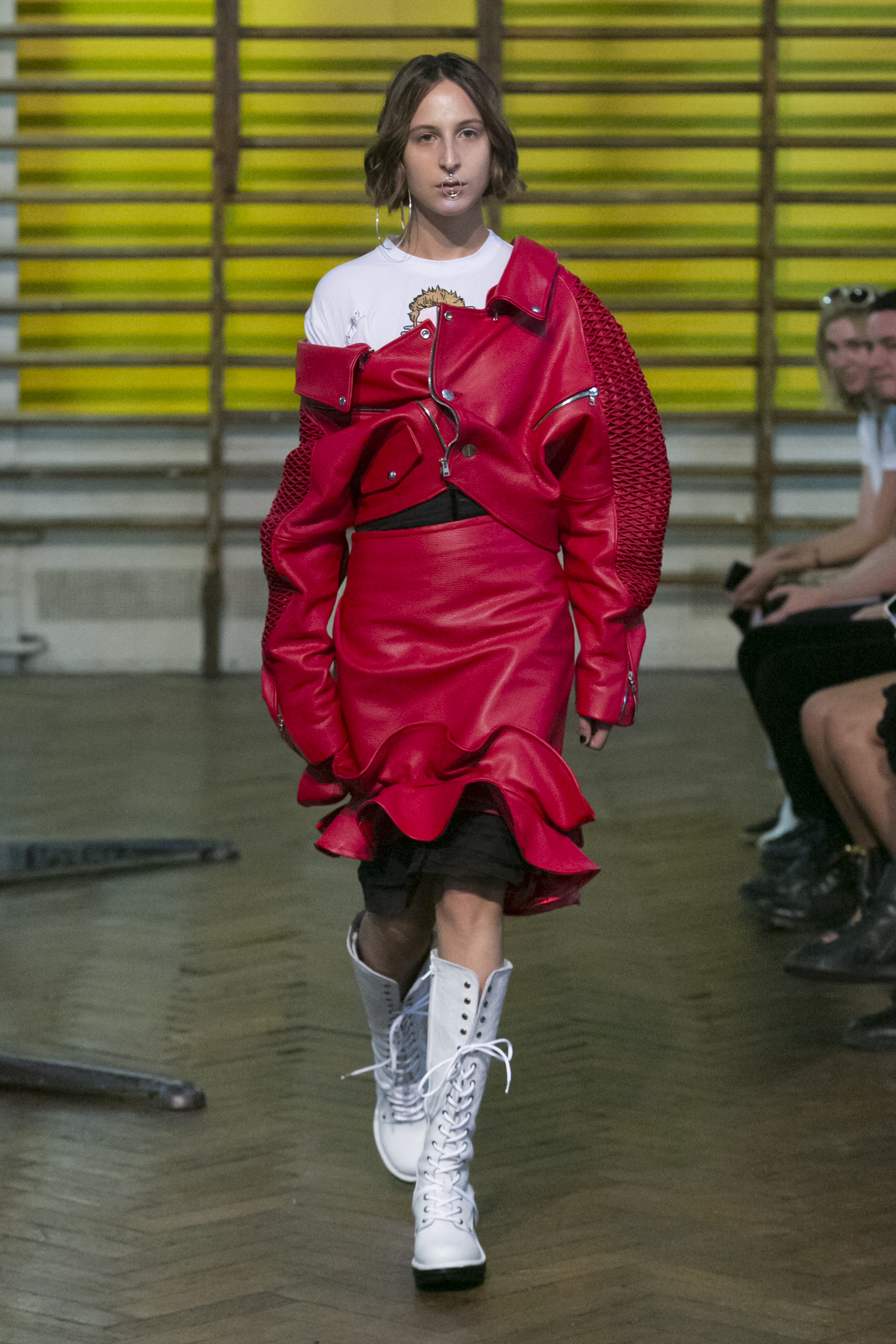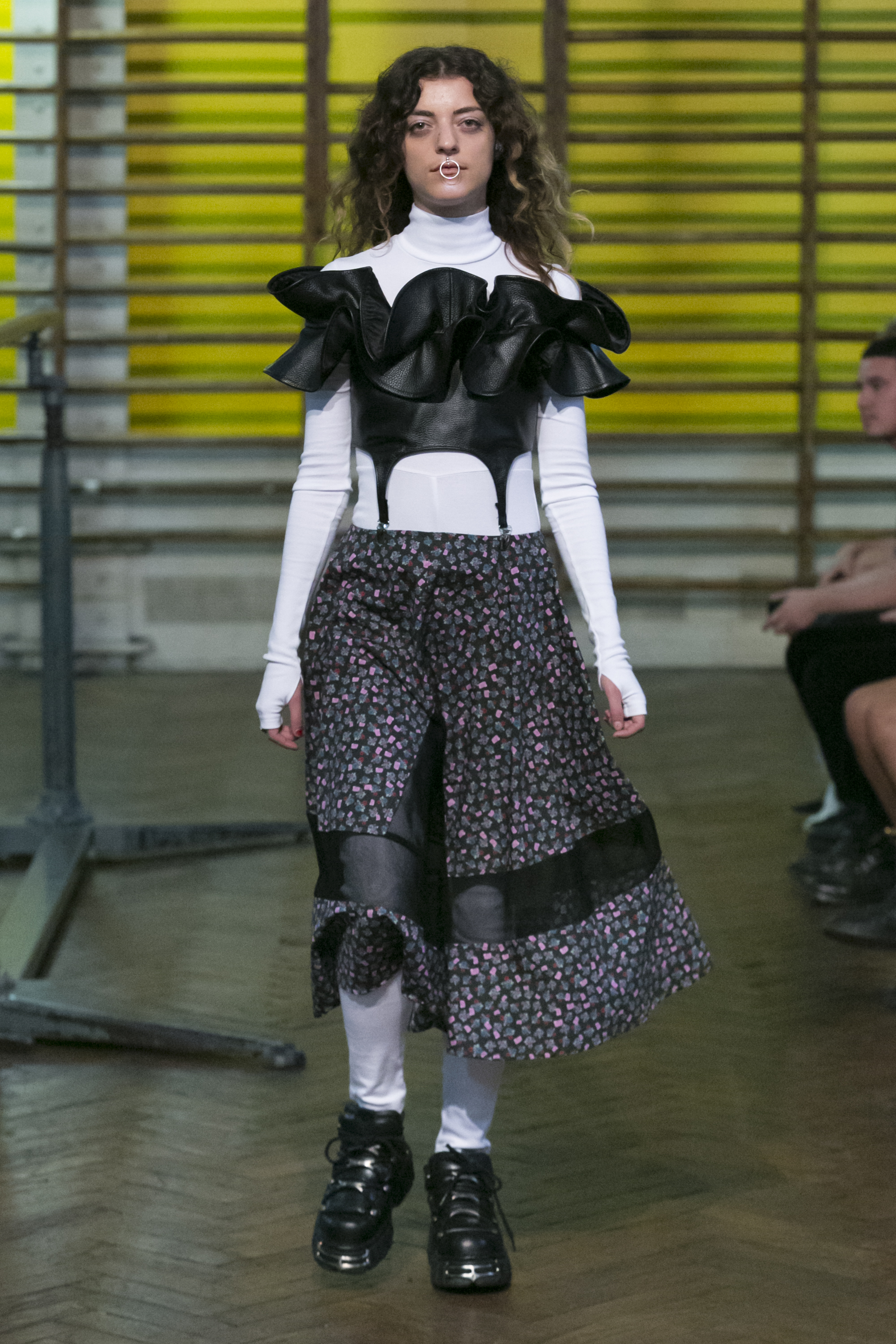 Une collection sous le signe du millénaire et de la culture, de l’avatar et des débuts d’internet. Inspirés d’artistes tel que Ben Elliot et Markus Schinwald et du film Fight Club qui a marqué la génération. Top destructurés, perfectos, robes classiques de la maison sont présentes combinés à des jacquard et des tweeds réalisées en colaboration avec l’artiste manga HIZGI avec des personnages pleins de luxure. Tout un programme.