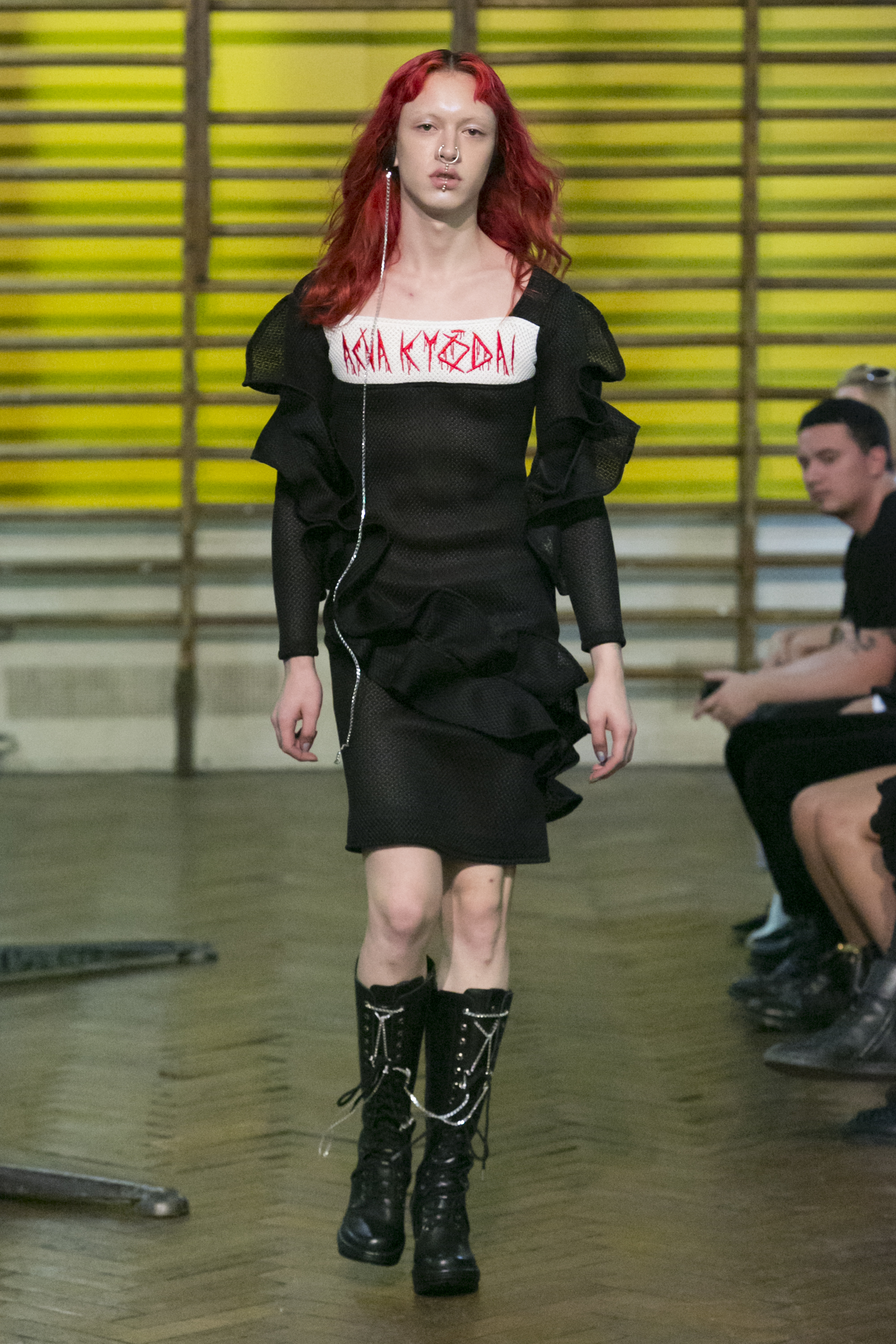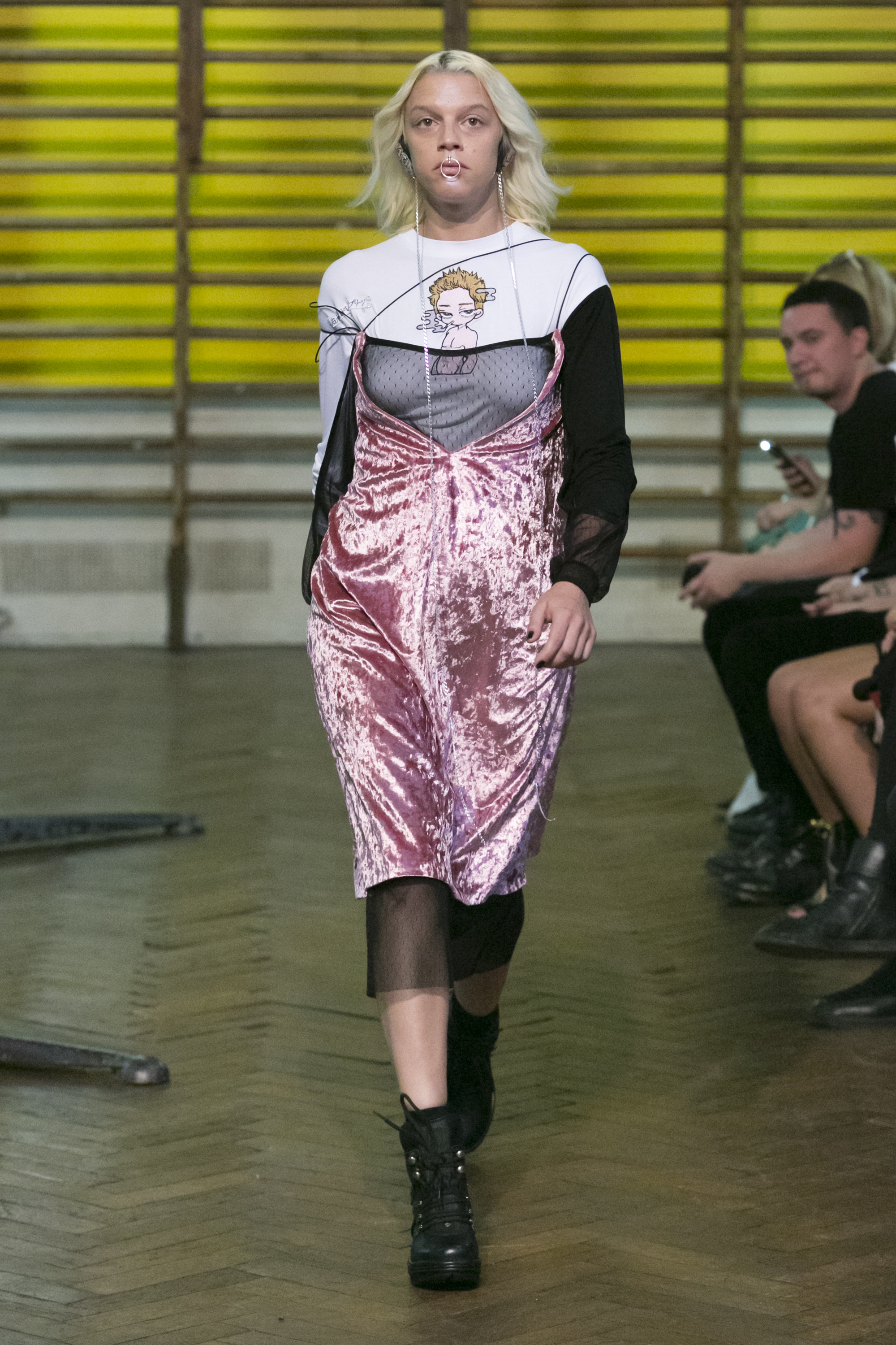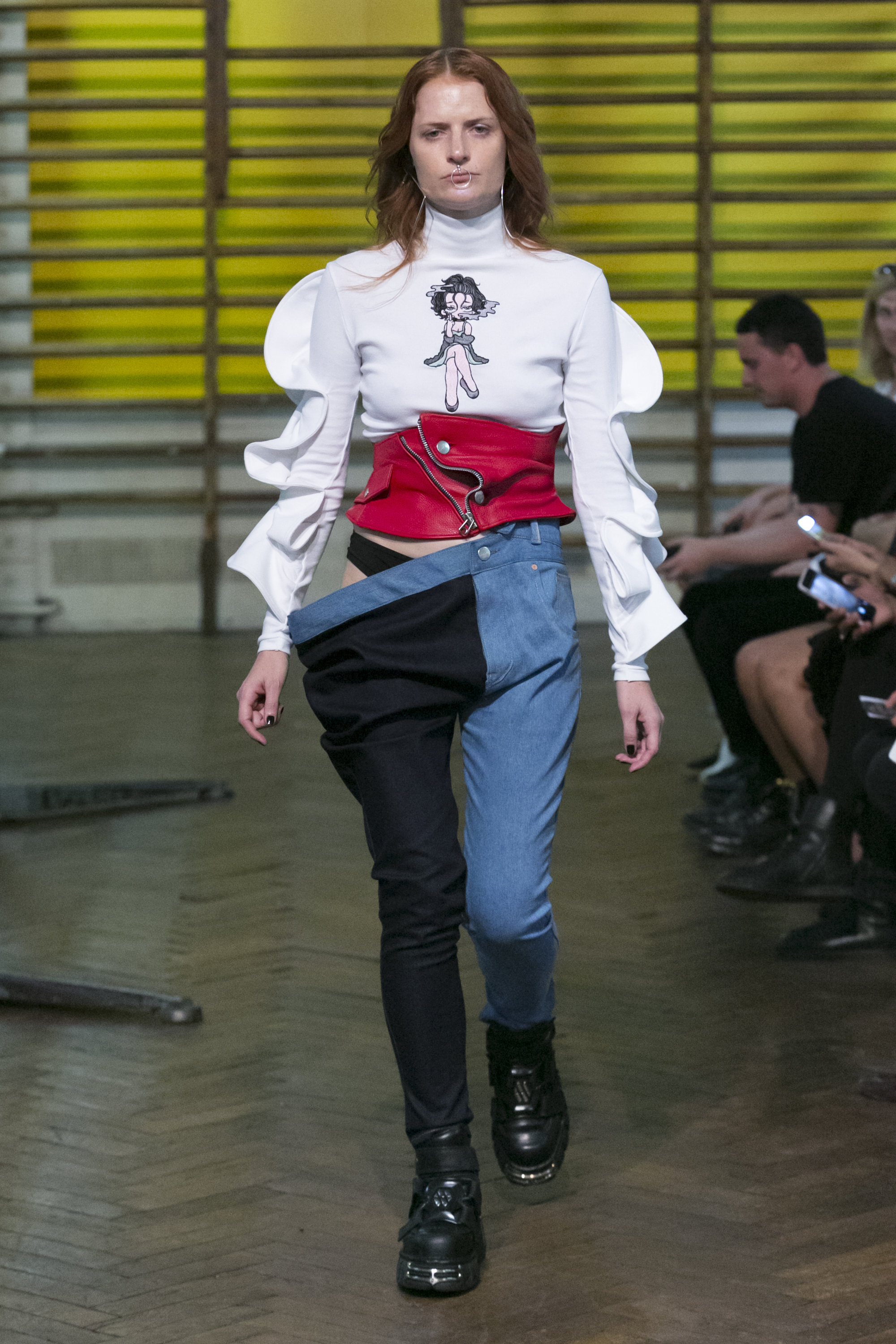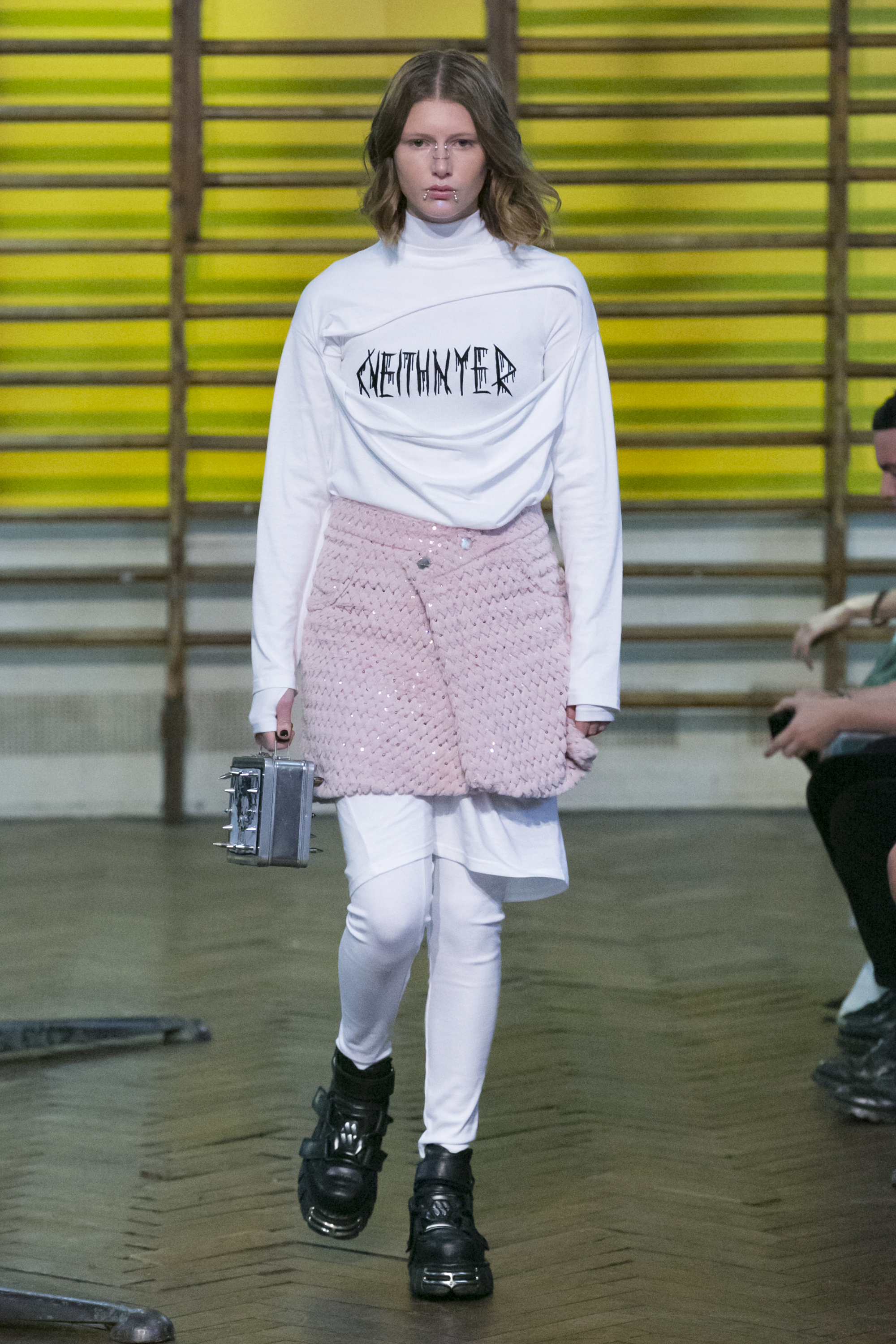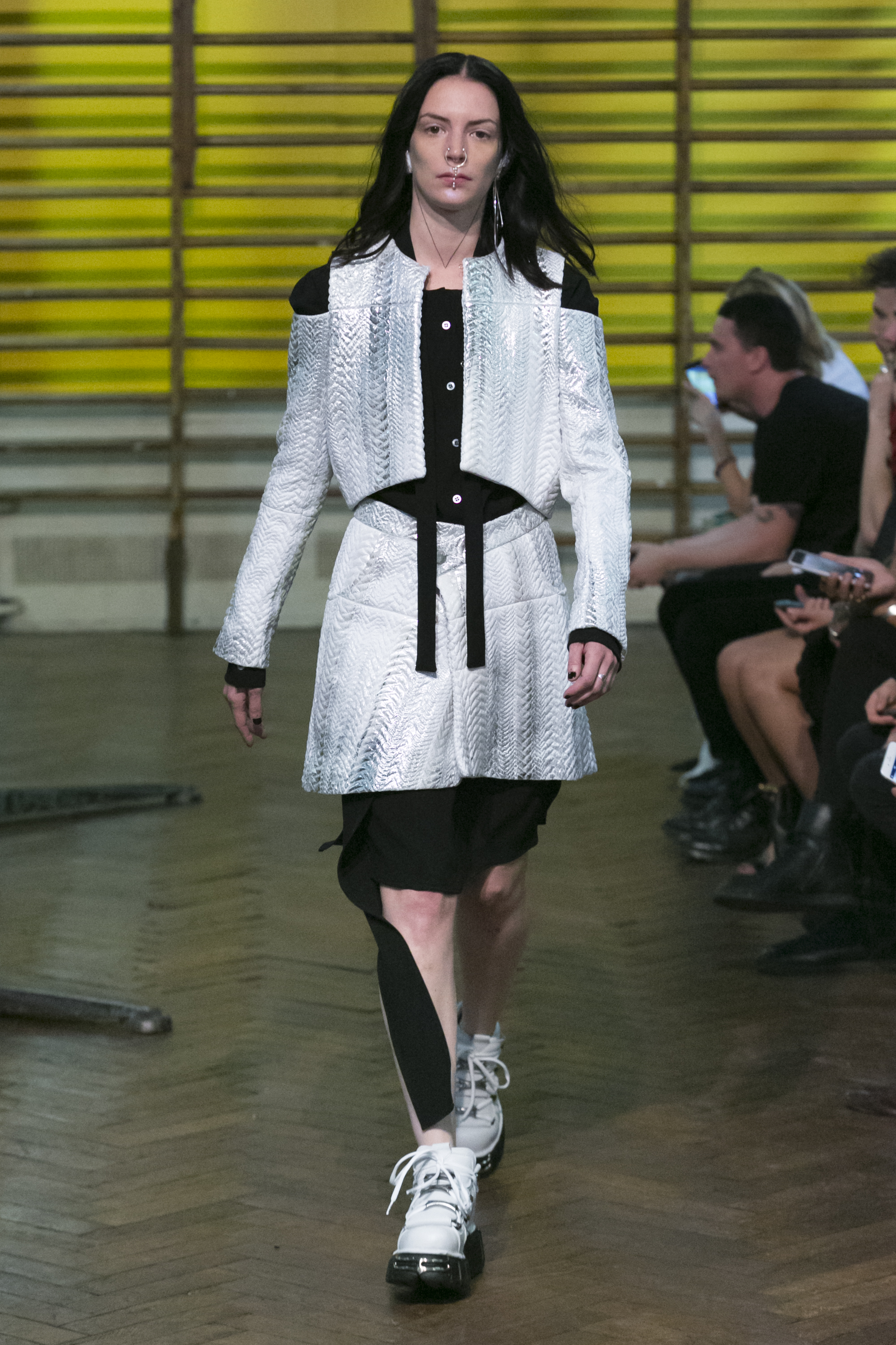 Une collection sous le signe du millénaire et de la culture, de l’avatar et des débuts d’internet. Inspirés d’artistes tel que Ben Elliot et Markus Schinwald et du film Fight Club qui a marqué la génération. Top destructurés, perfectos, robes classiques de la maison sont présentes combinés à des jacquard et des tweeds réalisées en colaboration avec l’artiste manga HIZGI avec des personnages pleins de luxure. Tout un programme.