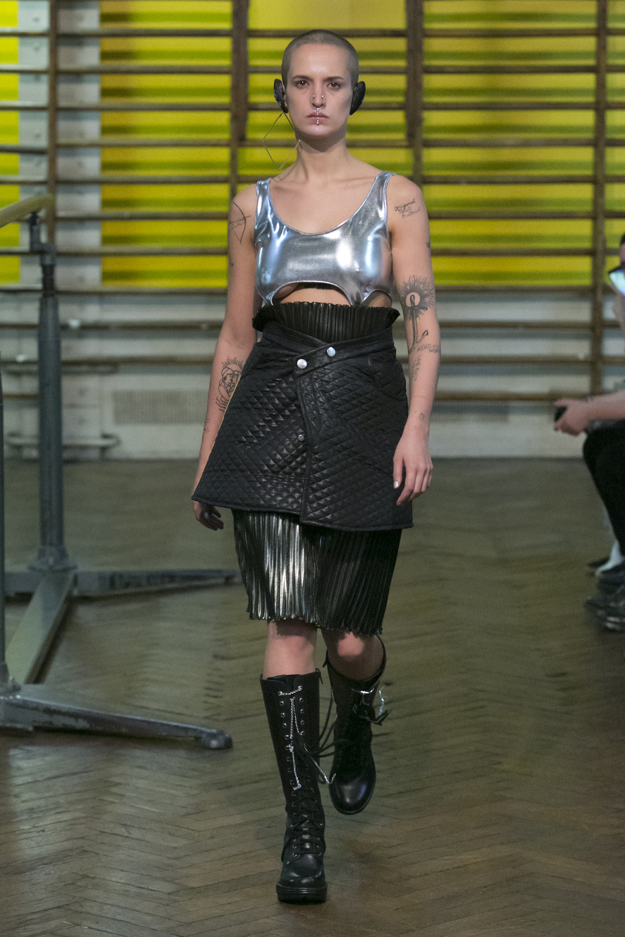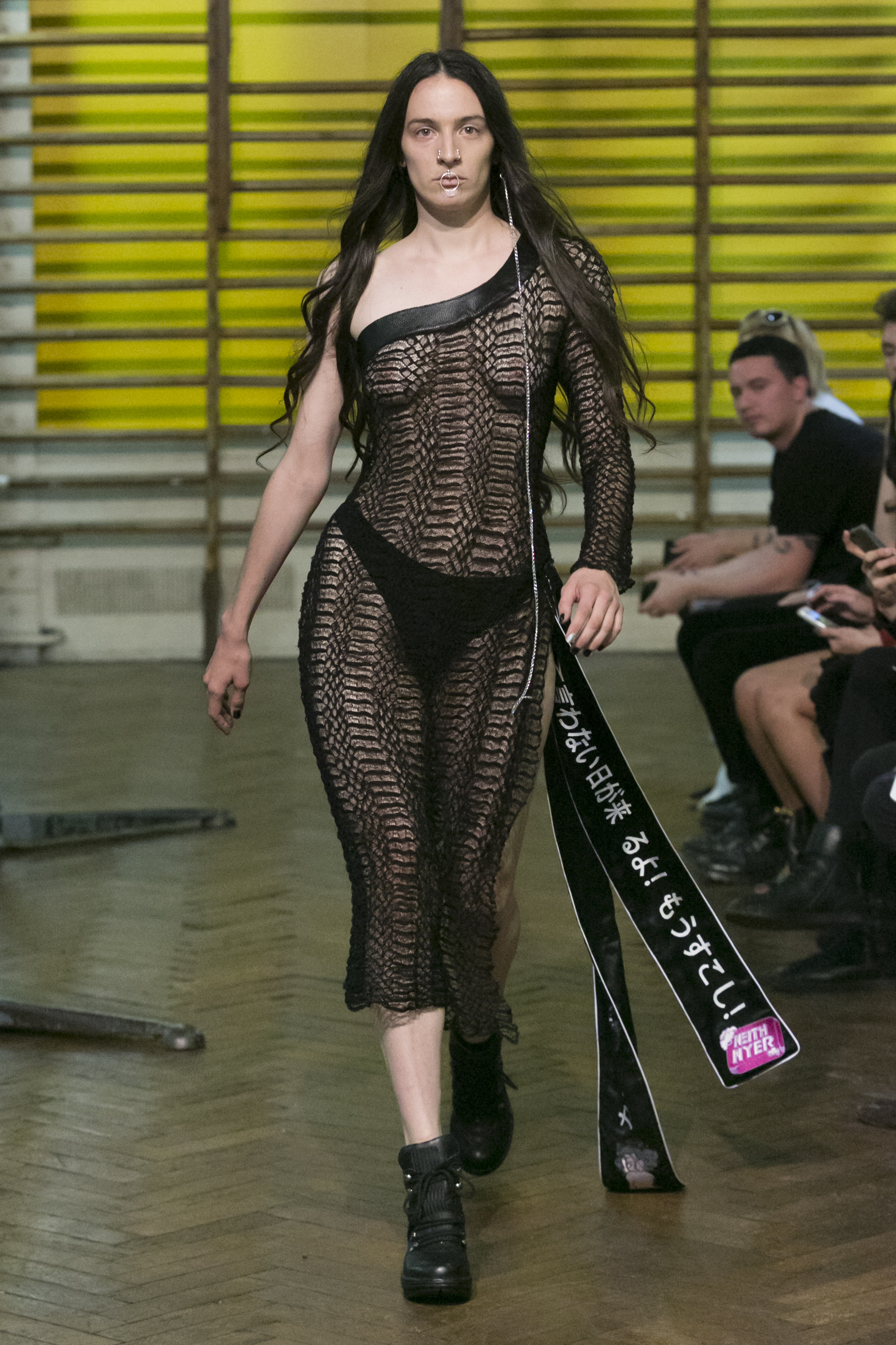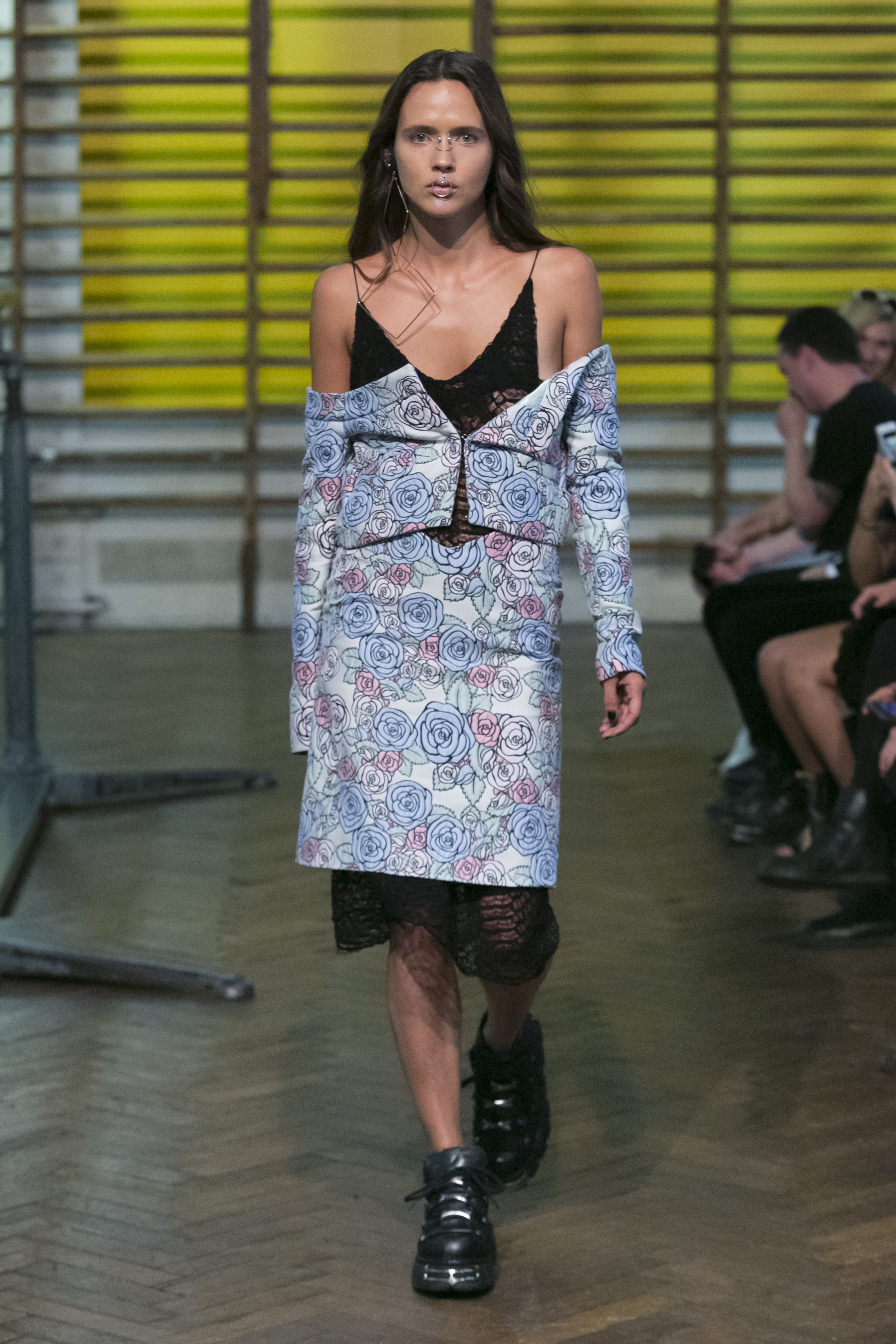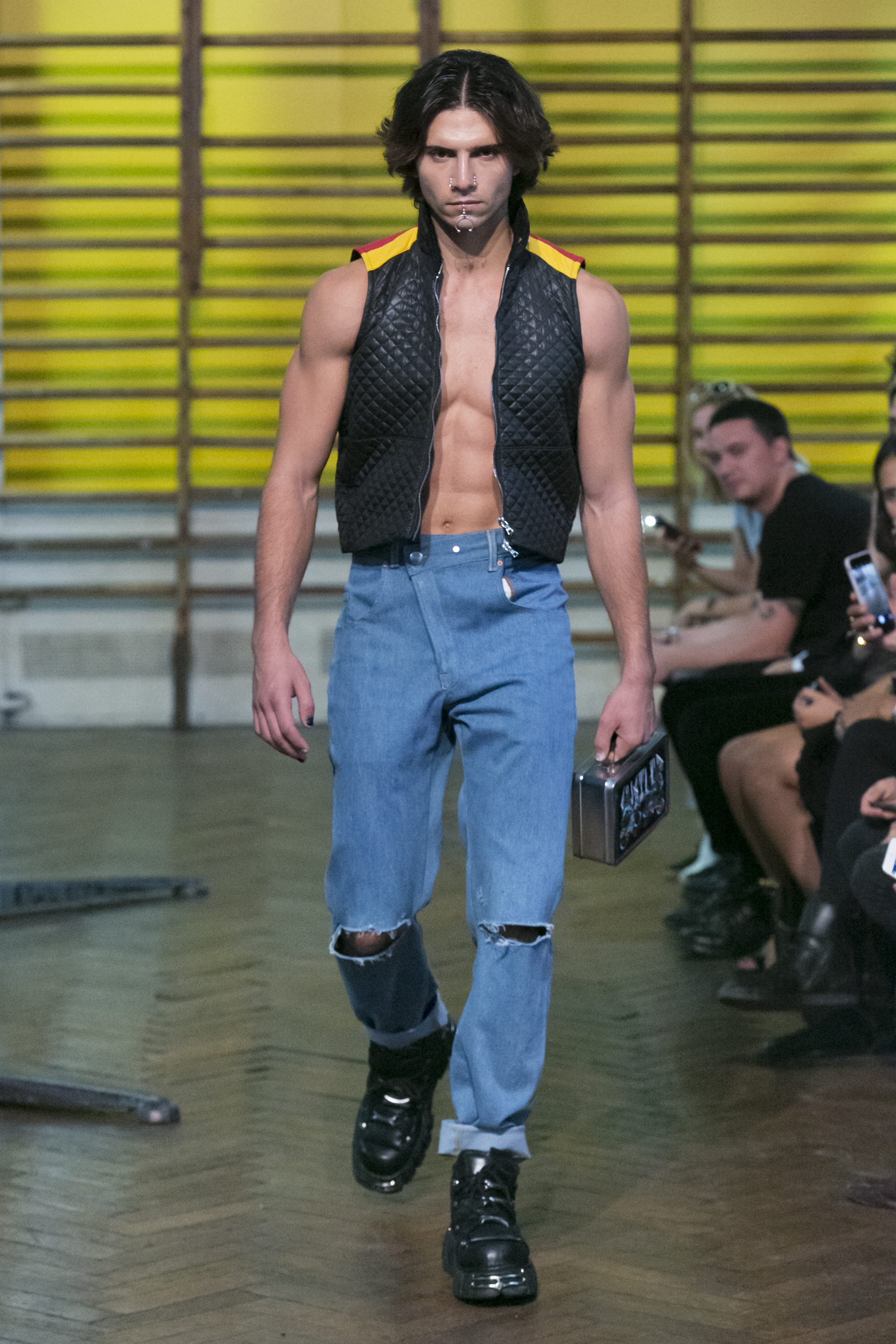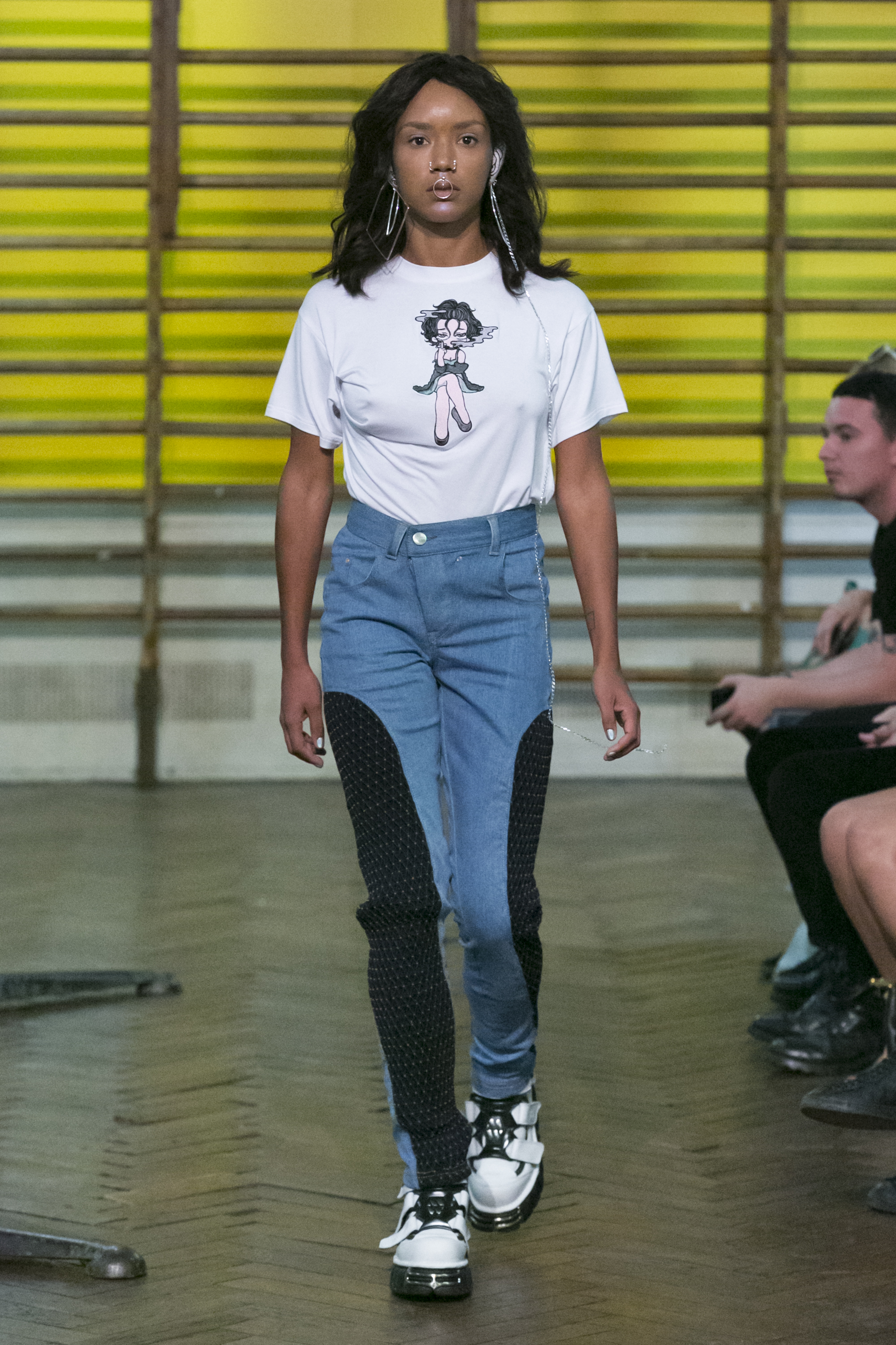 Une collection sous le signe du millénaire et de la culture, de l’avatar et des débuts d’internet. Inspirés d’artistes tel que Ben Elliot et Markus Schinwald et du film Fight Club qui a marqué la génération. Top destructurés, perfectos, robes classiques de la maison sont présentes combinés à des jacquard et des tweeds réalisées en colaboration avec l’artiste manga HIZGI avec des personnages pleins de luxure. Tout un programme.