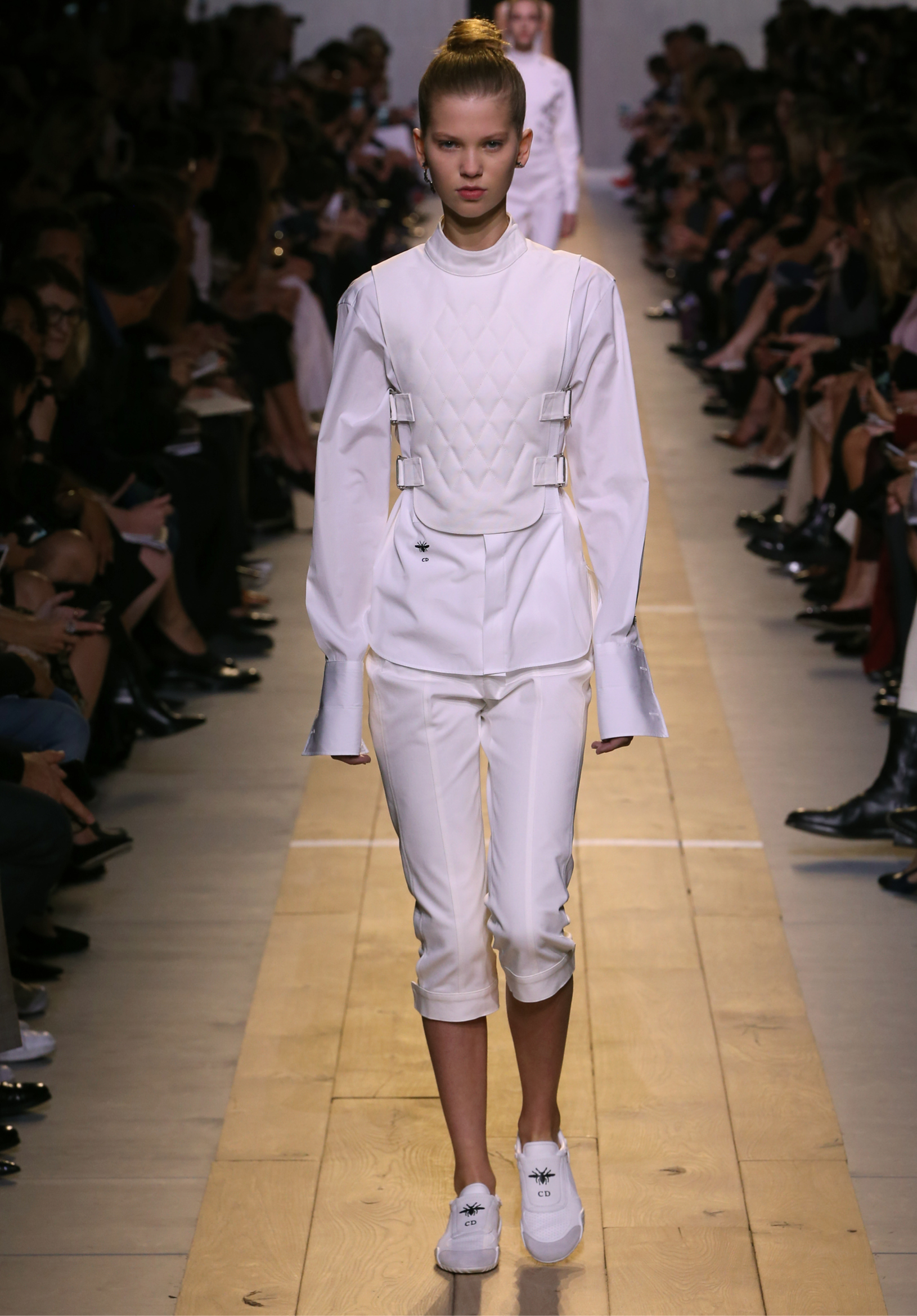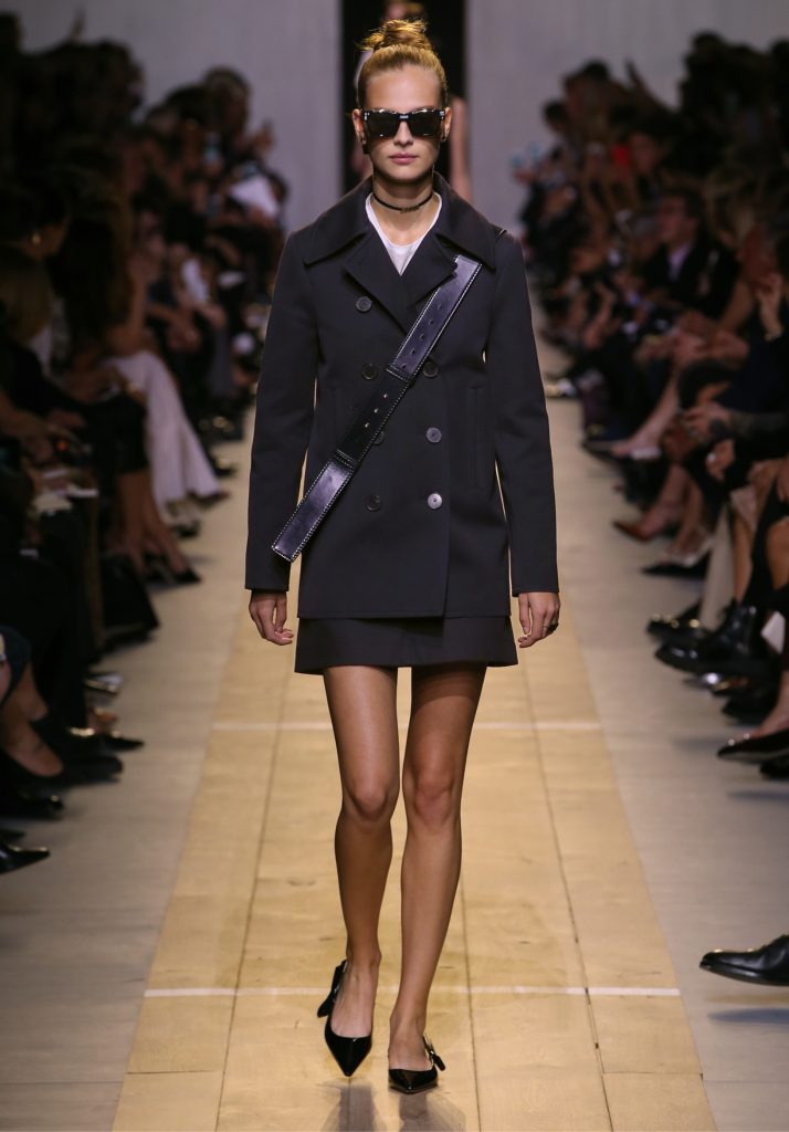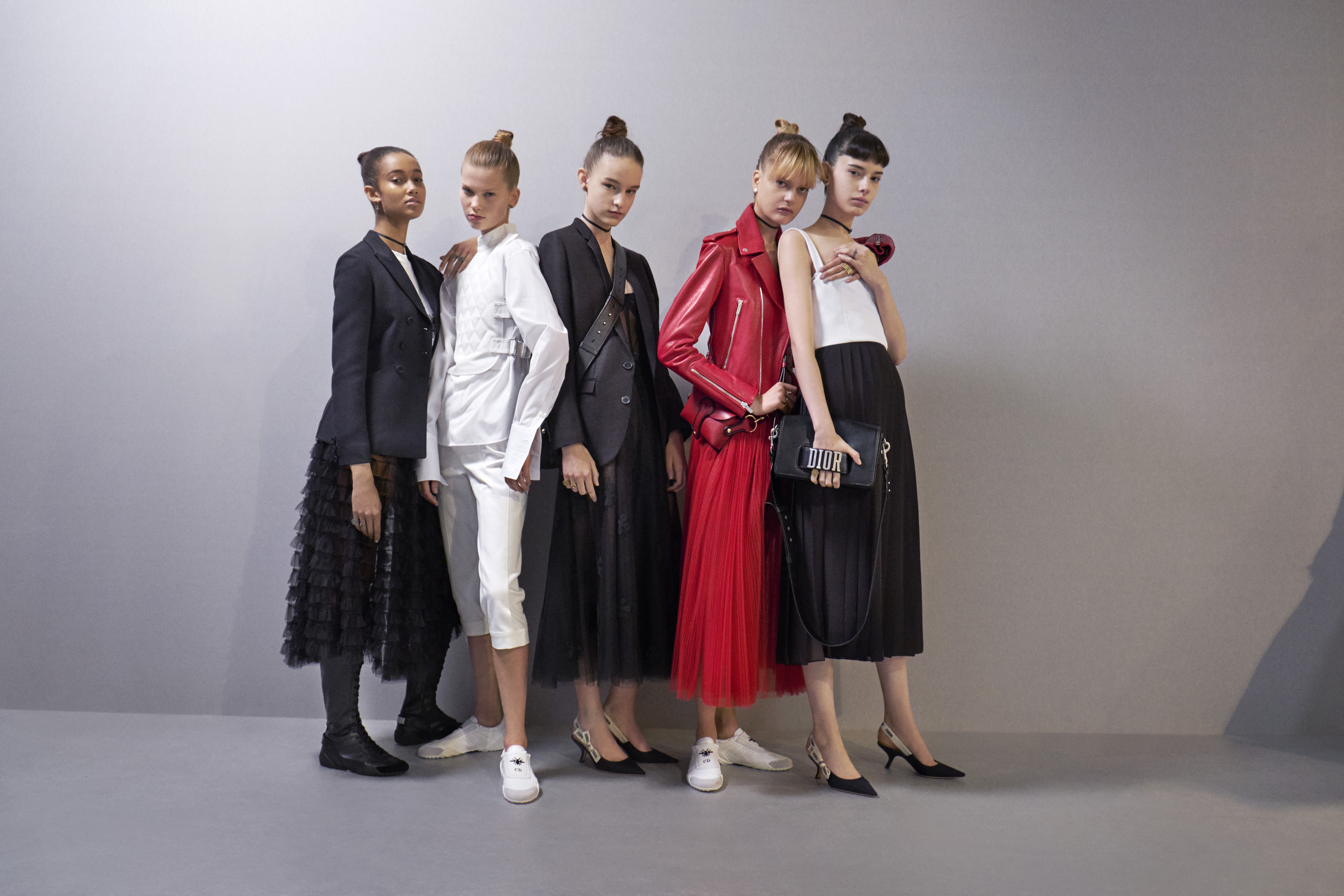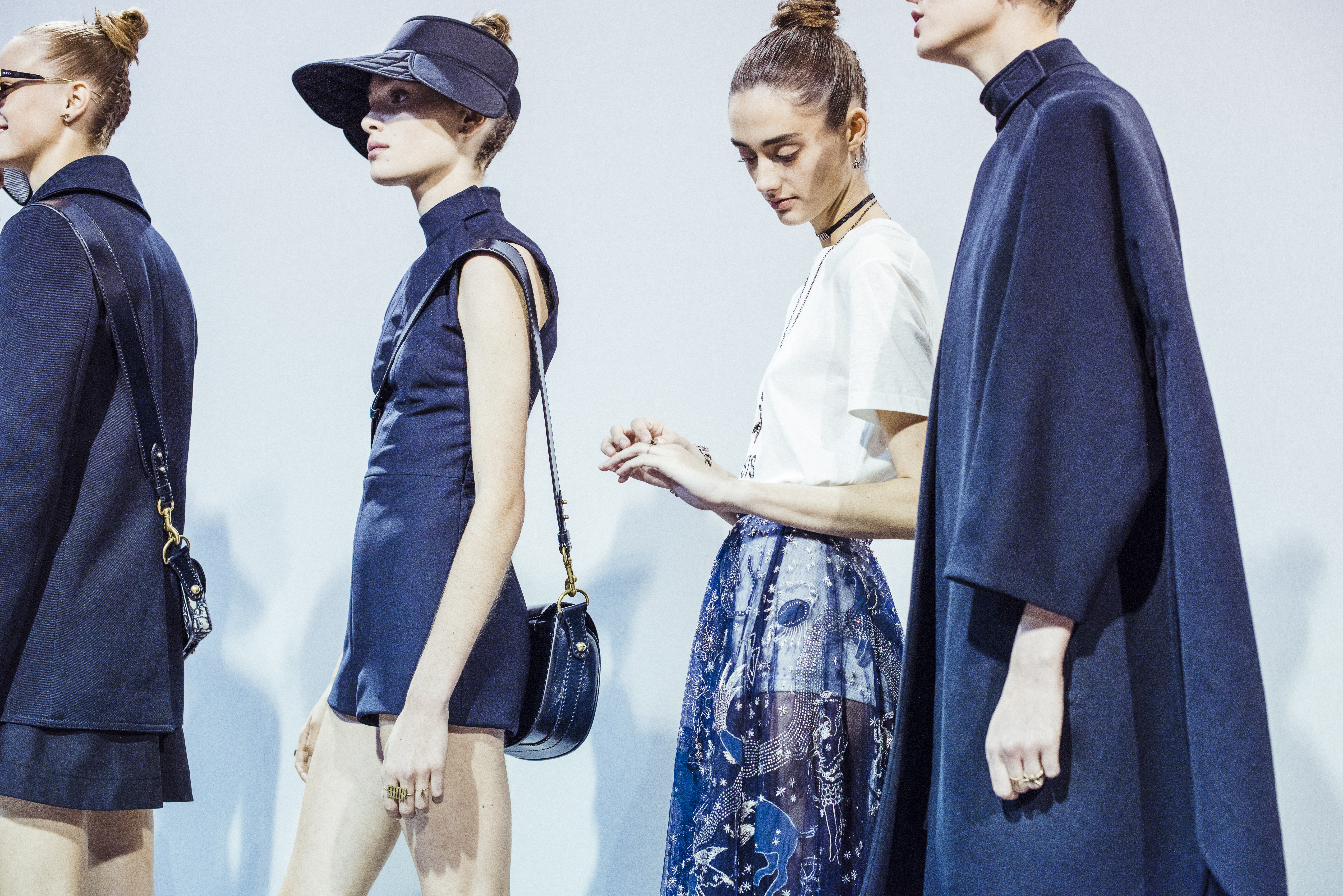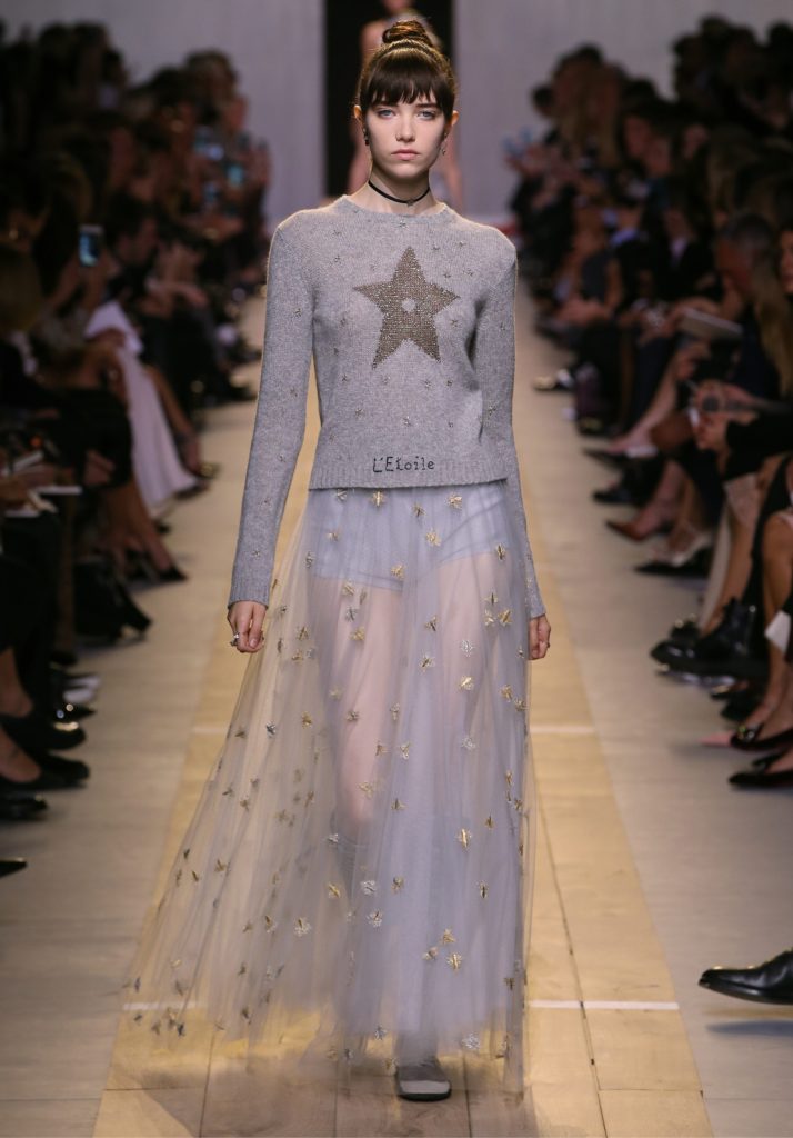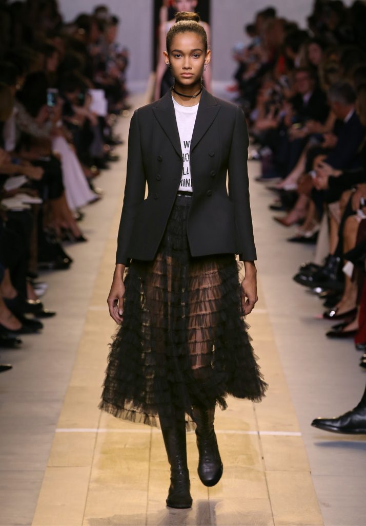 Maria Grazia Chiuri est la première femme à diriger la création de la Maison Dior ; son regard féminin audacieux – féministe est un mot récurrent chez elle – explore les règles de la beauté moderne pour les transposer dans une collection régie par cette tension sensuelle qui règne entre le corps et le vêtement. Le New Look de Christian Dior défiait la modernité et la rigueur de la tenue, en redonnant à la femme les courbes et le raffinement que la guerre avait effacés, une mode résolument nouvelle à cette époque. Maria Grazia Chiuri se confronte à la tradition de la maison Dior et replace ainsi la femme au centre, en bousculant les attentes et en remettant en cause ce qui est tenu pour acquis. Elle appelle à réfléchir aux formes d’une silhouette contemporaine, agile, olympienne, élitiste dans l’élégance sportive, tout en restant à la portée de chacune puisque l’uniforme est à la fois un élément unique et sériel. Il est un lieu où le corps s’exprime dans son individualité et où il peut partager en même temps avec les autres corps les règles du jeu et du paraître.