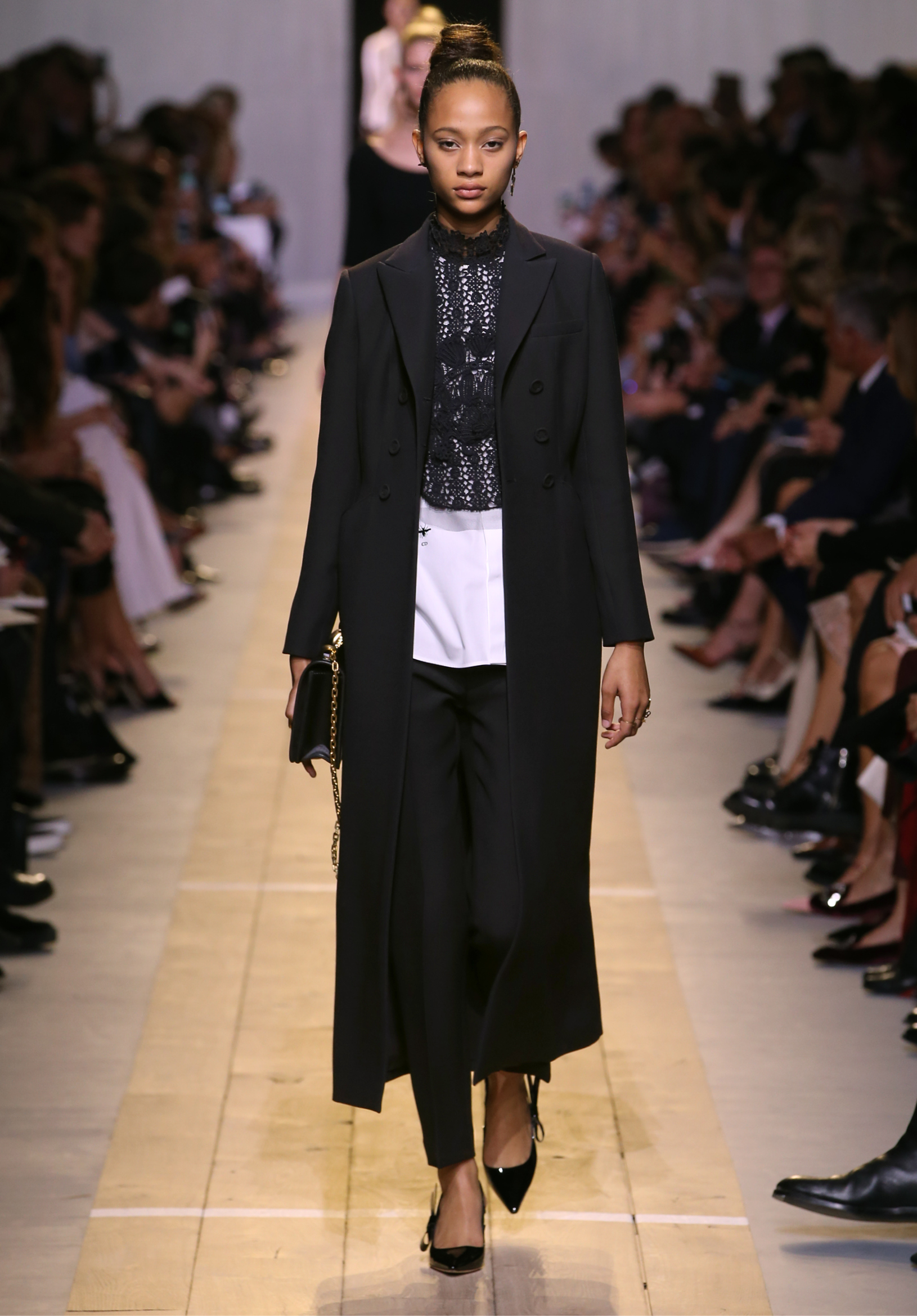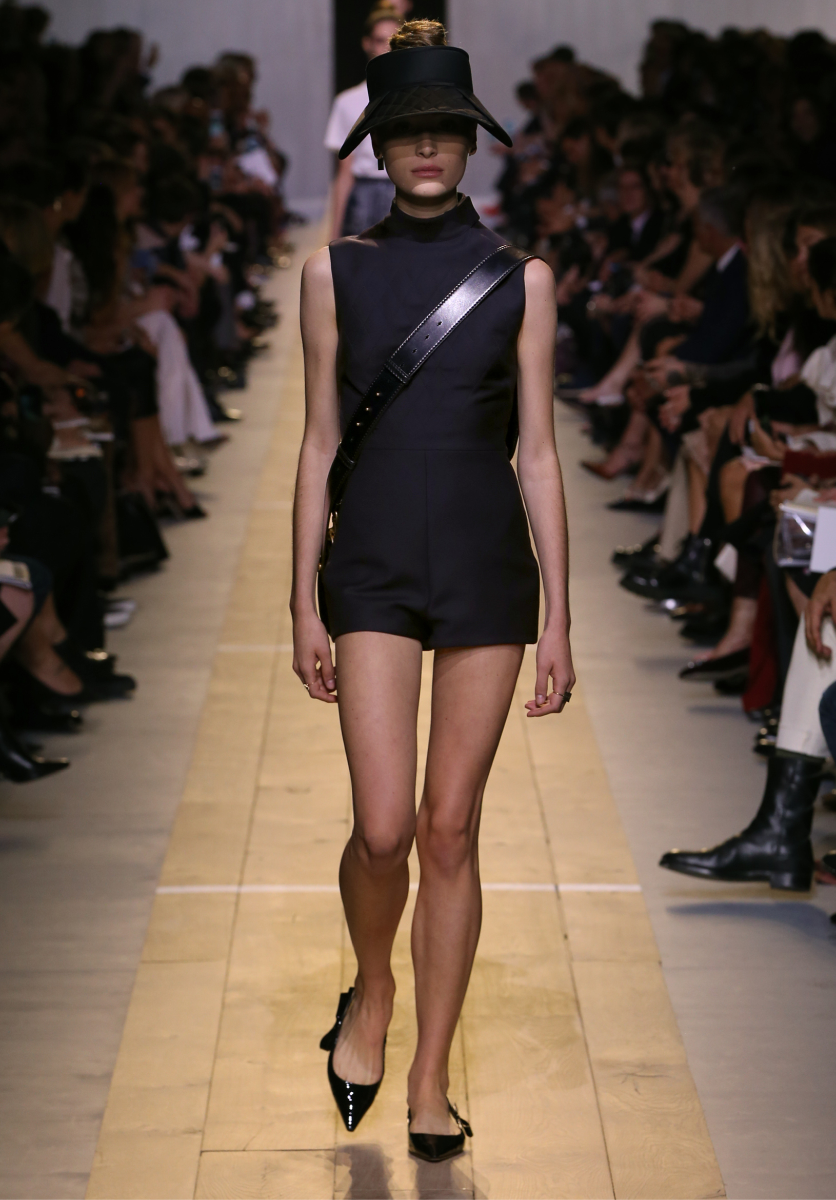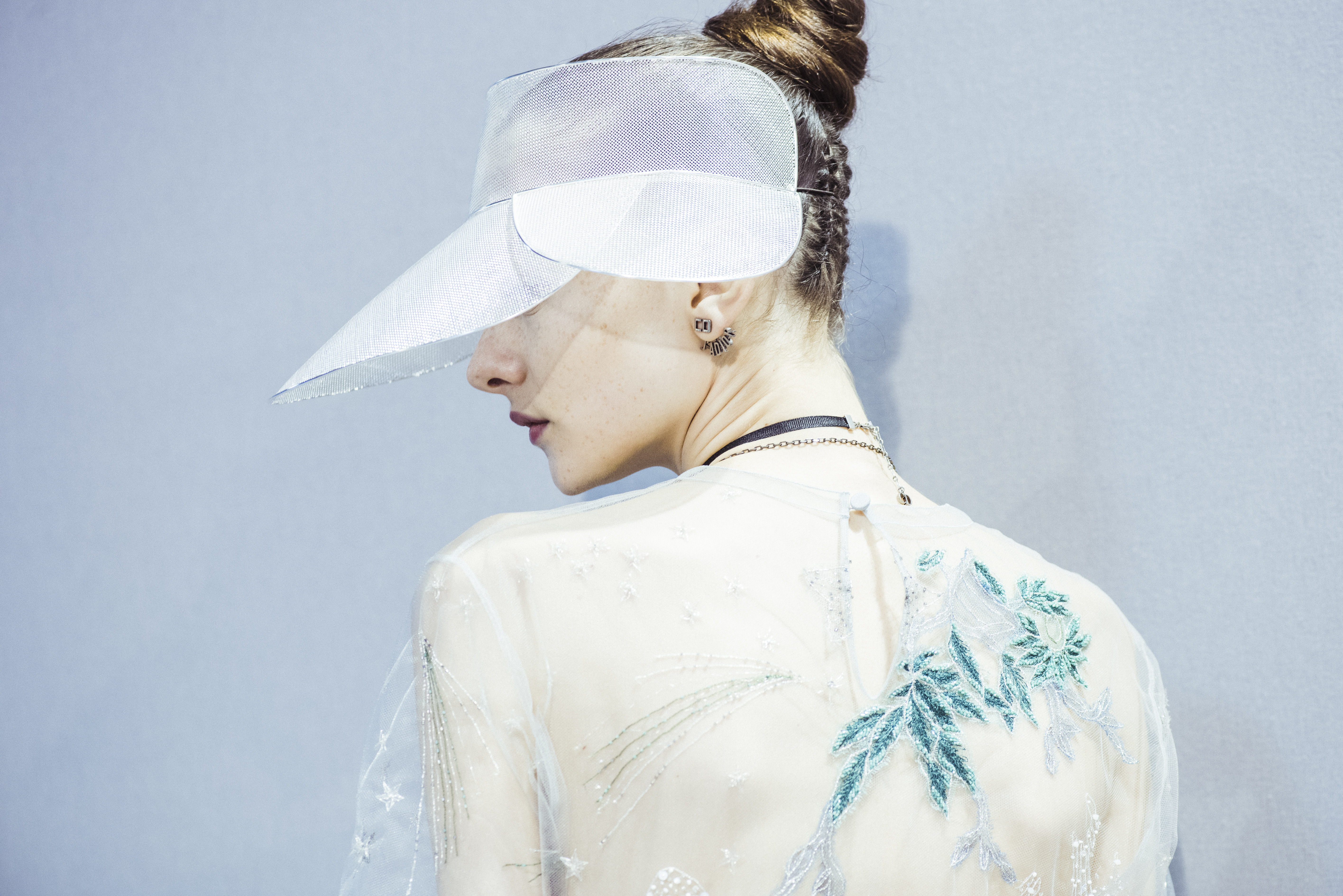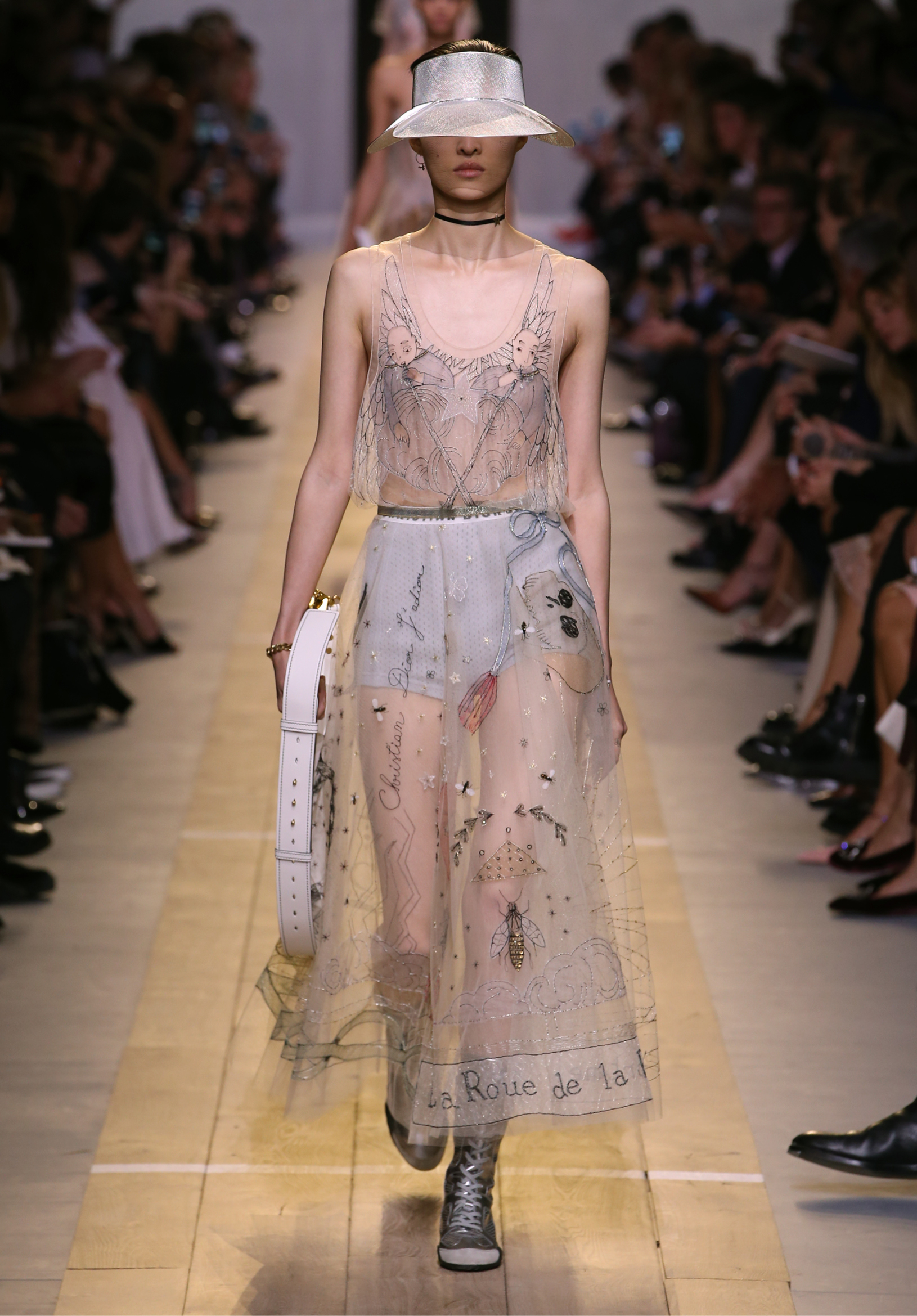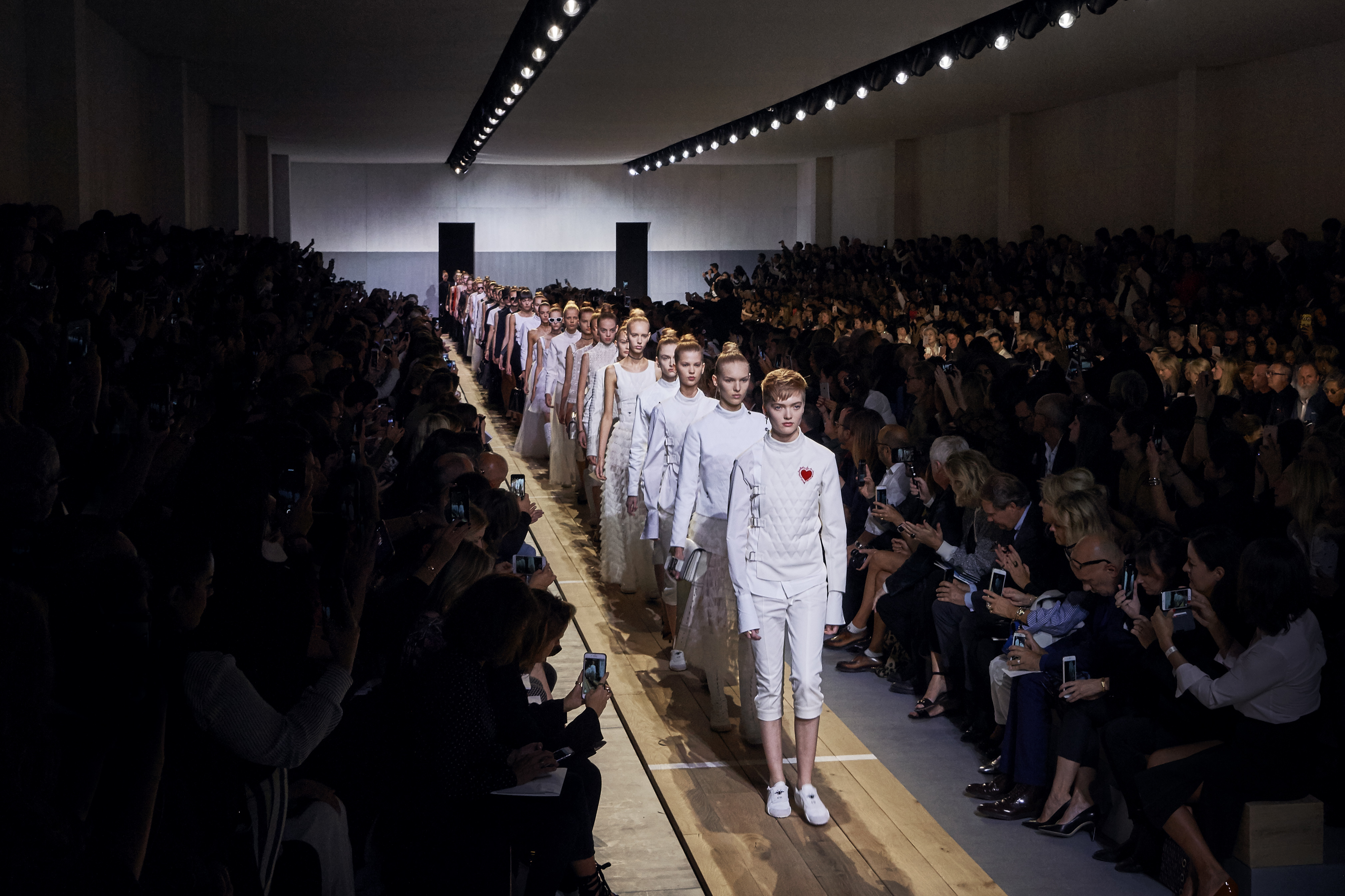 Maria Grazia Chiuri est la première femme à diriger la création de la Maison Dior ; son regard féminin audacieux – féministe est un mot récurrent chez elle – explore les règles de la beauté moderne pour les transposer dans une collection régie par cette tension sensuelle qui règne entre le corps et le vêtement. Le New Look de Christian Dior défiait la modernité et la rigueur de la tenue, en redonnant à la femme les courbes et le raffinement que la guerre avait effacés, une mode résolument nouvelle à cette époque. Maria Grazia Chiuri se confronte à la tradition de la maison Dior et replace ainsi la femme au centre, en bousculant les attentes et en remettant en cause ce qui est tenu pour acquis. Elle appelle à réfléchir aux formes d’une silhouette contemporaine, agile, olympienne, élitiste dans l’élégance sportive, tout en restant à la portée de chacune puisque l’uniforme est à la fois un élément unique et sériel. Il est un lieu où le corps s’exprime dans son individualité et où il peut partager en même temps avec les autres corps les règles du jeu et du paraître.