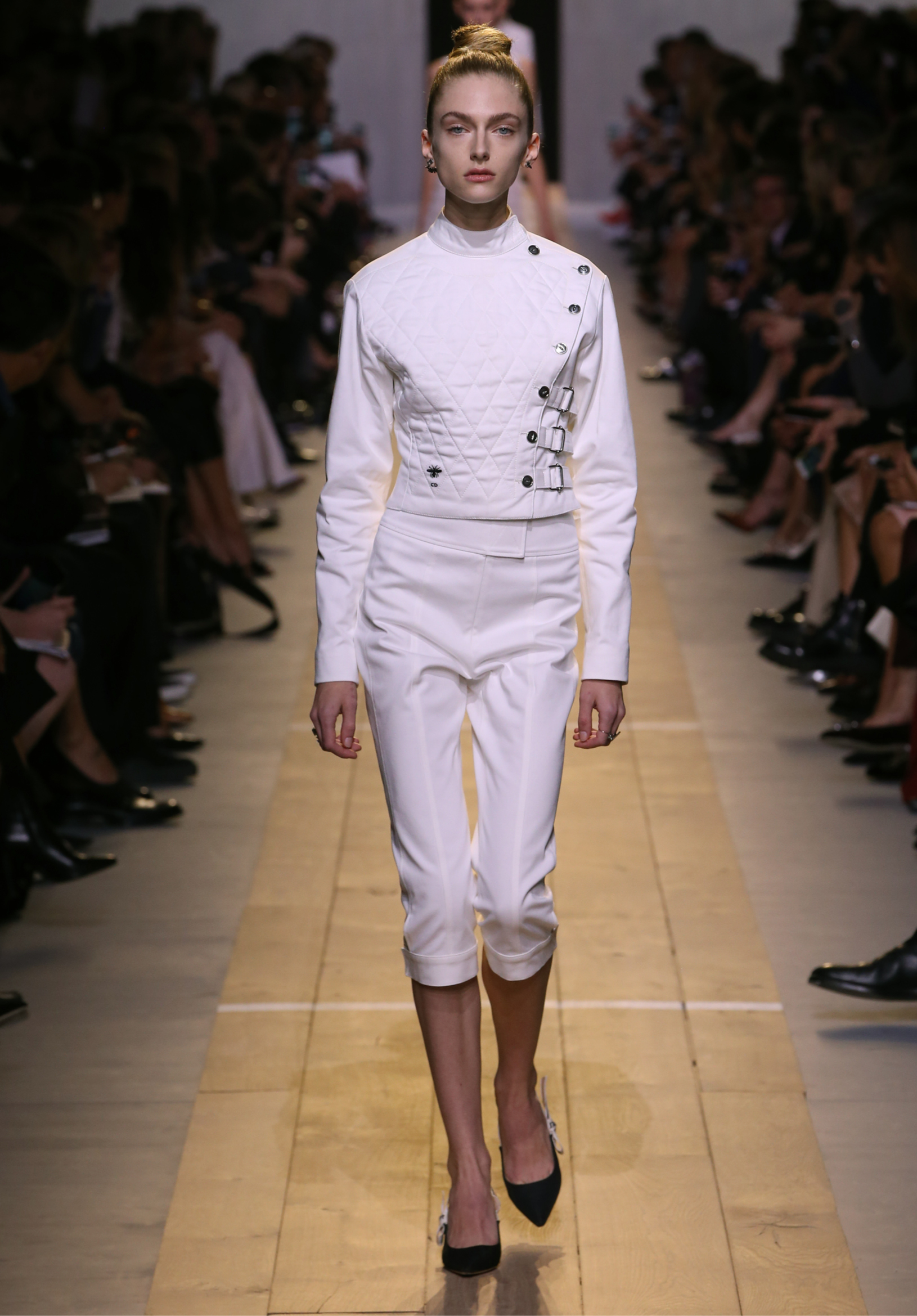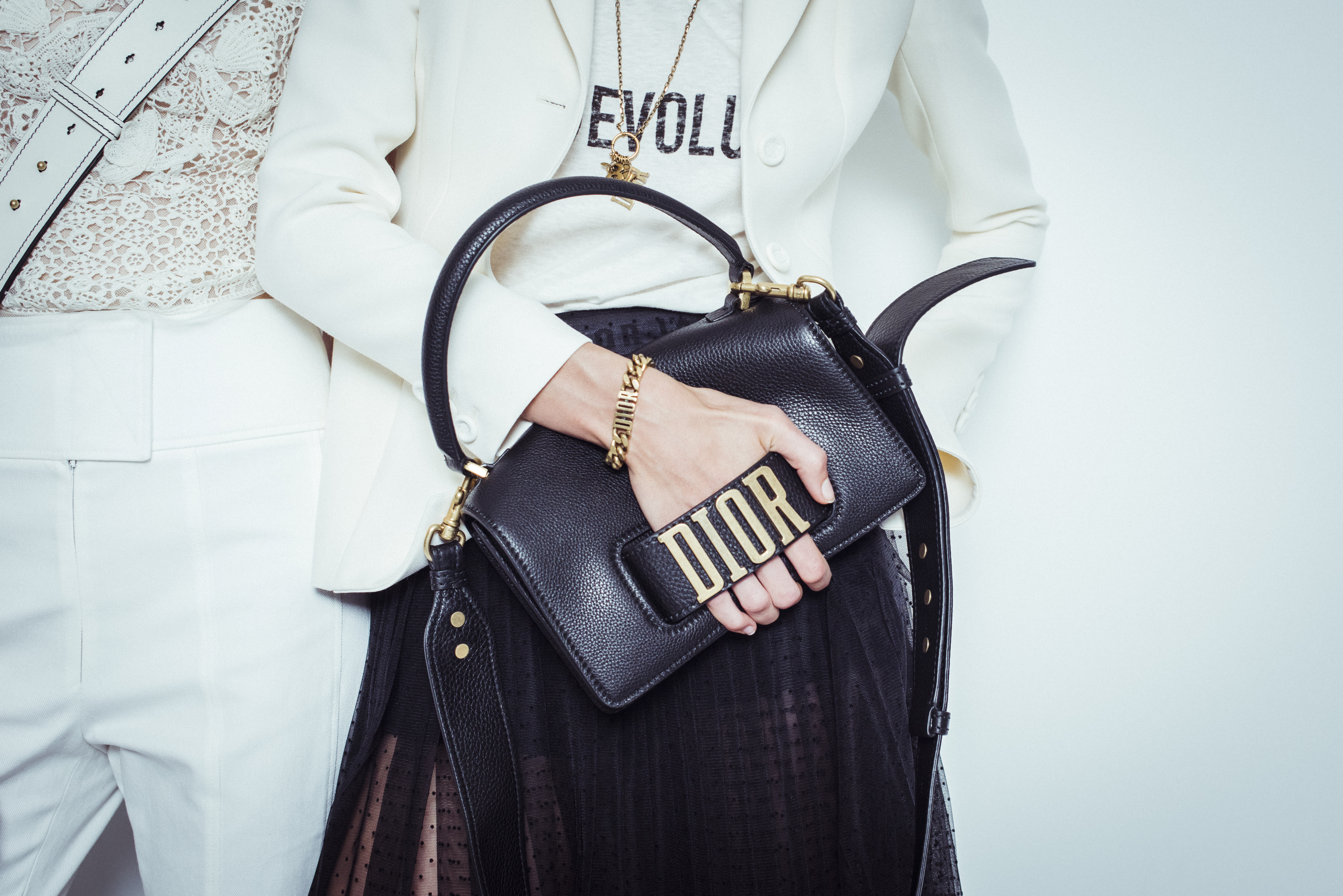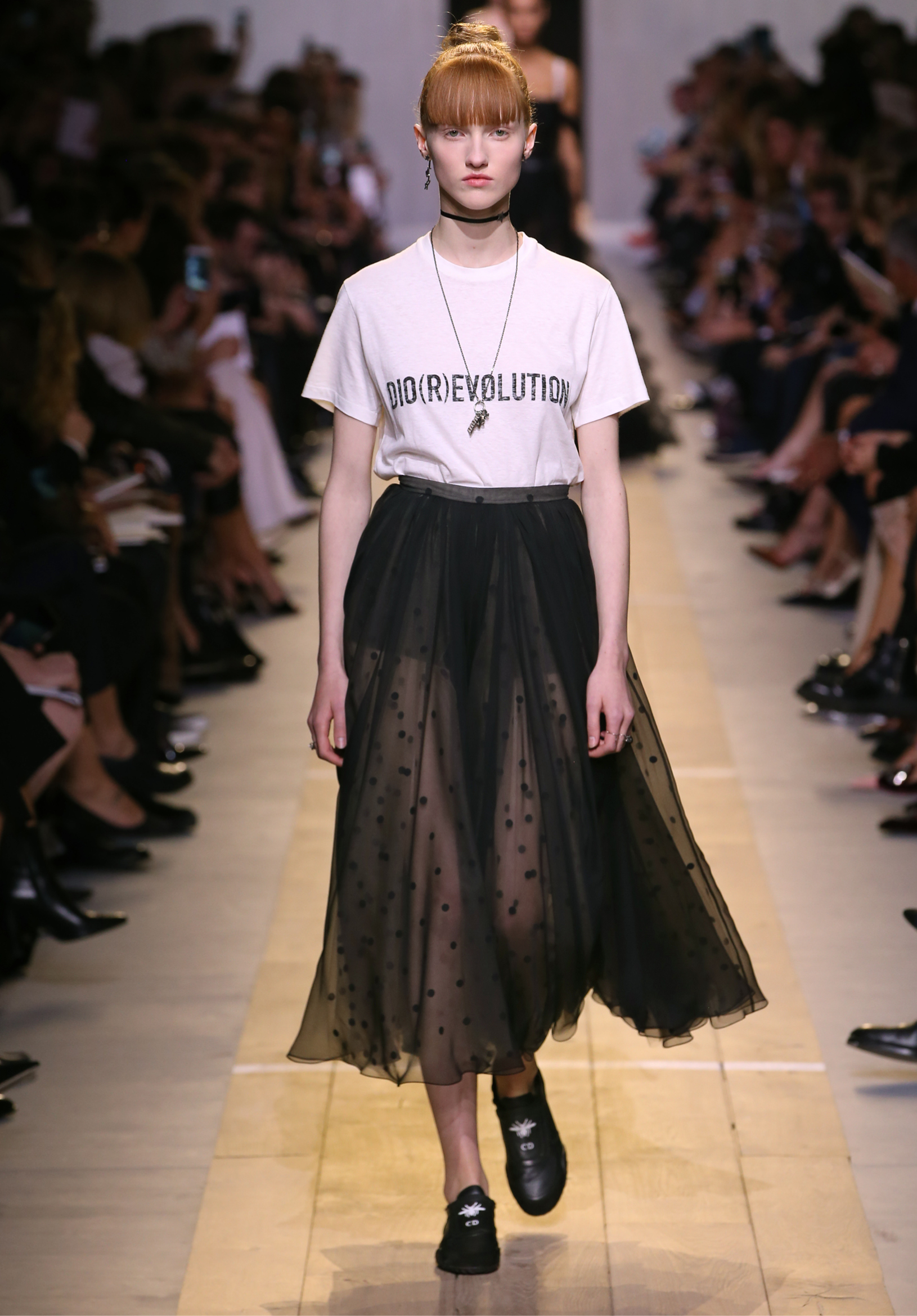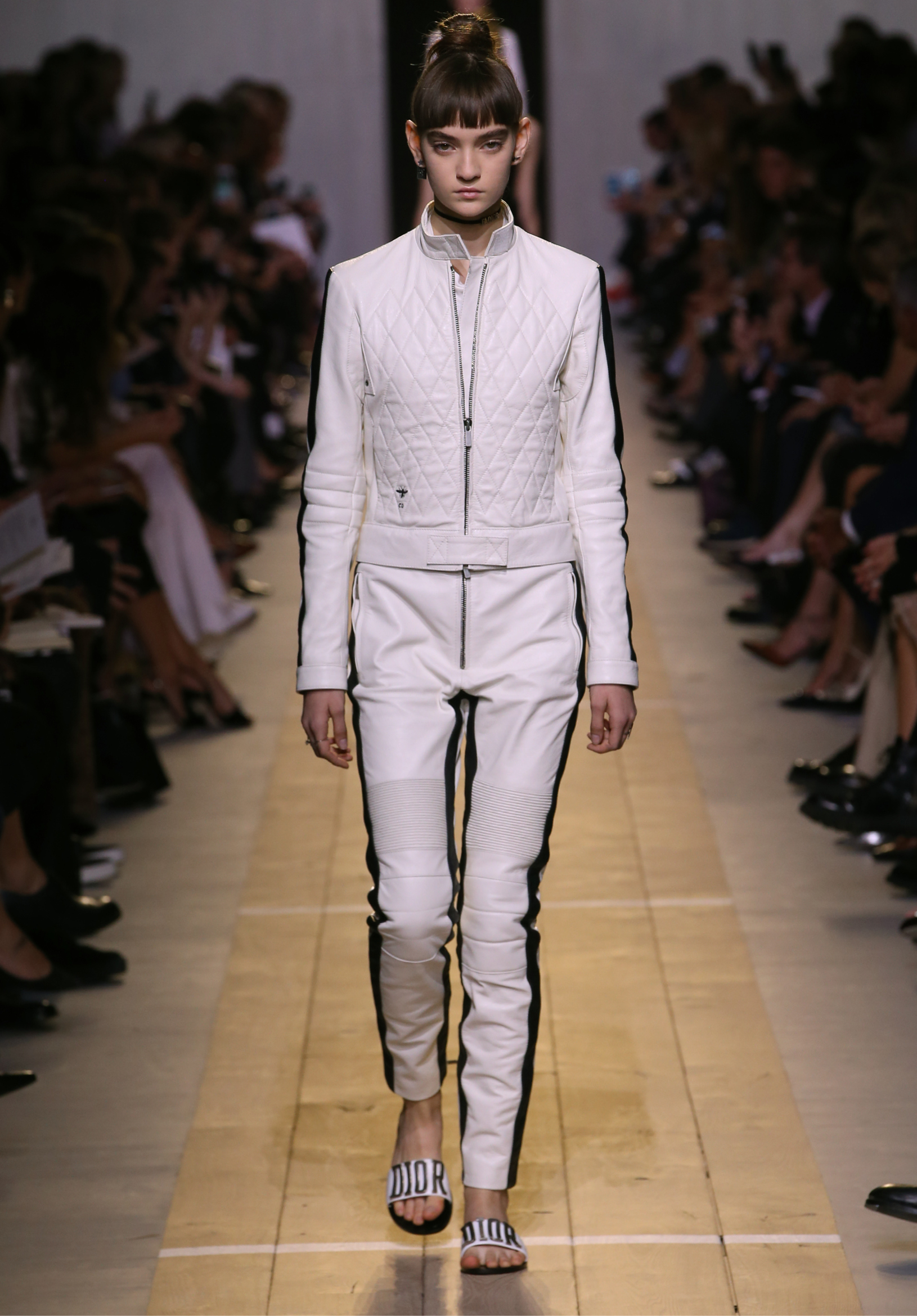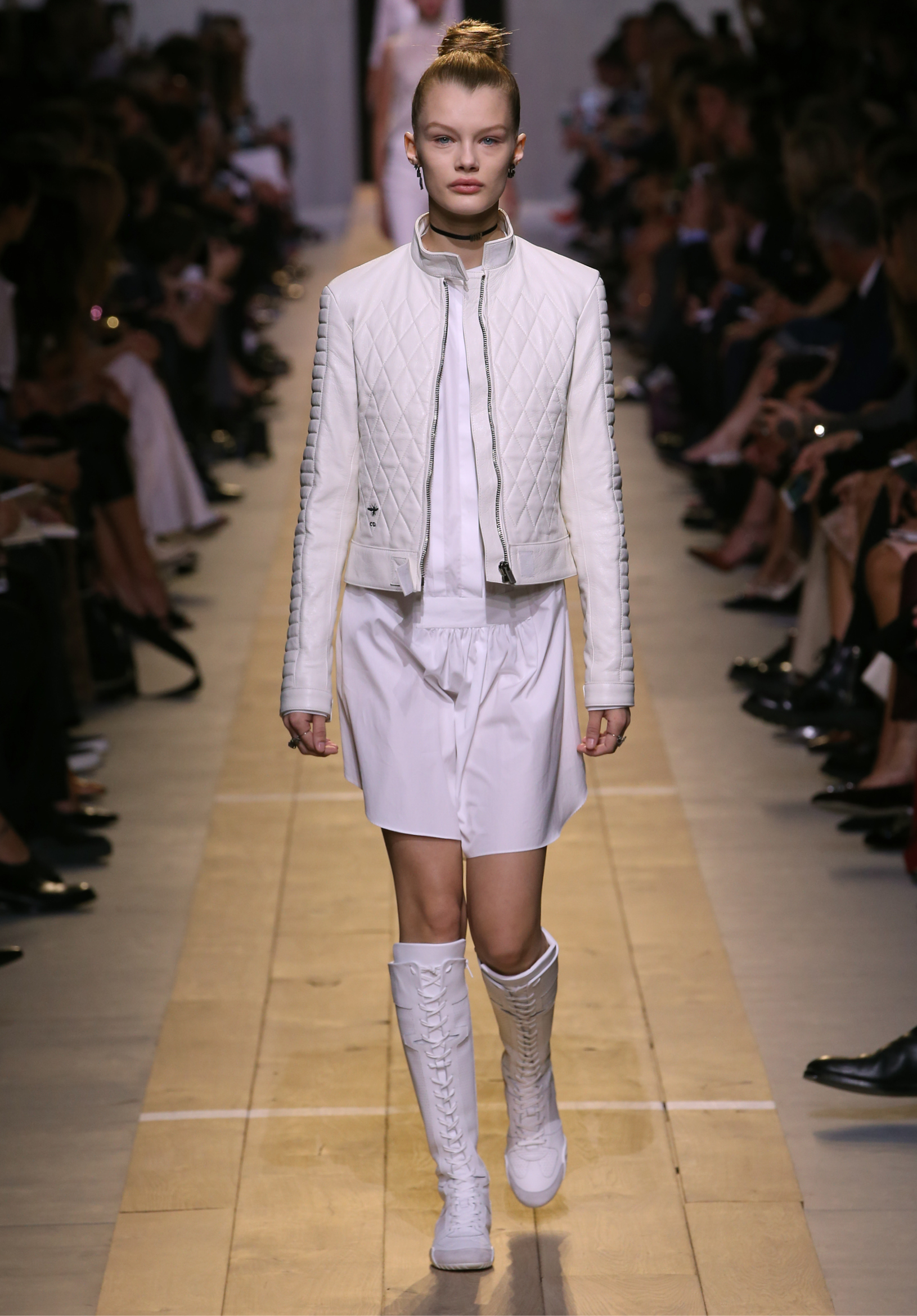 Maria Grazia Chiuri est la première femme à diriger la création de la Maison Dior ; son regard féminin audacieux – féministe est un mot récurrent chez elle – explore les règles de la beauté moderne pour les transposer dans une collection régie par cette tension sensuelle qui règne entre le corps et le vêtement. Le New Look de Christian Dior défiait la modernité et la rigueur de la tenue, en redonnant à la femme les courbes et le raffinement que la guerre avait effacés, une mode résolument nouvelle à cette époque. Maria Grazia Chiuri se confronte à la tradition de la maison Dior et replace ainsi la femme au centre, en bousculant les attentes et en remettant en cause ce qui est tenu pour acquis. Elle appelle à réfléchir aux formes d’une silhouette contemporaine, agile, olympienne, élitiste dans l’élégance sportive, tout en restant à la portée de chacune puisque l’uniforme est à la fois un élément unique et sériel. Il est un lieu où le corps s’exprime dans son individualité et où il peut partager en même temps avec les autres corps les règles du jeu et du paraître.