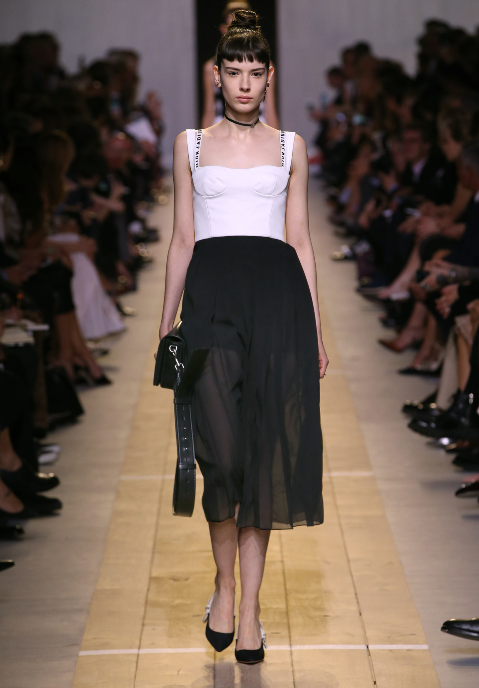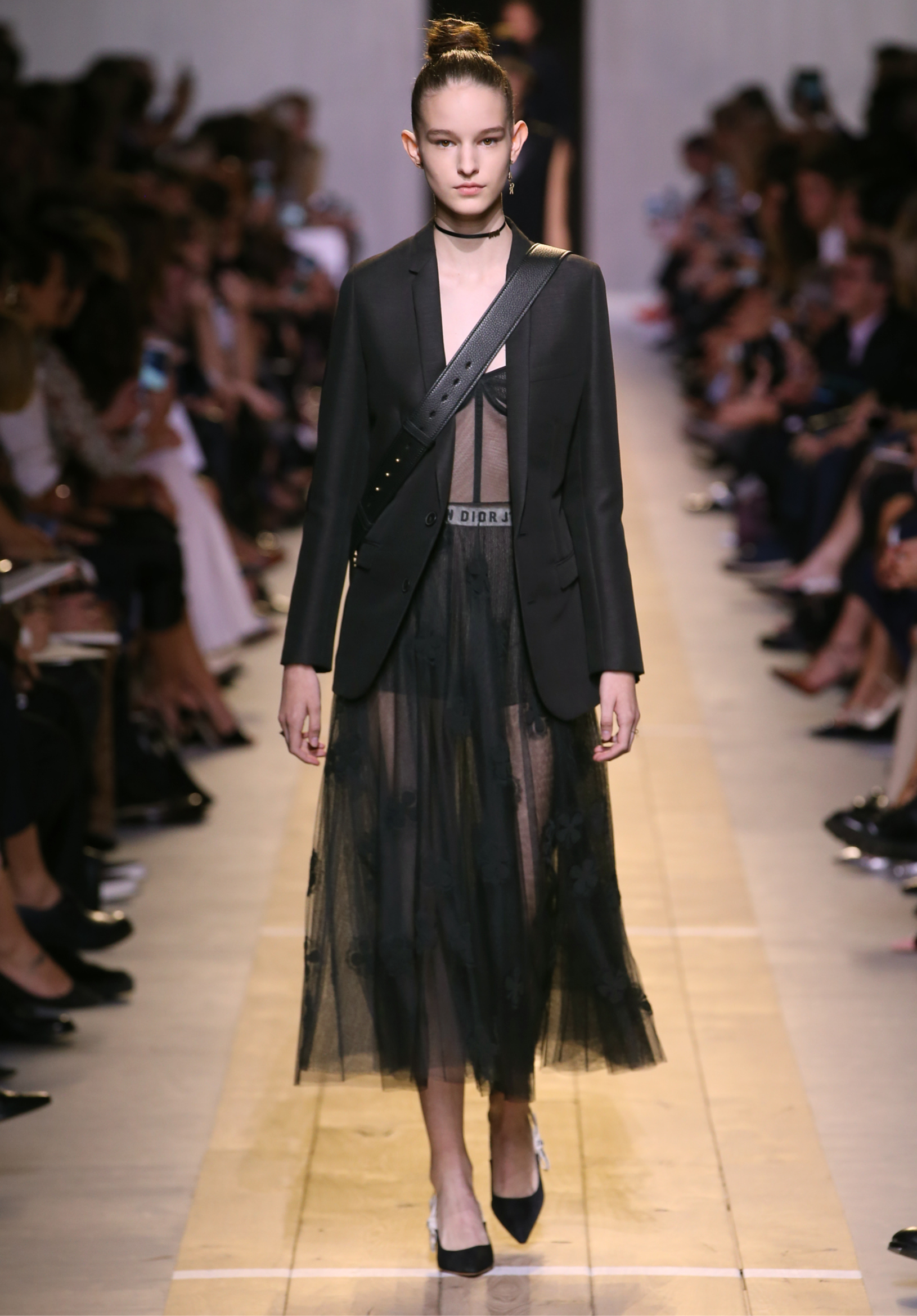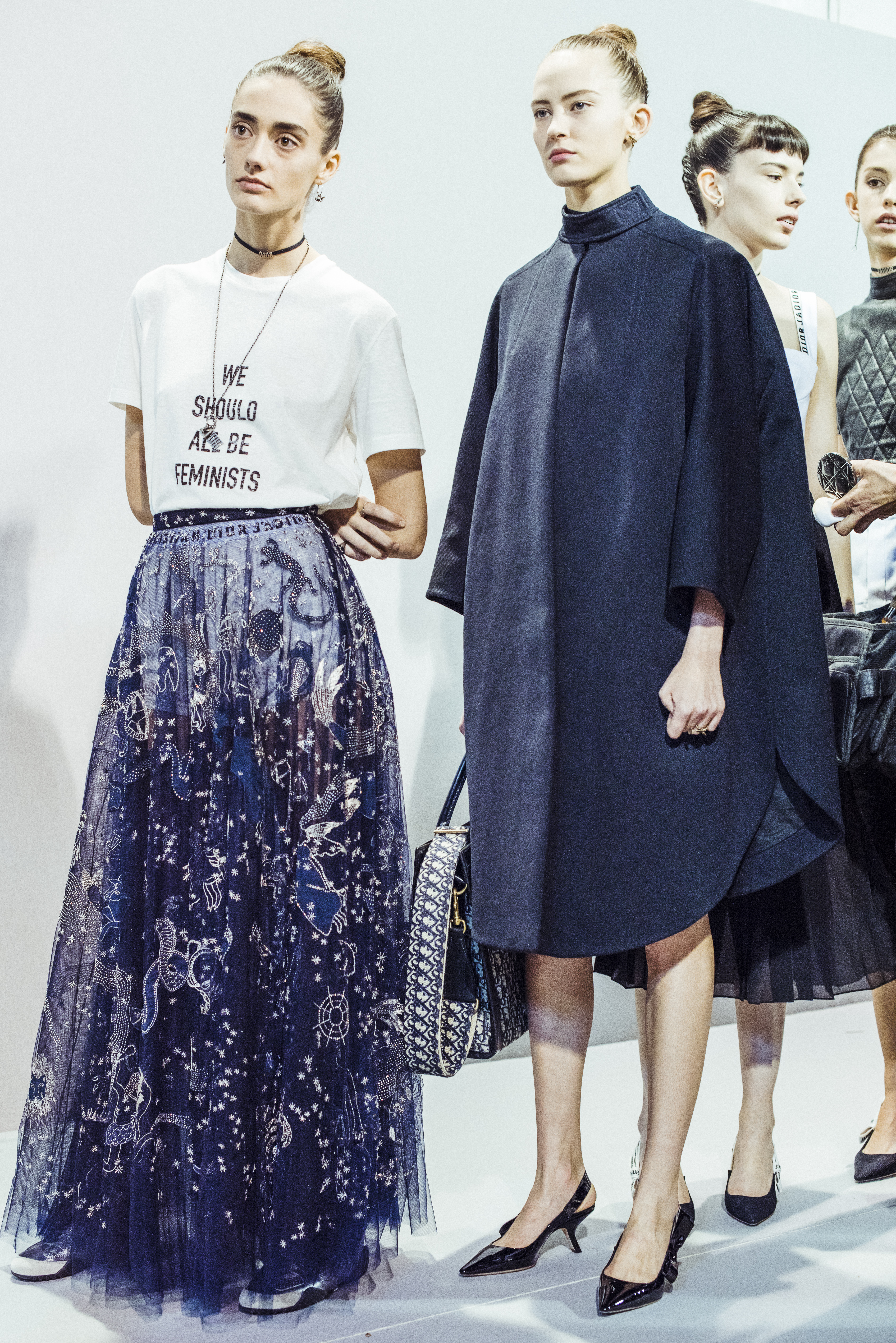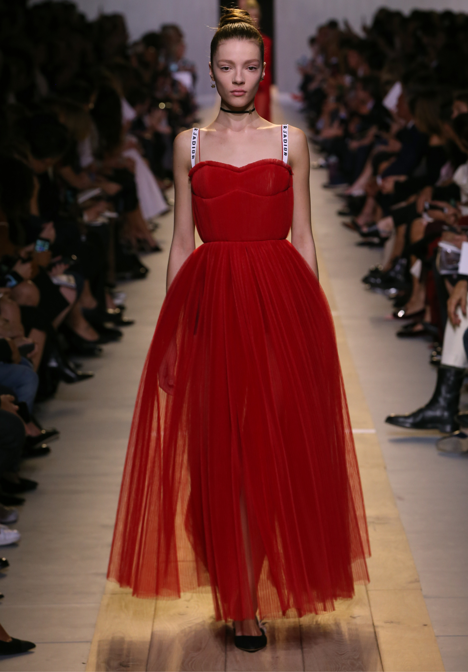 Maria Grazia Chiuri est la première femme à diriger la création de la Maison Dior ; son regard féminin audacieux – féministe est un mot récurrent chez elle – explore les règles de la beauté moderne pour les transposer dans une collection régie par cette tension sensuelle qui règne entre le corps et le vêtement. Le New Look de Christian Dior défiait la modernité et la rigueur de la tenue, en redonnant à la femme les courbes et le raffinement que la guerre avait effacés, une mode résolument nouvelle à cette époque. Maria Grazia Chiuri se confronte à la tradition de la maison Dior et replace ainsi la femme au centre, en bousculant les attentes et en remettant en cause ce qui est tenu pour acquis. Elle appelle à réfléchir aux formes d’une silhouette contemporaine, agile, olympienne, élitiste dans l’élégance sportive, tout en restant à la portée de chacune puisque l’uniforme est à la fois un élément unique et sériel. Il est un lieu où le corps s’exprime dans son individualité et où il peut partager en même temps avec les autres corps les règles du jeu et du paraître.