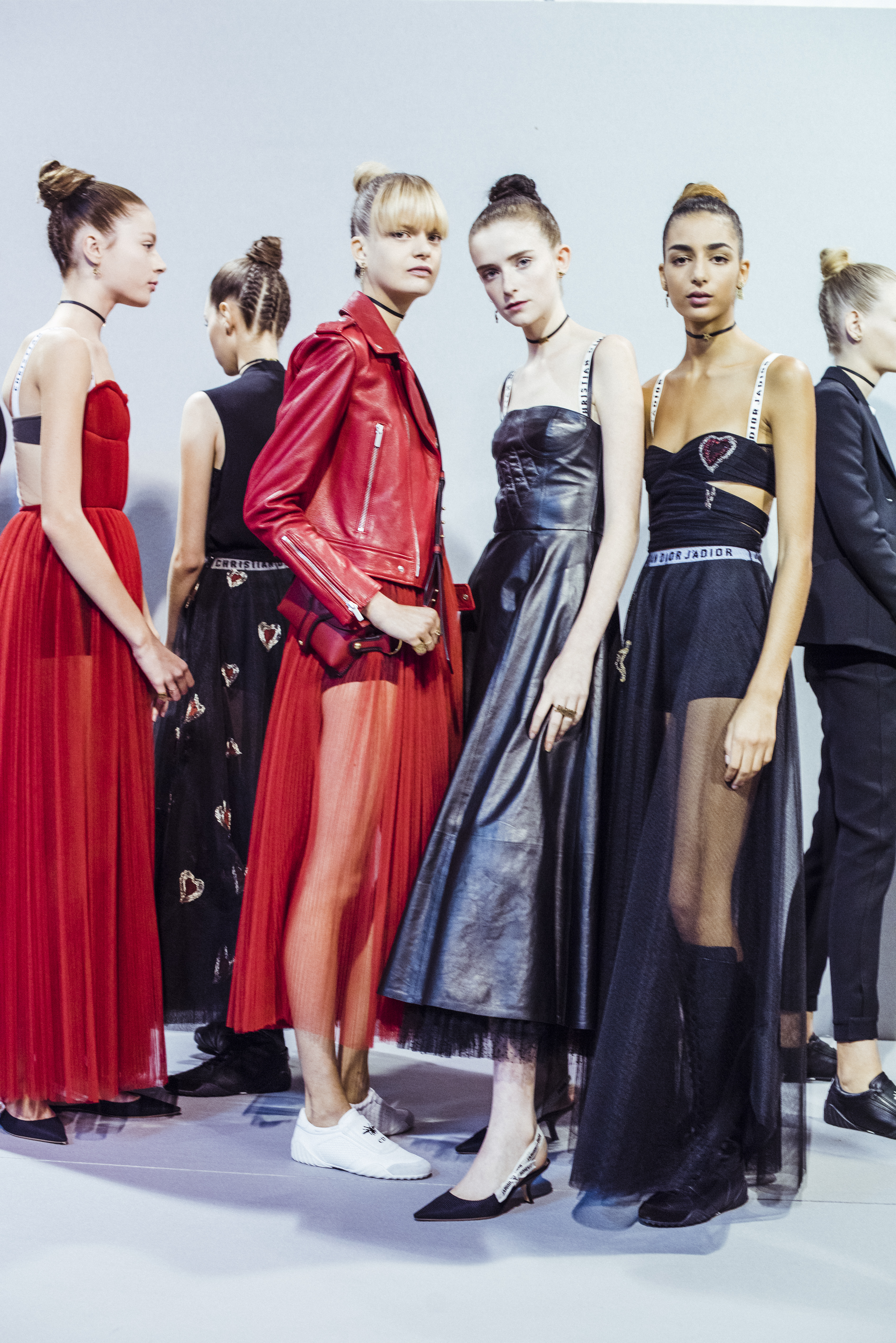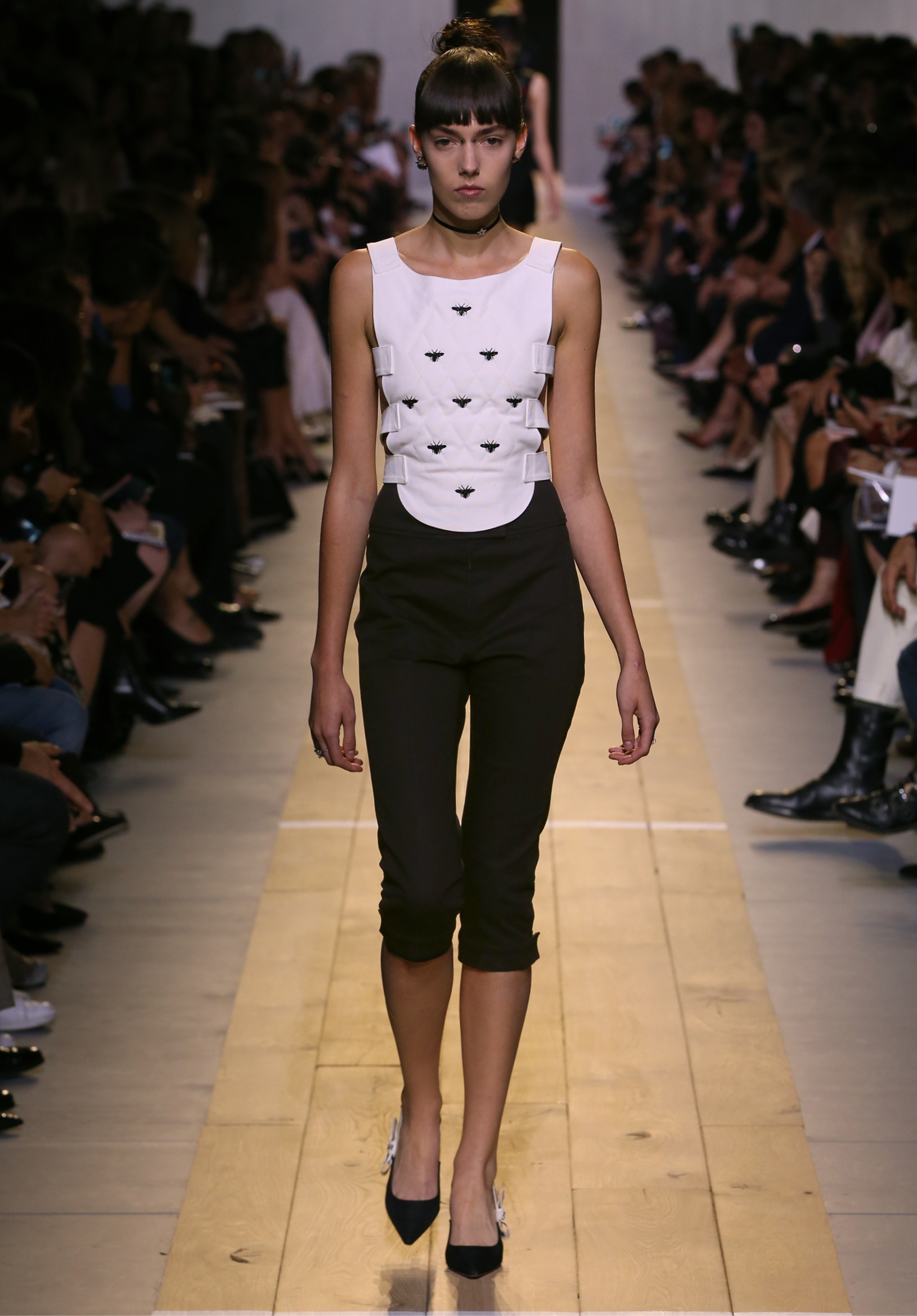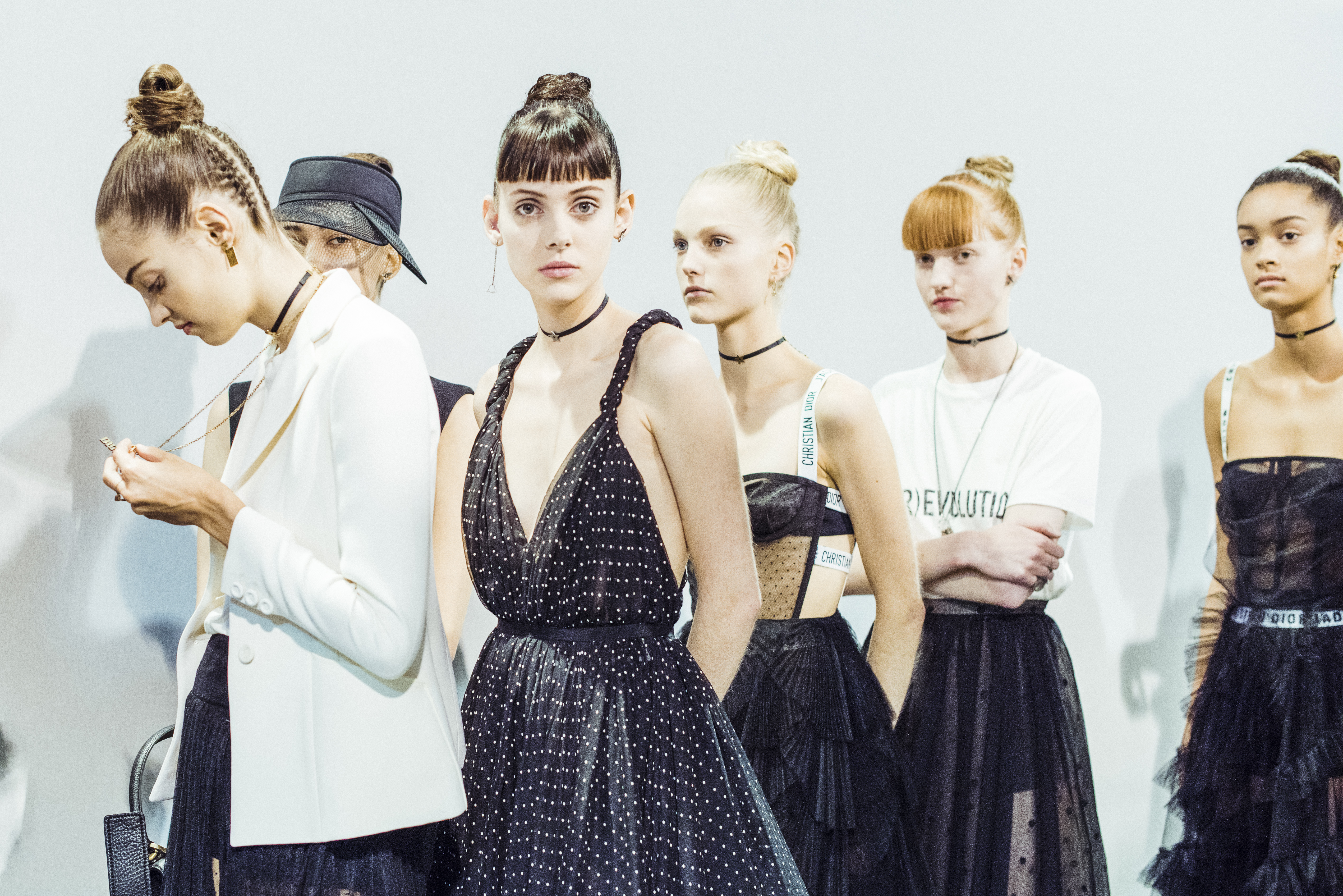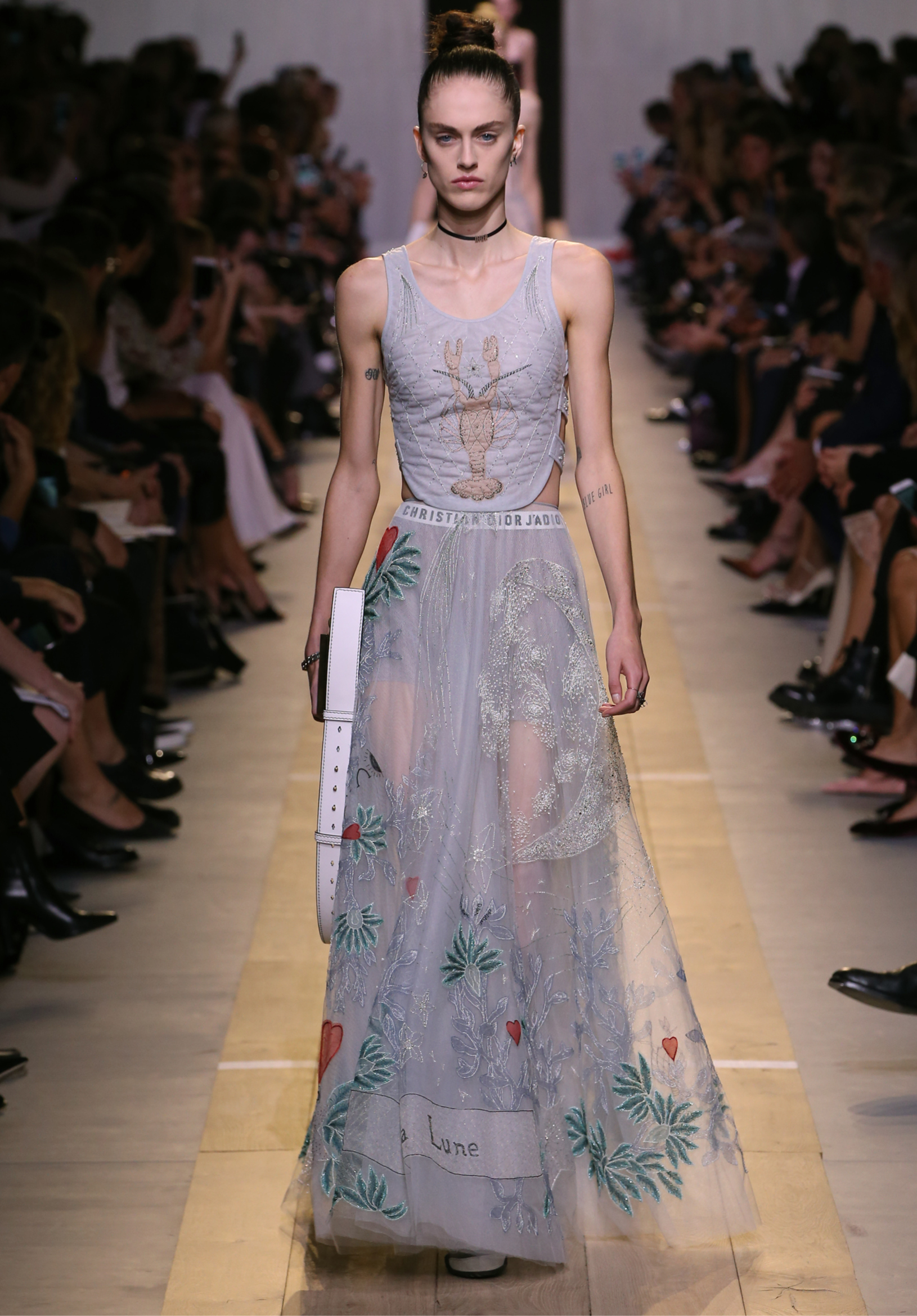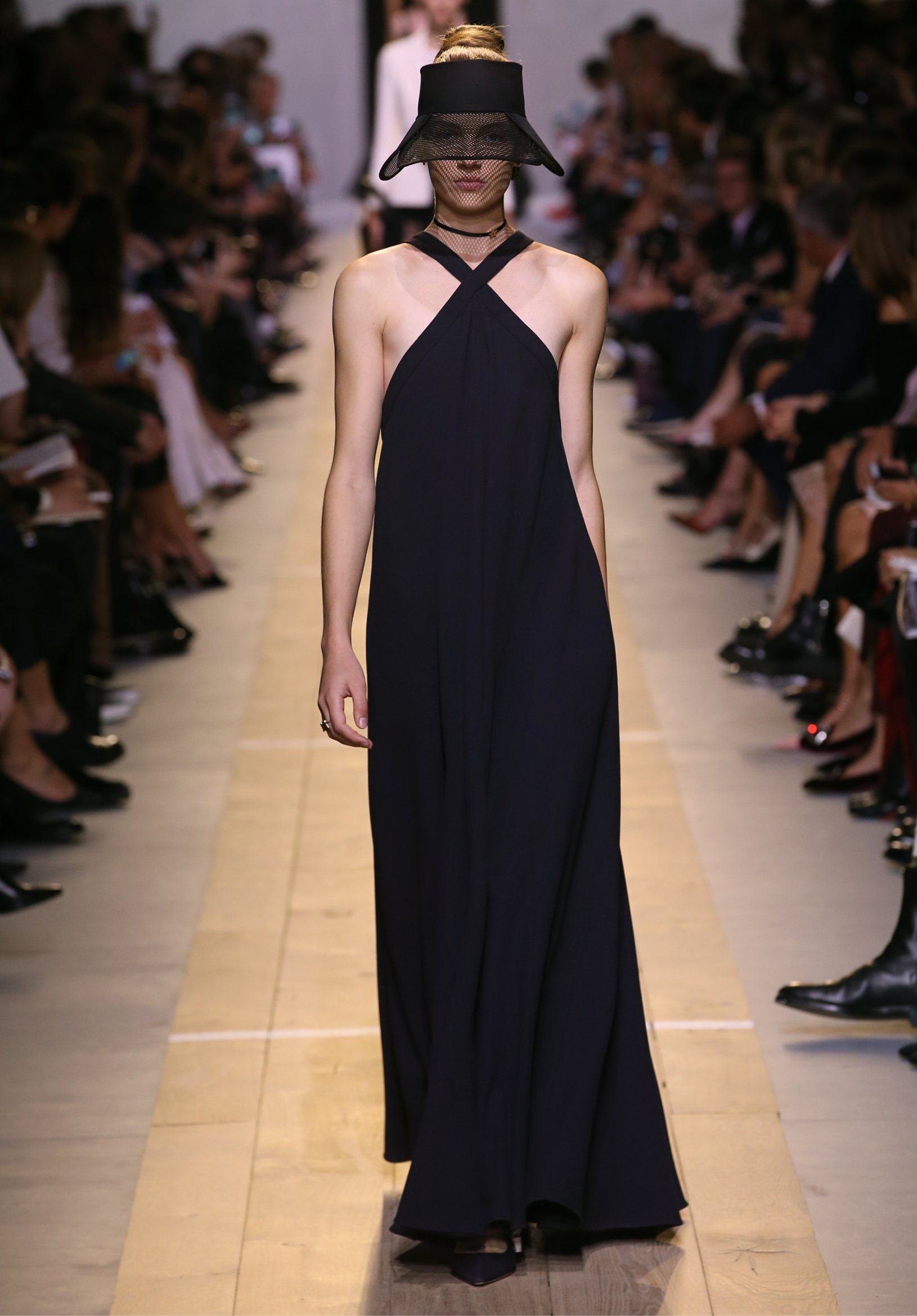 Maria Grazia Chiuri est la première femme à diriger la création de la Maison Dior ; son regard féminin audacieux – féministe est un mot récurrent chez elle – explore les règles de la beauté moderne pour les transposer dans une collection régie par cette tension sensuelle qui règne entre le corps et le vêtement. Le New Look de Christian Dior défiait la modernité et la rigueur de la tenue, en redonnant à la femme les courbes et le raffinement que la guerre avait effacés, une mode résolument nouvelle à cette époque. Maria Grazia Chiuri se confronte à la tradition de la maison Dior et replace ainsi la femme au centre, en bousculant les attentes et en remettant en cause ce qui est tenu pour acquis. Elle appelle à réfléchir aux formes d’une silhouette contemporaine, agile, olympienne, élitiste dans l’élégance sportive, tout en restant à la portée de chacune puisque l’uniforme est à la fois un élément unique et sériel. Il est un lieu où le corps s’exprime dans son individualité et où il peut partager en même temps avec les autres corps les règles du jeu et du paraître.