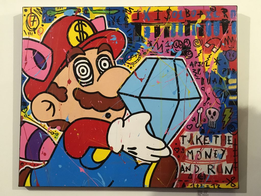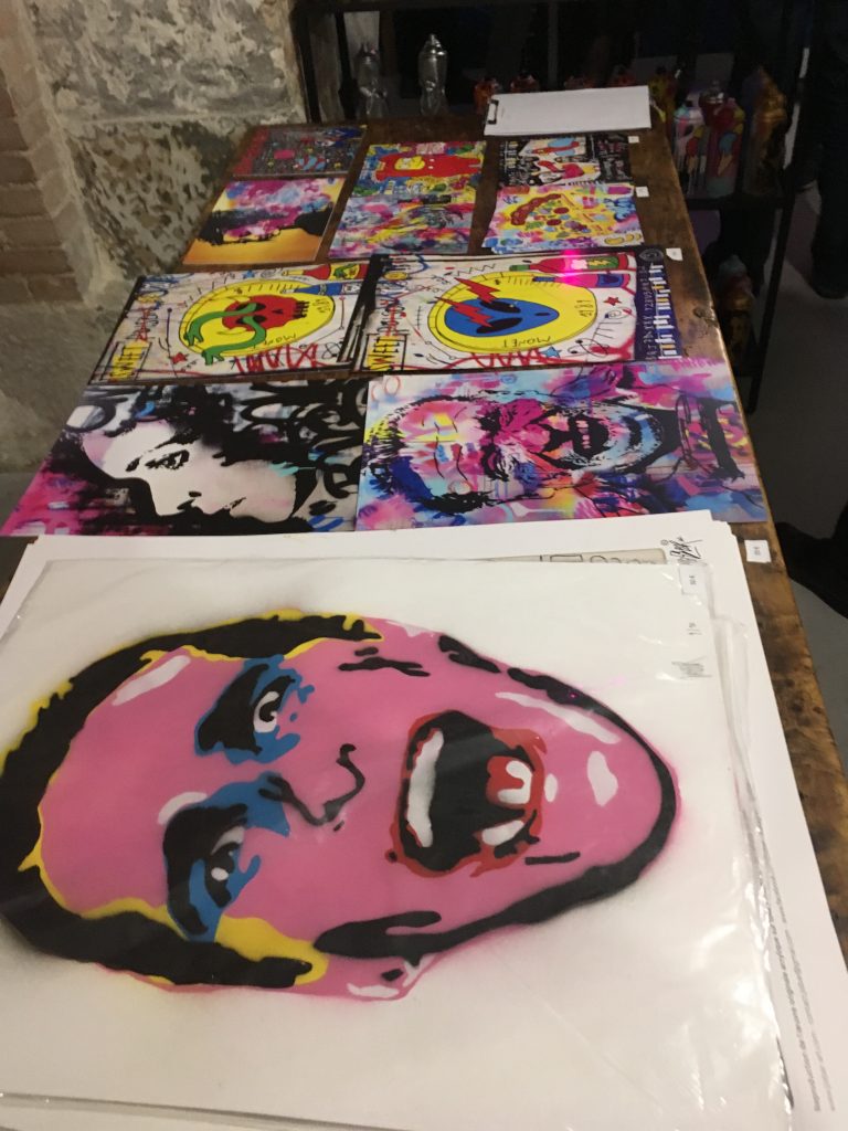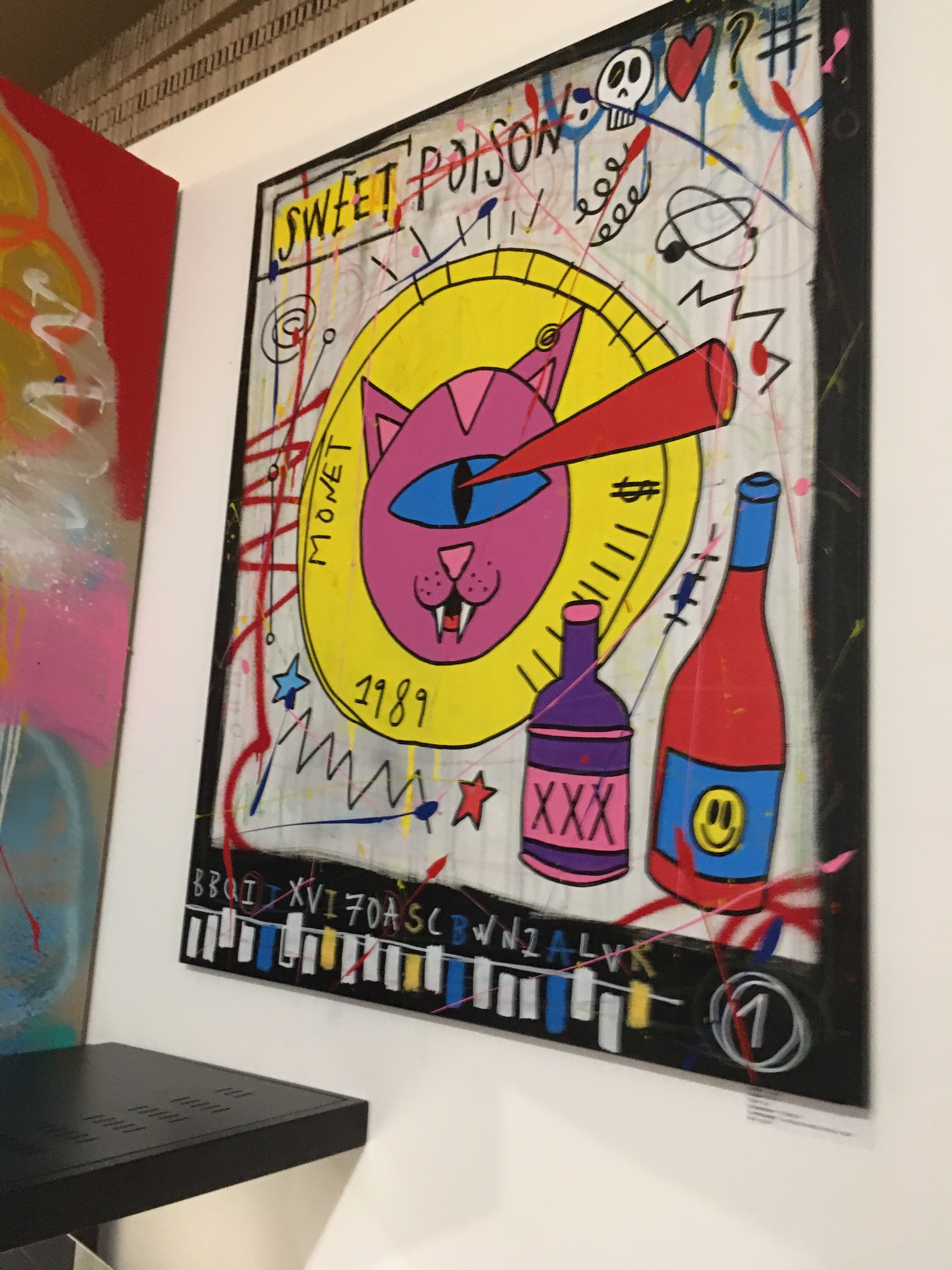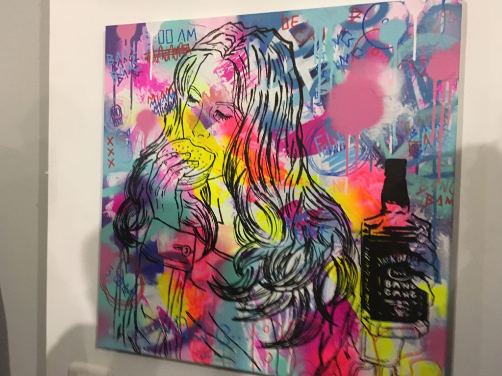 Elle propose des oeuvres aux tarifs ateliers, et autant vous dire celles-ci vont partir très vite. On peut par exemple parler des bouteilles de Jack Daniel’s customisées à 25€, les bombes de peintures customisées dans les mêmes prix et quelques prints entre 15 et 50€. Côté toiles, elles sont vraiment très abordables (à partir de 300€).