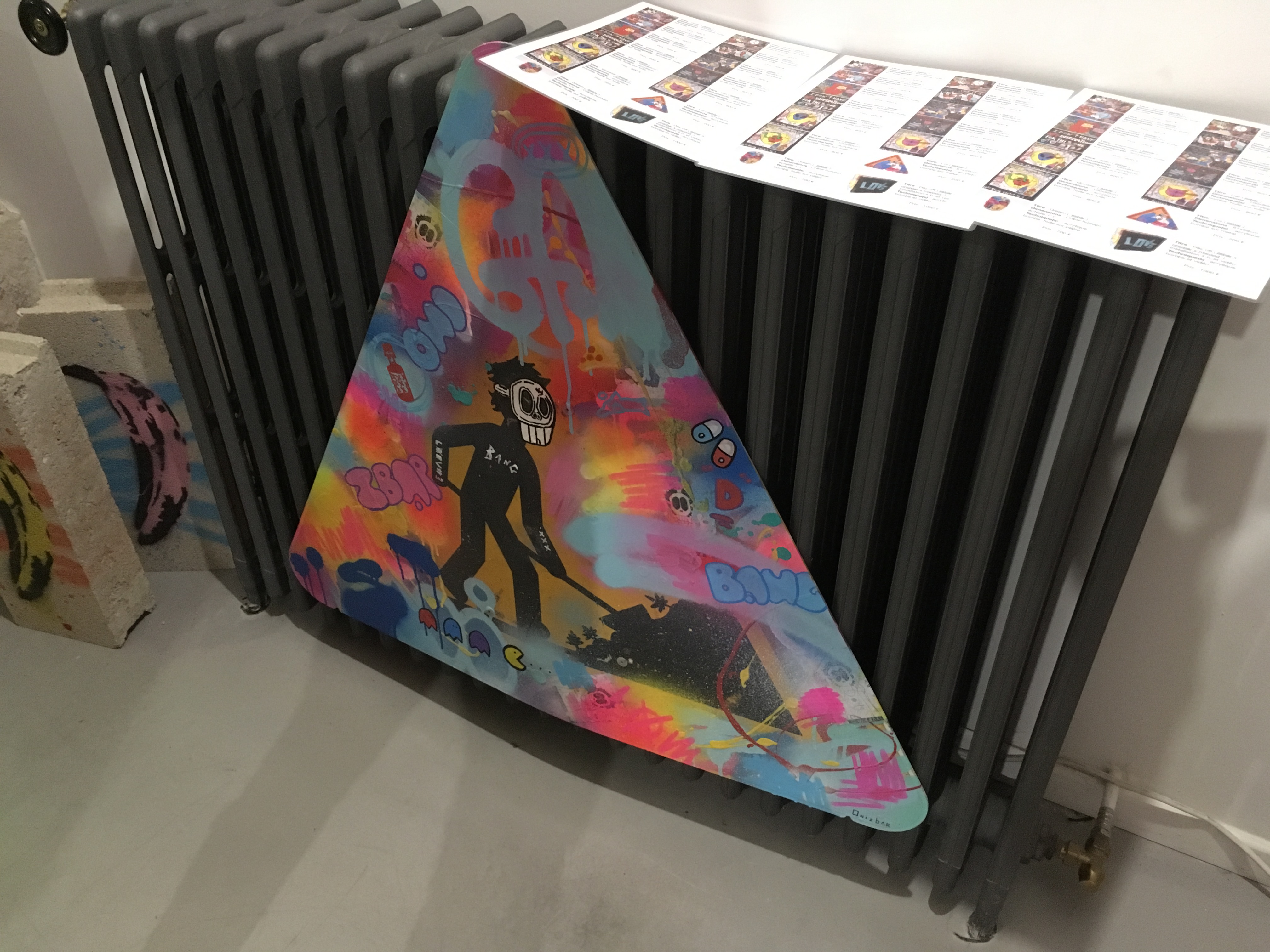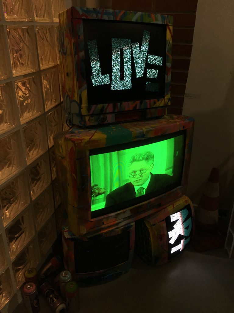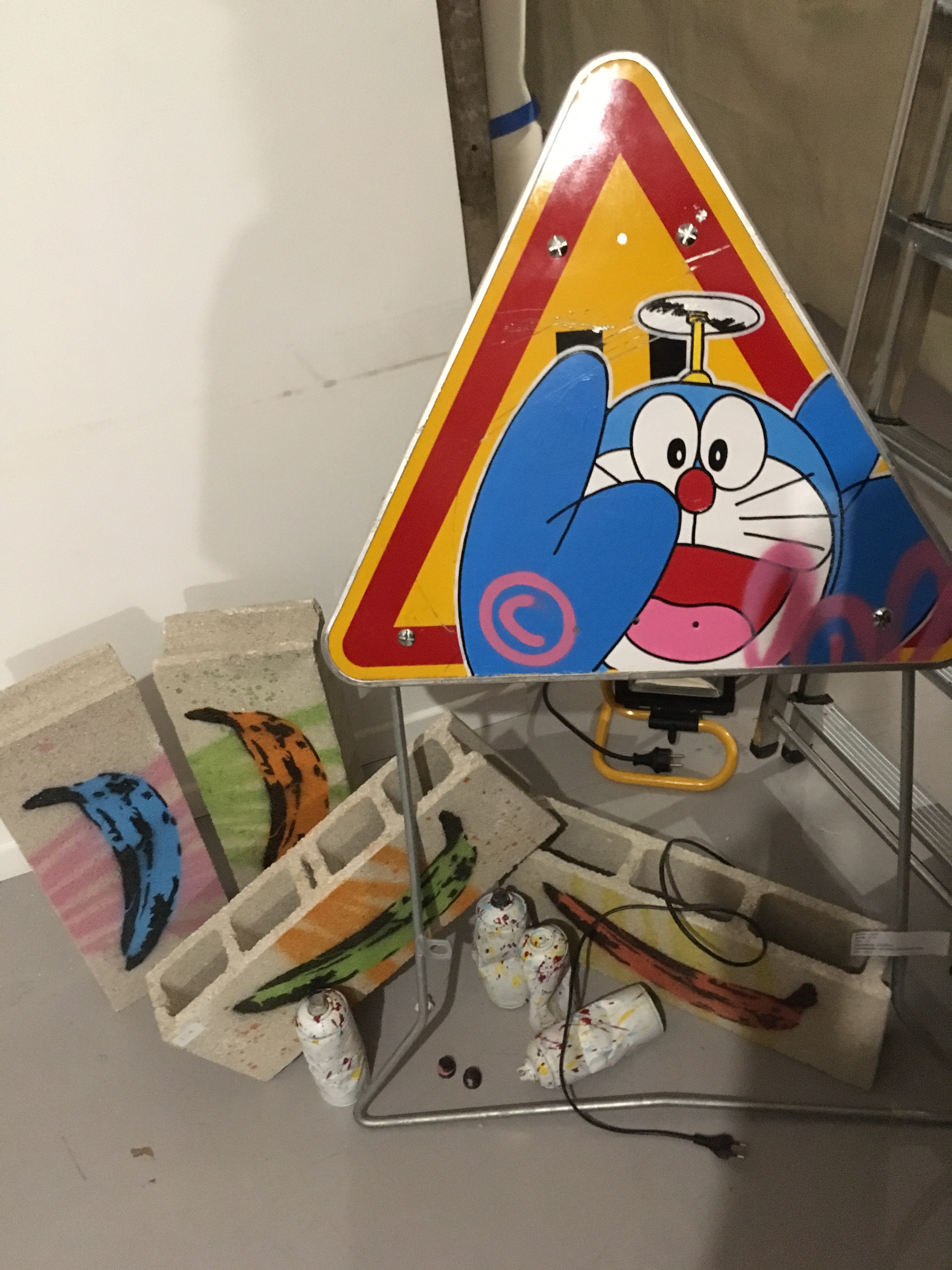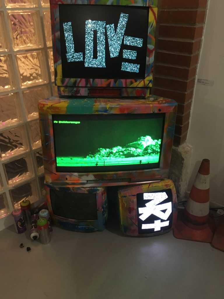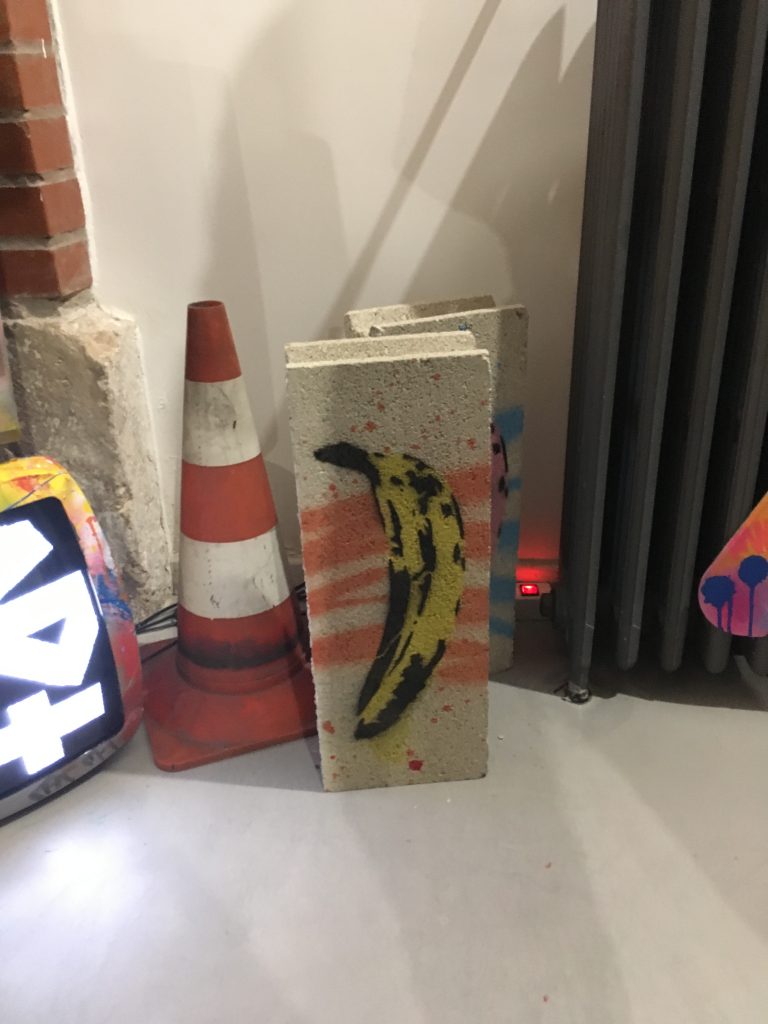 Côté objets originaux, on a pu apercevoir des briques de chantier taggées avec la célèbre banane d’Andy Warhol, des panneaux de chantier avec une approche pop culture et une oeuvre coproduite à trois qui comporte plein de styles. Cette oeuvre qui est un assemblage de 4 télévisions taggées qui diffuse un film complètement what the fuck à l’image de l’exposition.