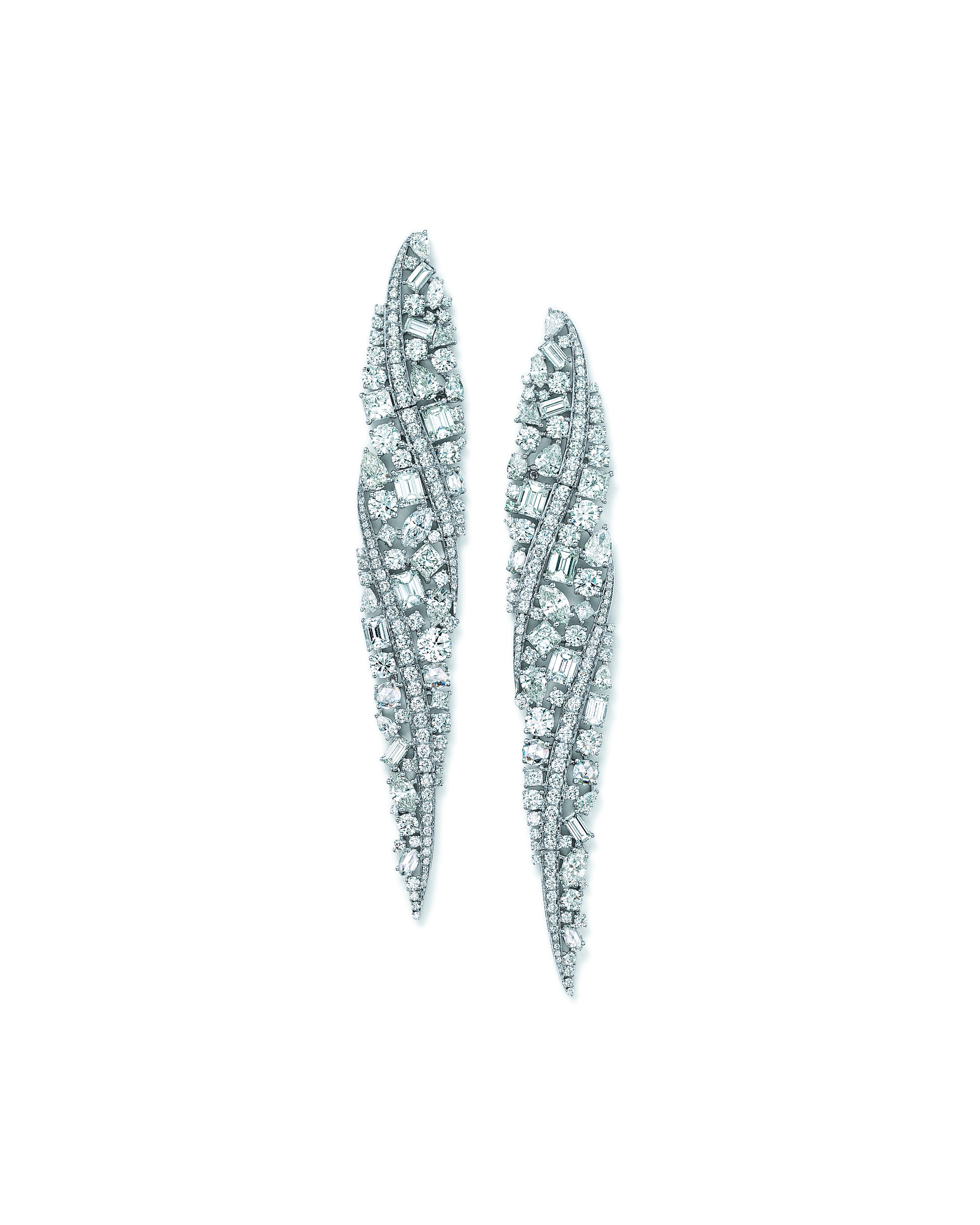 Afin d’en faire ressortir leurs couleurs et leurs clartés, les artisans Tiffany ont taillé avec une grande précision les différentes tailles de diamants (brillant, émeraudes, ovales, poires, marquises, princesse) qui composent ces boucles d’oreilles coniques. Les sertisseurs placent chaque pierre sur une monture en platine qui tombe en cascade, encadrant le visage d’un merveilleux éclat.