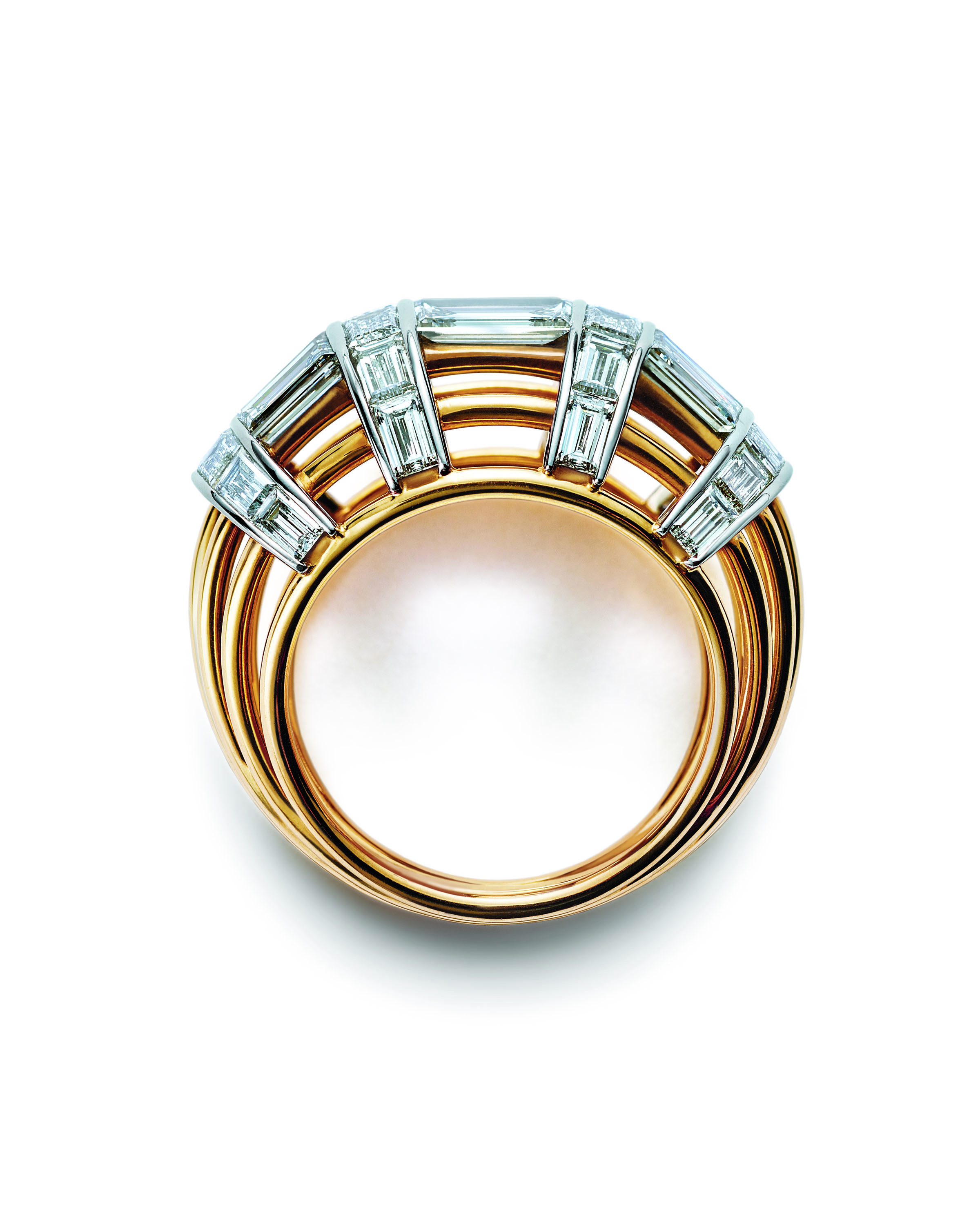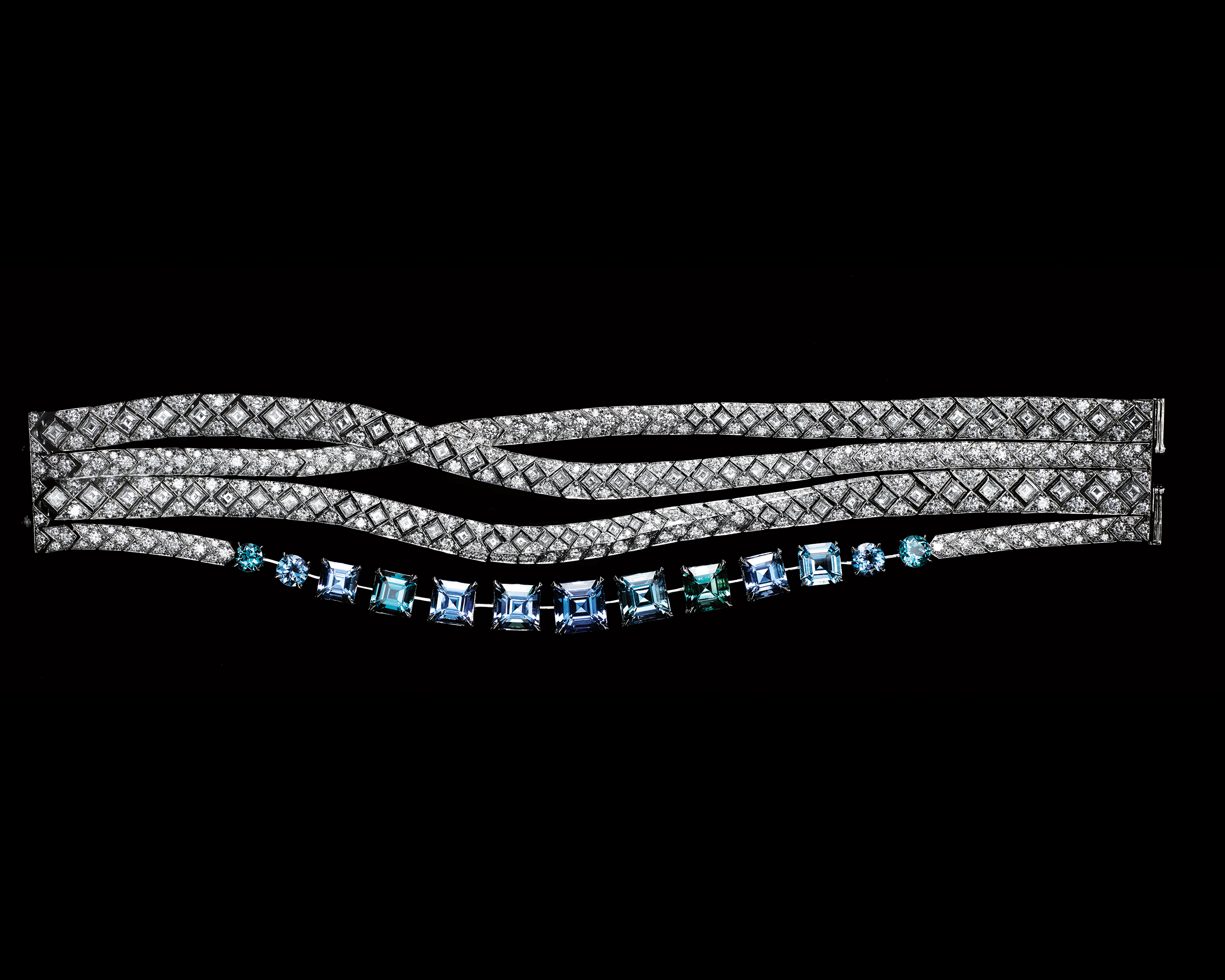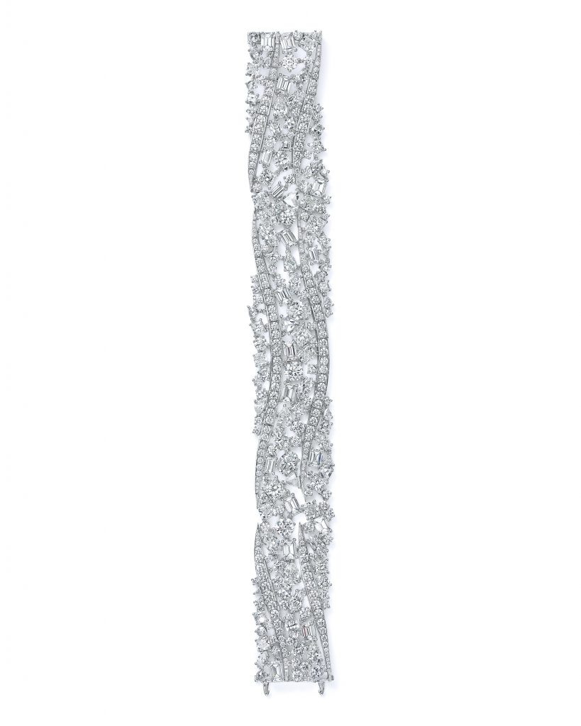 Le plus impressionnant est la manière dont les créations de Haute Joaillerie Tiffany repoussent les limites de l’artisanat, comme avec ce bracelet composé de diamants de tailles différentes. En utilisant des diamants de taille brillant, poire, émeraude, ovale, marquise, princesse et triangulaire sur une monture quasiment invisible, les artisans Tiffany ont déployé leur imagination, créant ainsi un bijou avec un magnifique sens du mouvement et une incroyable mise en avant de la lumière.