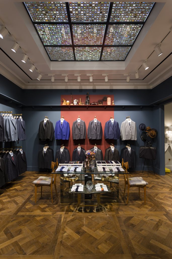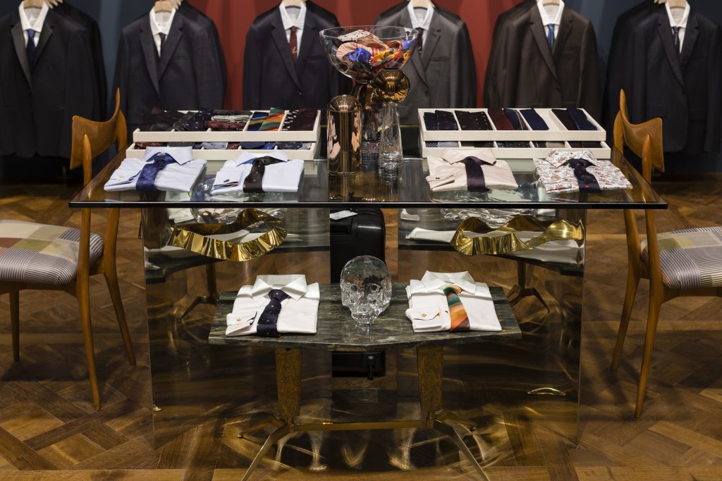 Avec une superficie de 125m2 étendue sur deux pièces, la nouvelle boutique contraste avec la tendance minimaliste des boutiques alentours, tout en respectant les caractéristiques visuelles des boutiques Paul Smith du monde entier. A l’entrée, le seuil recouvert d’une mosaïque sur mesure vous accueille avec le logo Paul Smith et laisse apparaître aux amoureux du détail des petits scarabées qui se baladent. A l’intérieur, une restauration fidèle a rétablie l’authentique caractère haussmannien du bâtiment, telle que l’association d’un parquet Versailles et d’un parquet en Point de Hongrie.La pièce principale abrite une série d’installations en constante évolution, à commencer par une collection de patrons de coutures suspendus. La seconde pièce est centrée autour d’un puits de lumière recouvert par un millier de diapositives, en clin d’œil à l’amour de Paul pour la photographie. Un mur d’œuvres d’arts égaille un comptoir en béton sculpté; les visiteurs attentifs pourront y repérer une empreinte de patte de chien.