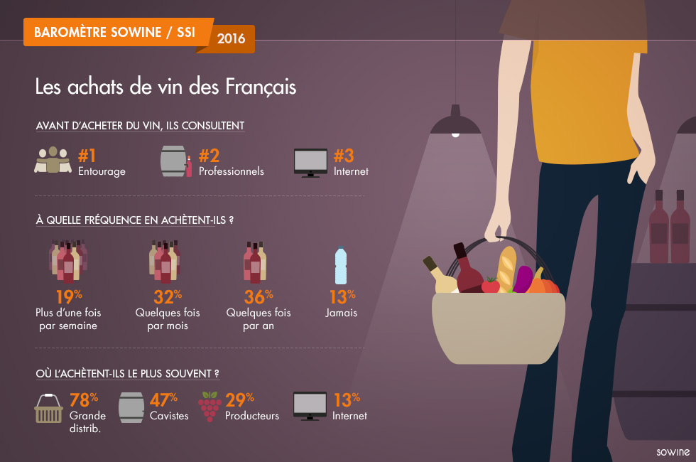 La grande distribution reste en 2016 le circuit privilégié des Français pour l’achat de vin (78%), suivie par les cavistes (47%) et l’achat direct auprès du producteur (29%). Toujours à la question « À quel endroit achetez- vous le plus souvent du vin ? », Internet arrive en 4e position avec 13%.