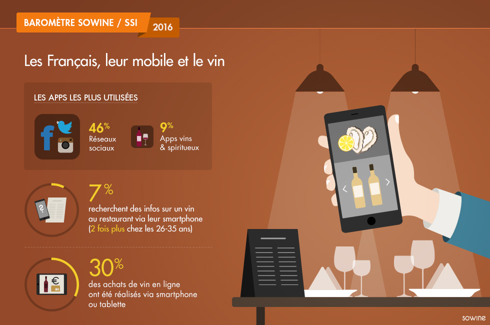 En 2016, 33% des Français possèdent au moins une application dédiée au vin sur leur smartphone ou tablette. Une proportion largement supérieure parmi les grands acheteurs (66%) et chez les jeunes (51%). 30% des achats de vin en ligne ont été réalisés via smartphone ou tablette, un chiffre légèrement en hausse par rapport à l’an dernier (28%).