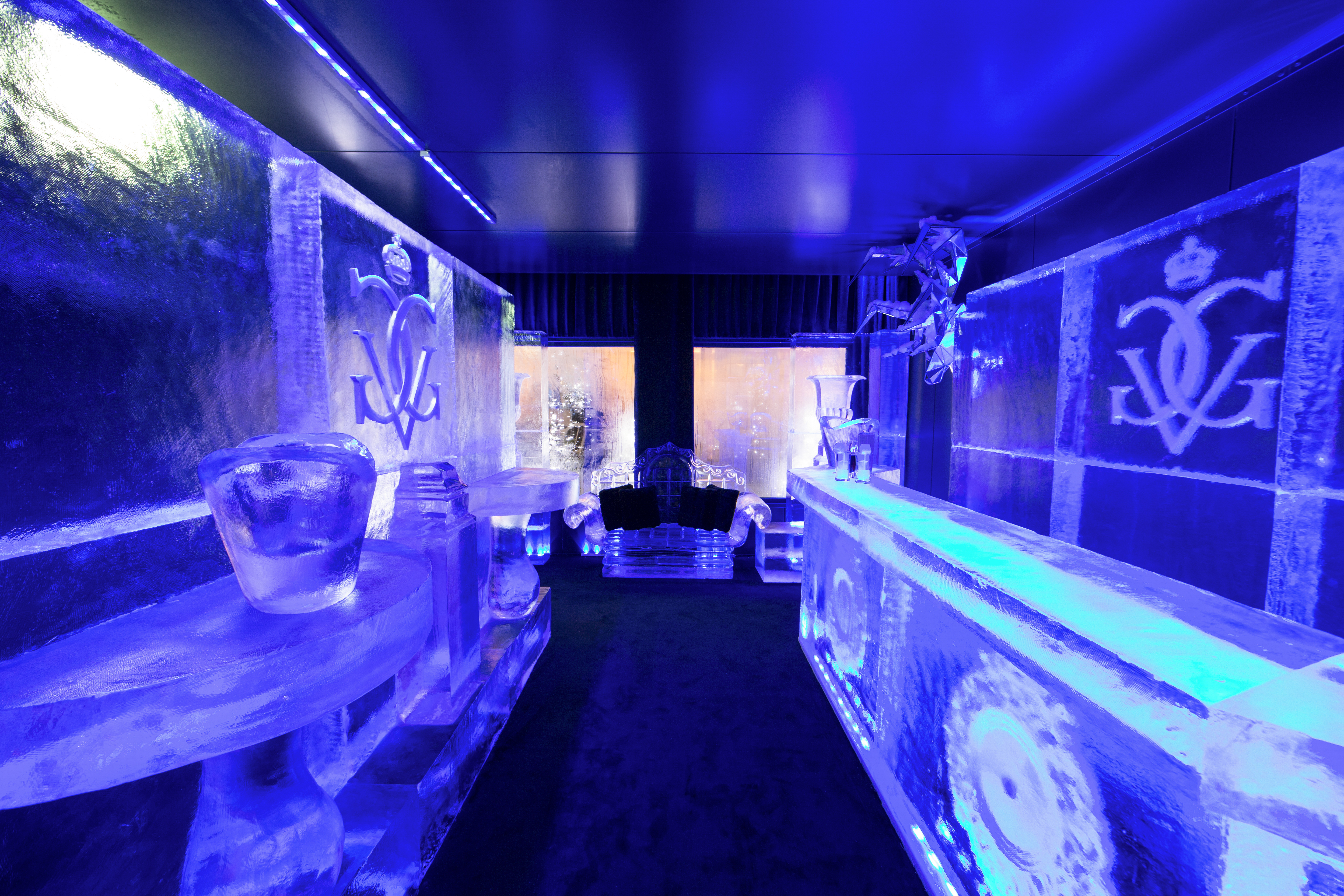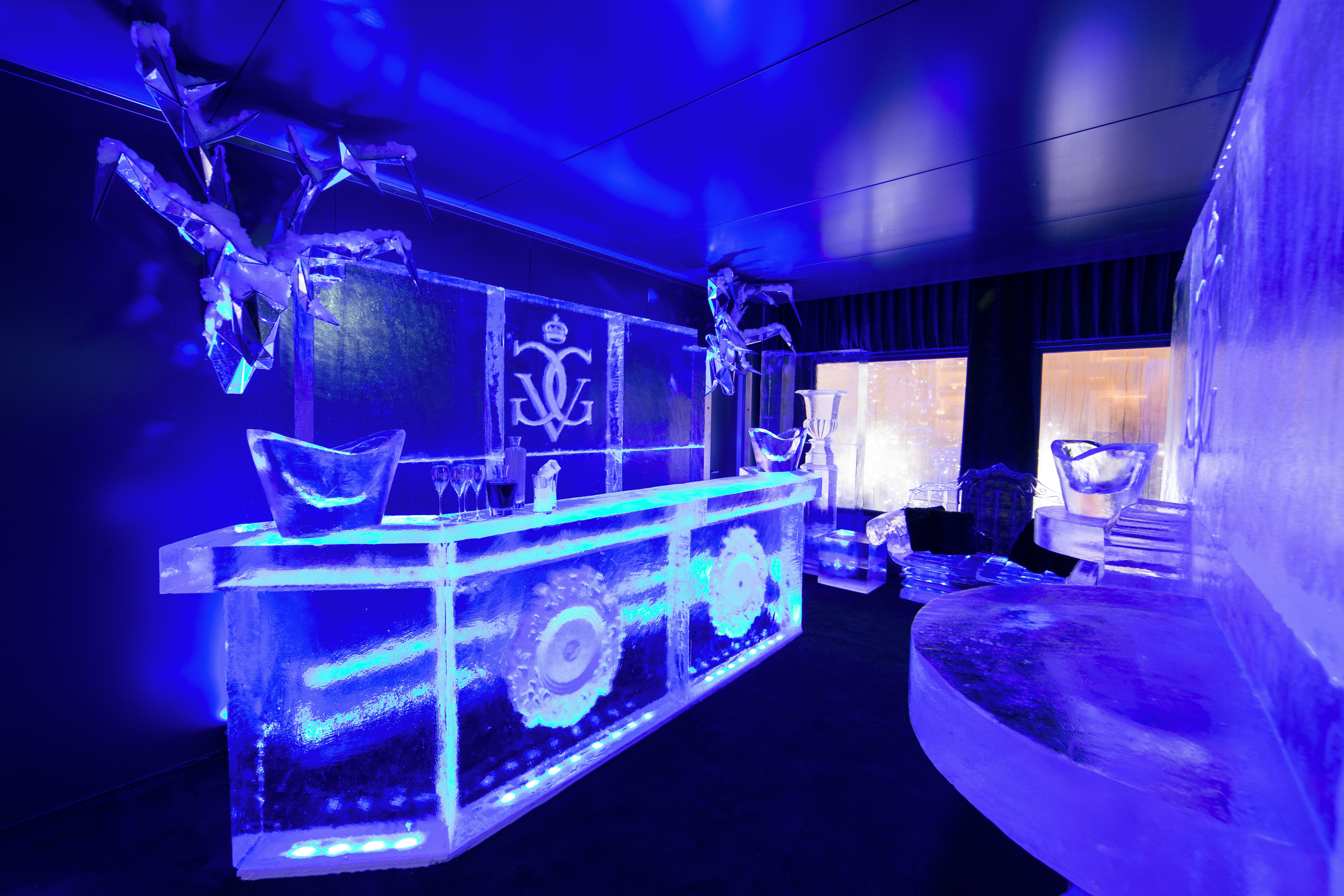Les fameux pingouins géants ont repris leur place et escortent fièrement ce Ice lounge de 36 m2 recouvert de miroir dans lequel, fleurs, transparence et glace sculptée se mêlent avec audace.