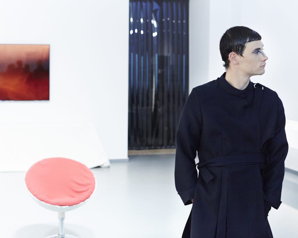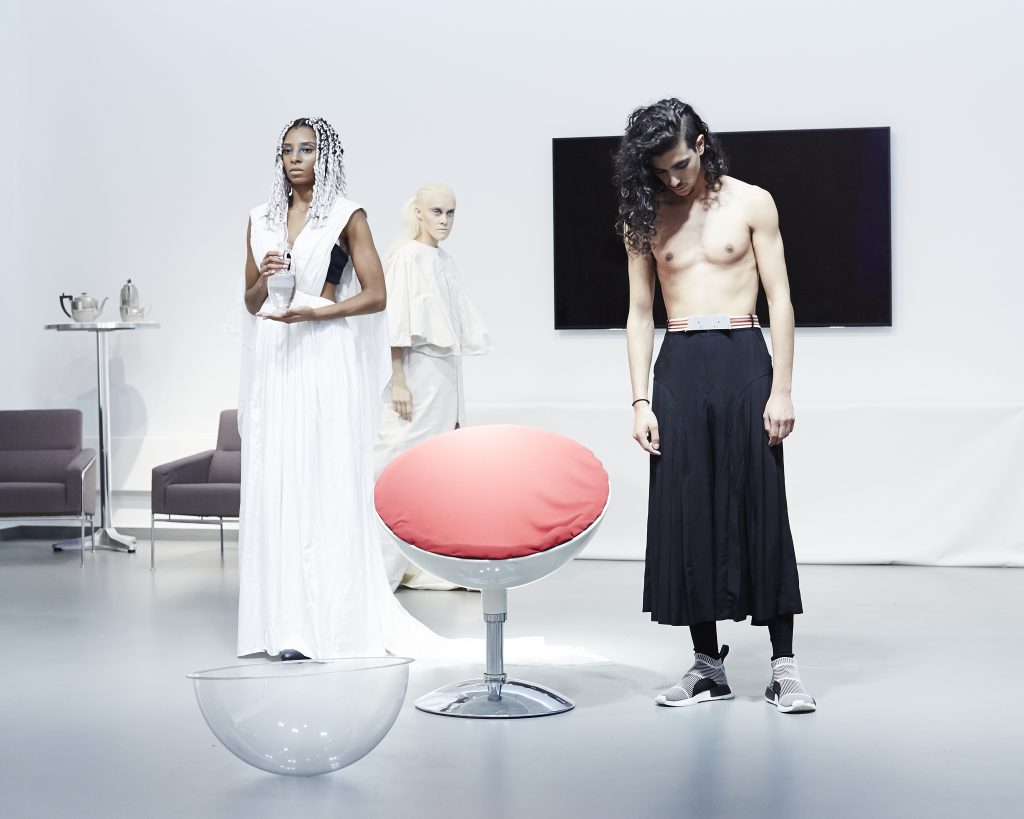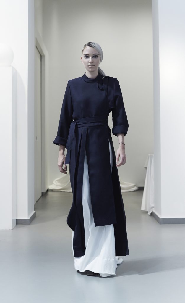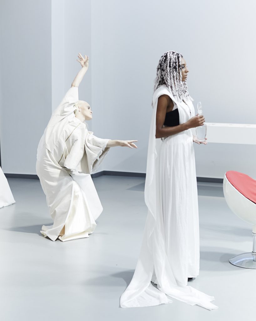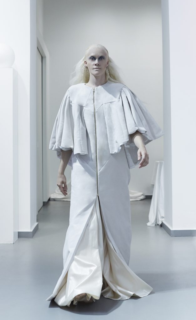 Les matières fluides, le jersey, la laine et le coton enduit symbolisent notre extraction terrestre, tandis que les tissus techniques issus du sportwear et imperméables ainsi que les finitions métallisées évoquent notre propension à nous tourner vers les sciences, abordant ainsi la construction d’objets célestes.