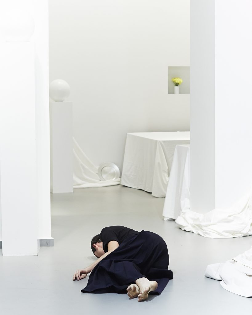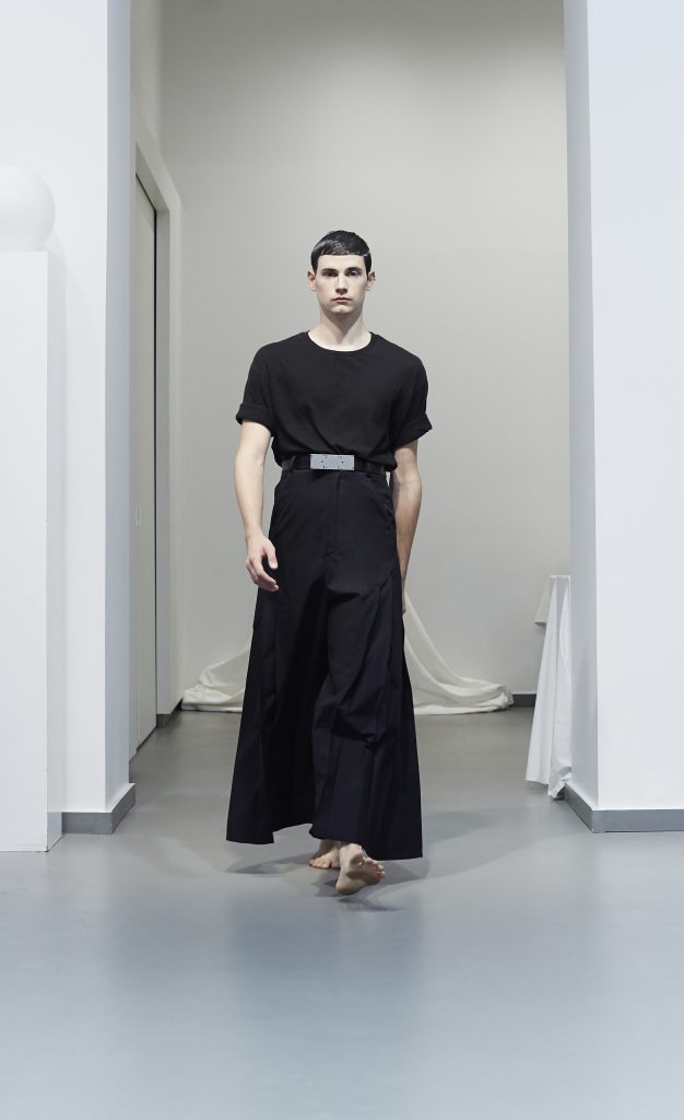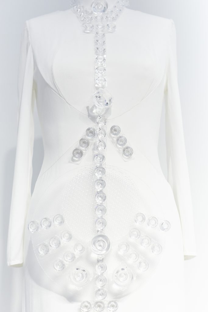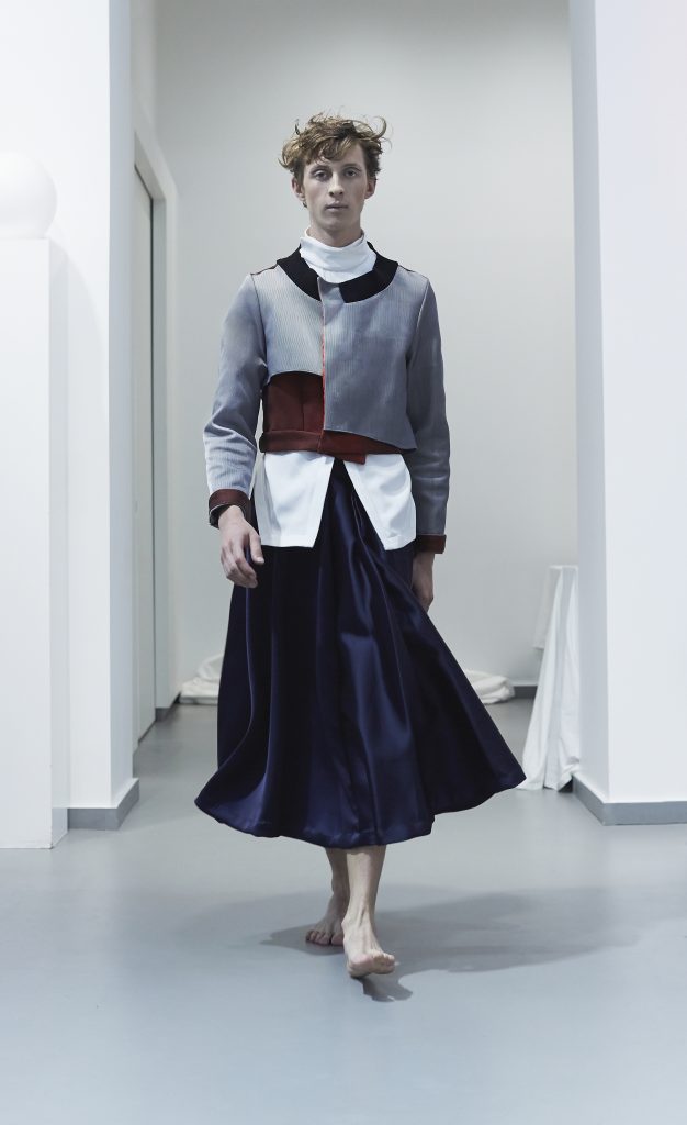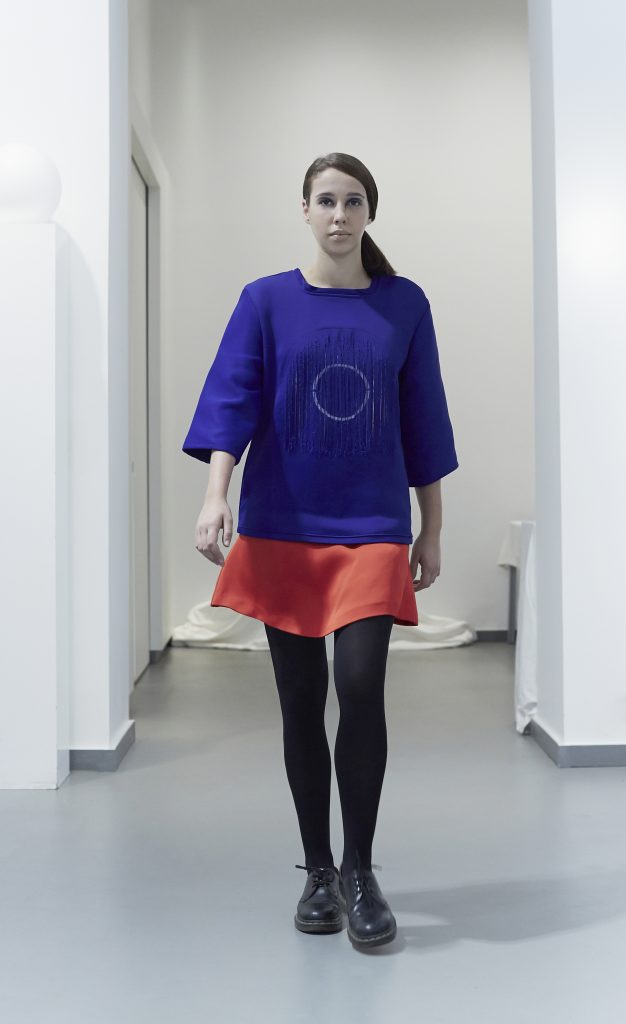 Les matières fluides, le jersey, la laine et le coton enduit symbolisent notre extraction terrestre, tandis que les tissus techniques issus du sportwear et imperméables ainsi que les finitions métallisées évoquent notre propension à nous tourner vers les sciences, abordant ainsi la construction d’objets célestes.
