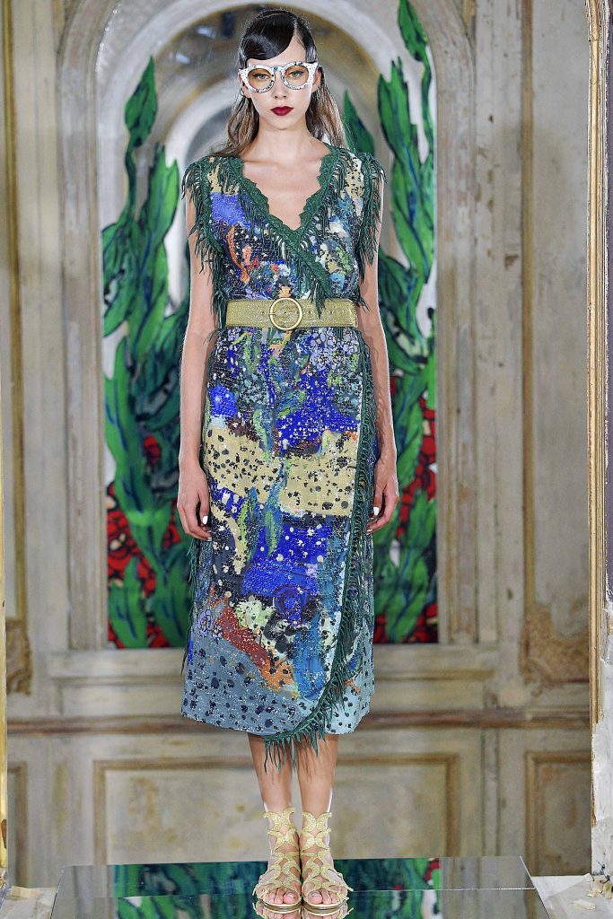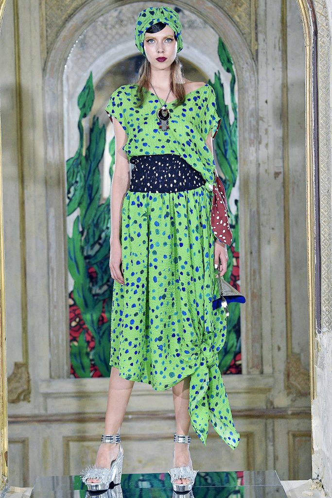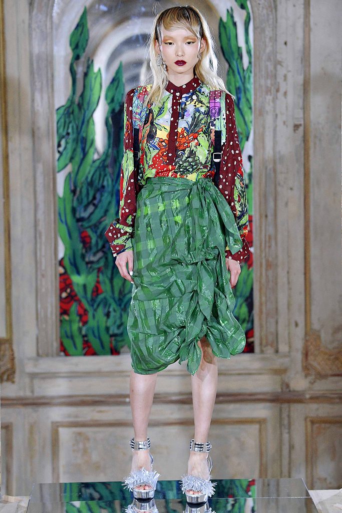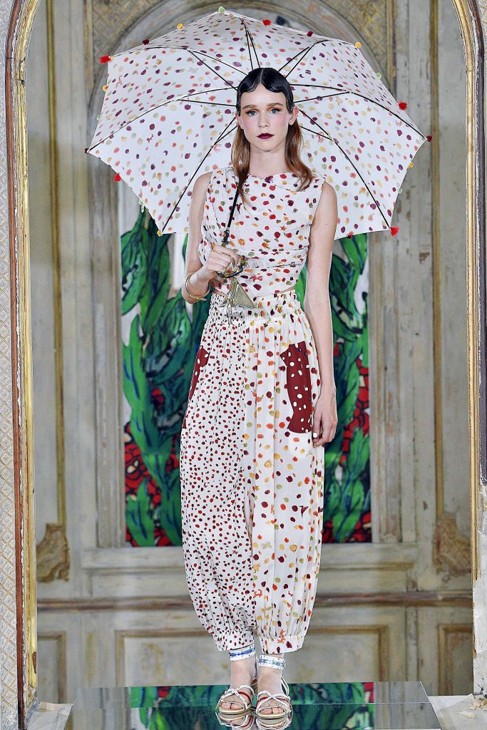 La créatrice japonaise peint aussi sa propre jungle imaginaire où une robe éléphant accompagne des tigres illustrés and des feuilles vertes luxuriantes. Les fleurs dansent sur des imprimés ou des sequins et Tsumori Chisato jouent avec les pois par une combinaison d’animaux et de pompons.