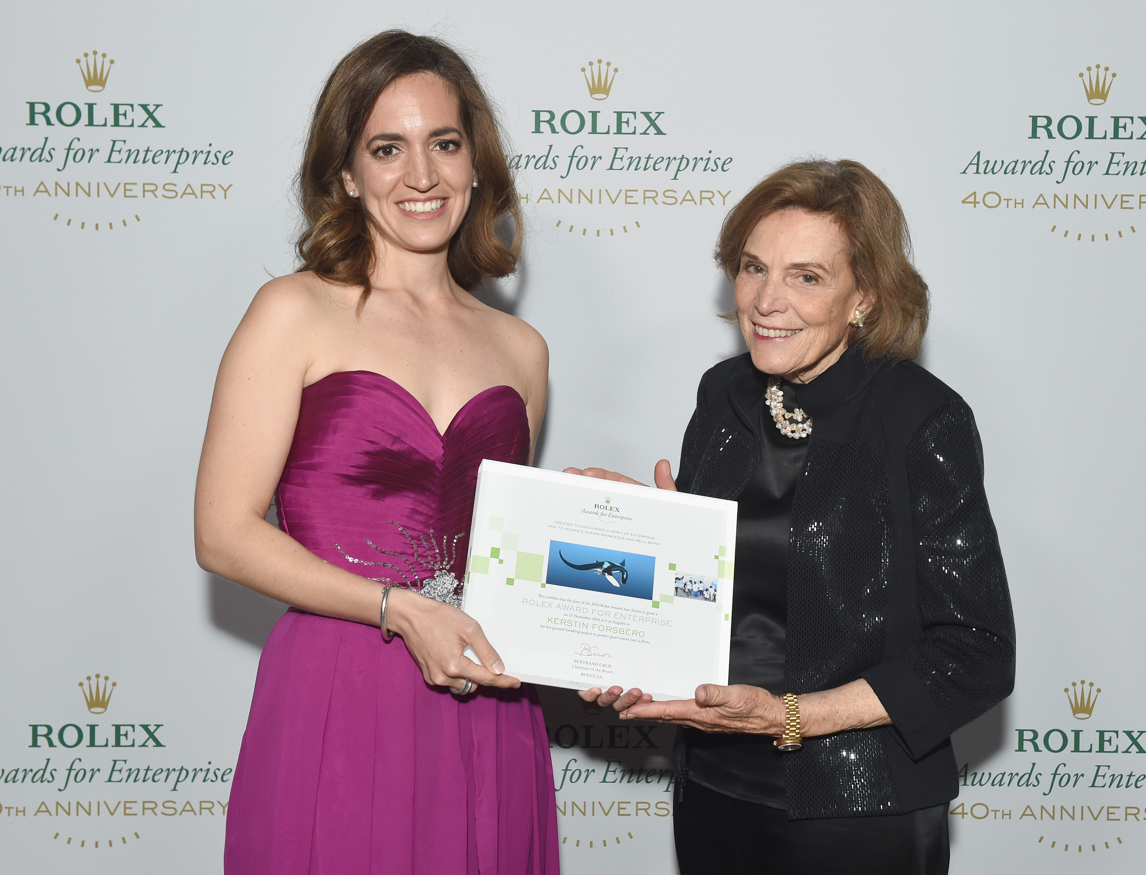 - HOLLYWOOD, CA – NOVEMBER 15: Honoree Kerstin Forsberg (L) and National Geogrphic Explorer-in-Residence/presenter Sylvia Earle poses with award at the 2016 Rolex Awards for Enterprise at the Dolby Theatre on November 15, 2016 in Hollywood, California. (Photo by Emma McIntyre/Getty Images for Rolex Awards for Enterprise )