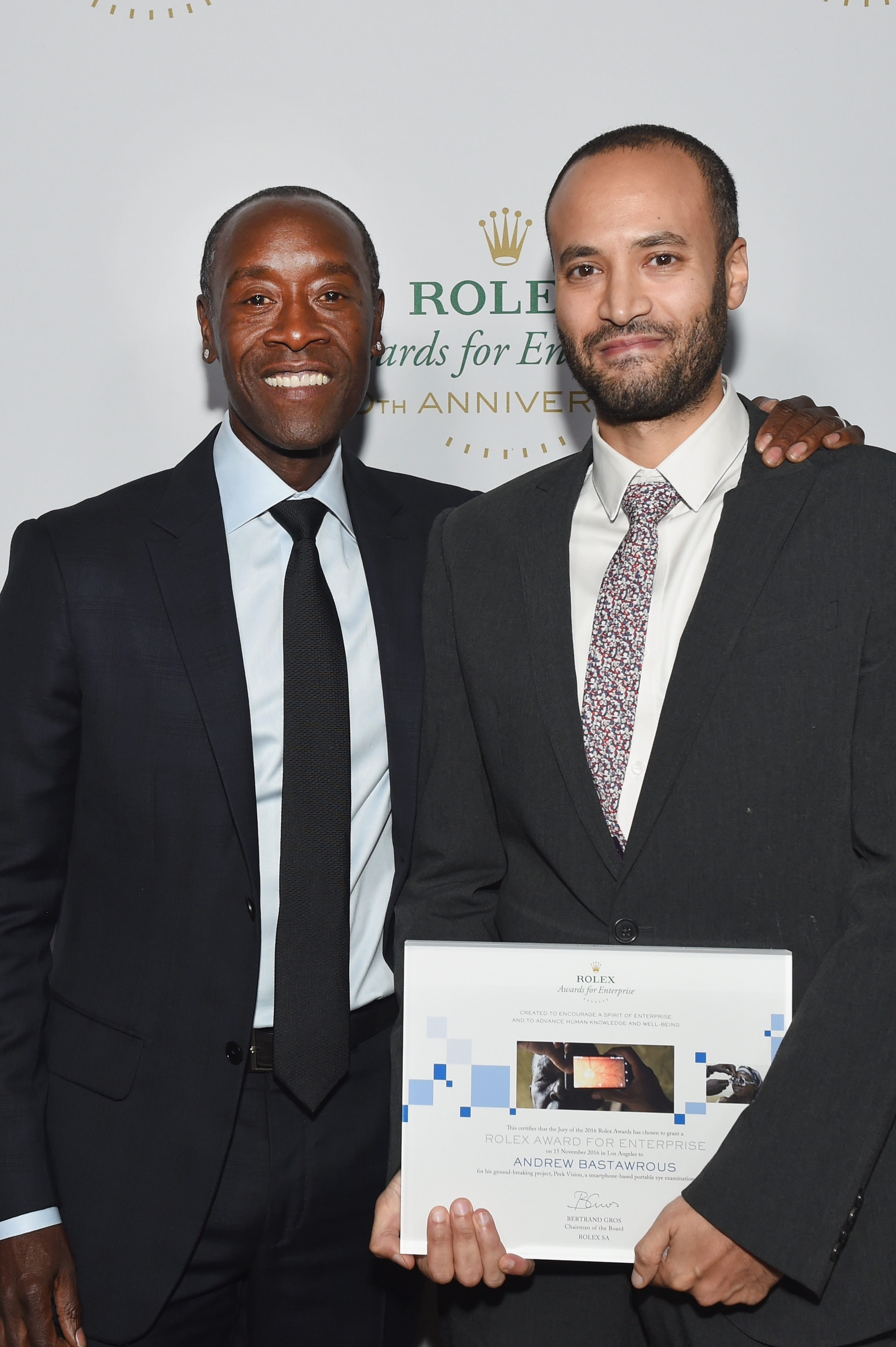 - HOLLYWOOD, CA – NOVEMBER 15: Actor/presenter Don Cheadle (L) and honoree Andrew Bastawrous pose with award at the 2016 Rolex Awards for Enterprise at the Dolby Theatre on November 15, 2016 in Hollywood, California. (Photo by Emma McIntyre/Getty Images for Rolex Awards for Enterprise )