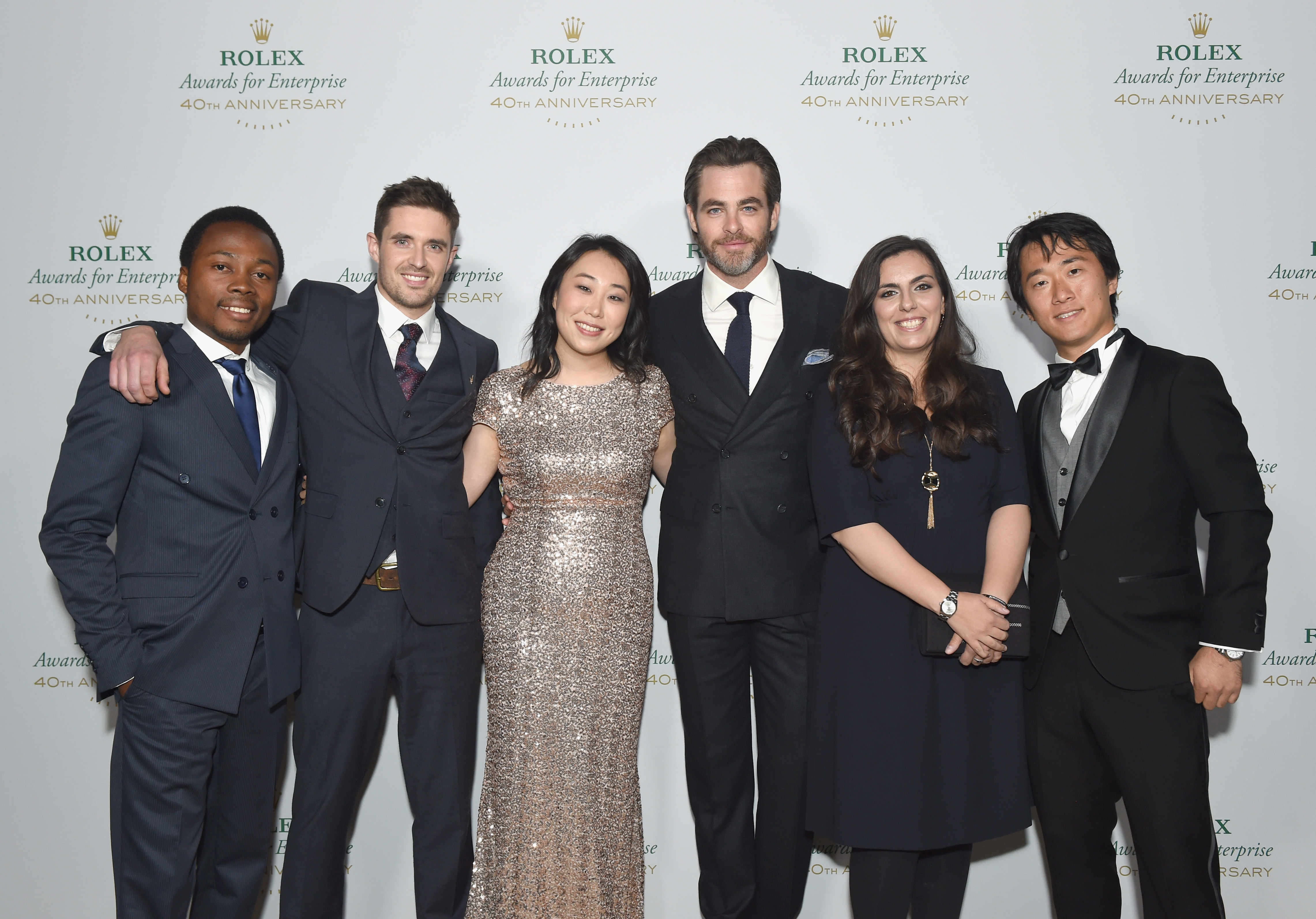 - HOLLYWOOD, CA – NOVEMBER 15: Actor and presenter Chris Pine (4th from L) and 2016 Young Laureates Oscar Ekponimo, Joseph Cook, Christine Keung, Sarah Toumi, and Junto Ohki attend the 2016 Rolex Awards for Enterprise at the Dolby Theatre on November 15, 2016 in Hollywood, California. (Photo by Emma McIntyre/Getty Images for Rolex Awards for Enterprise)