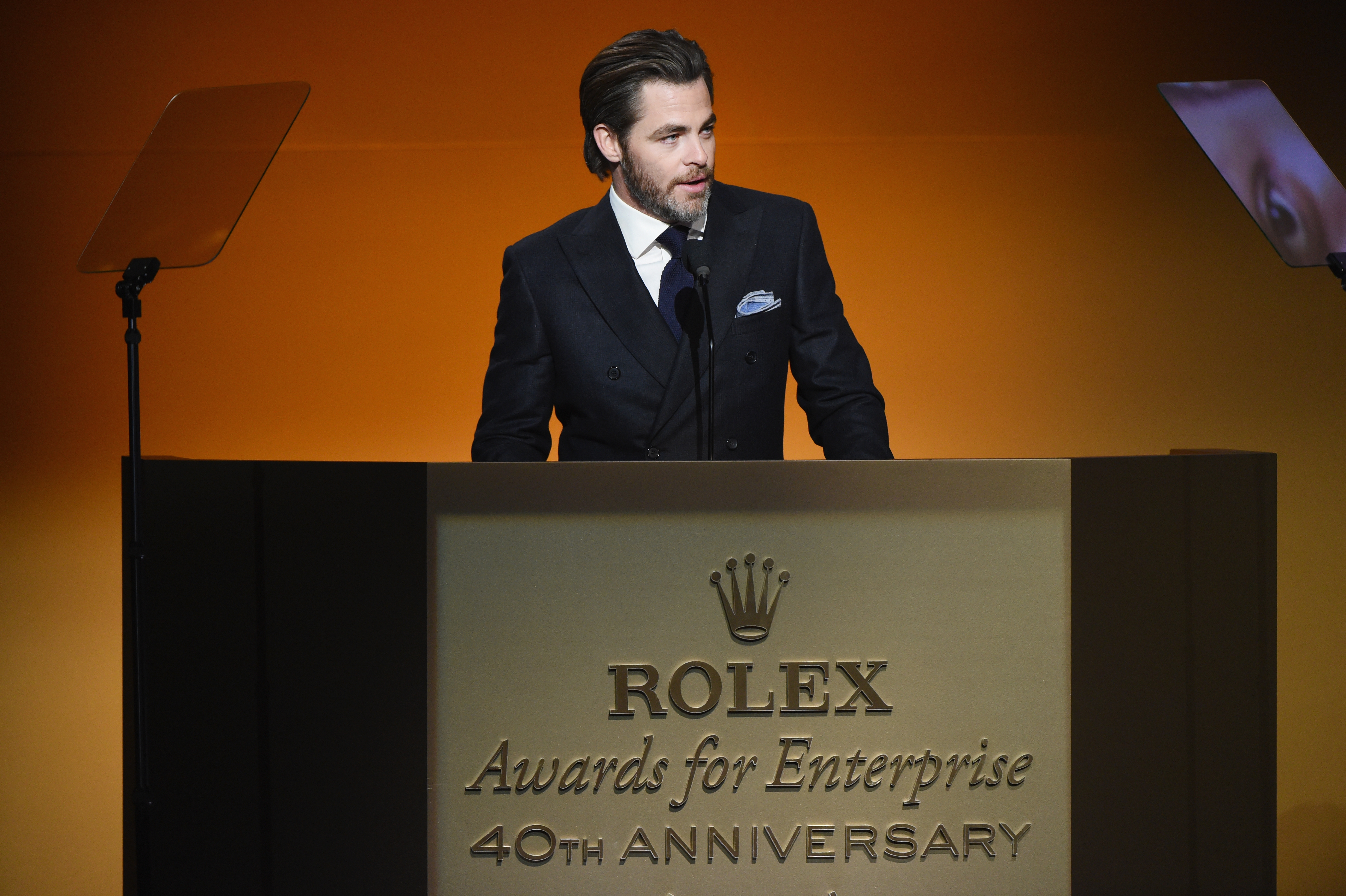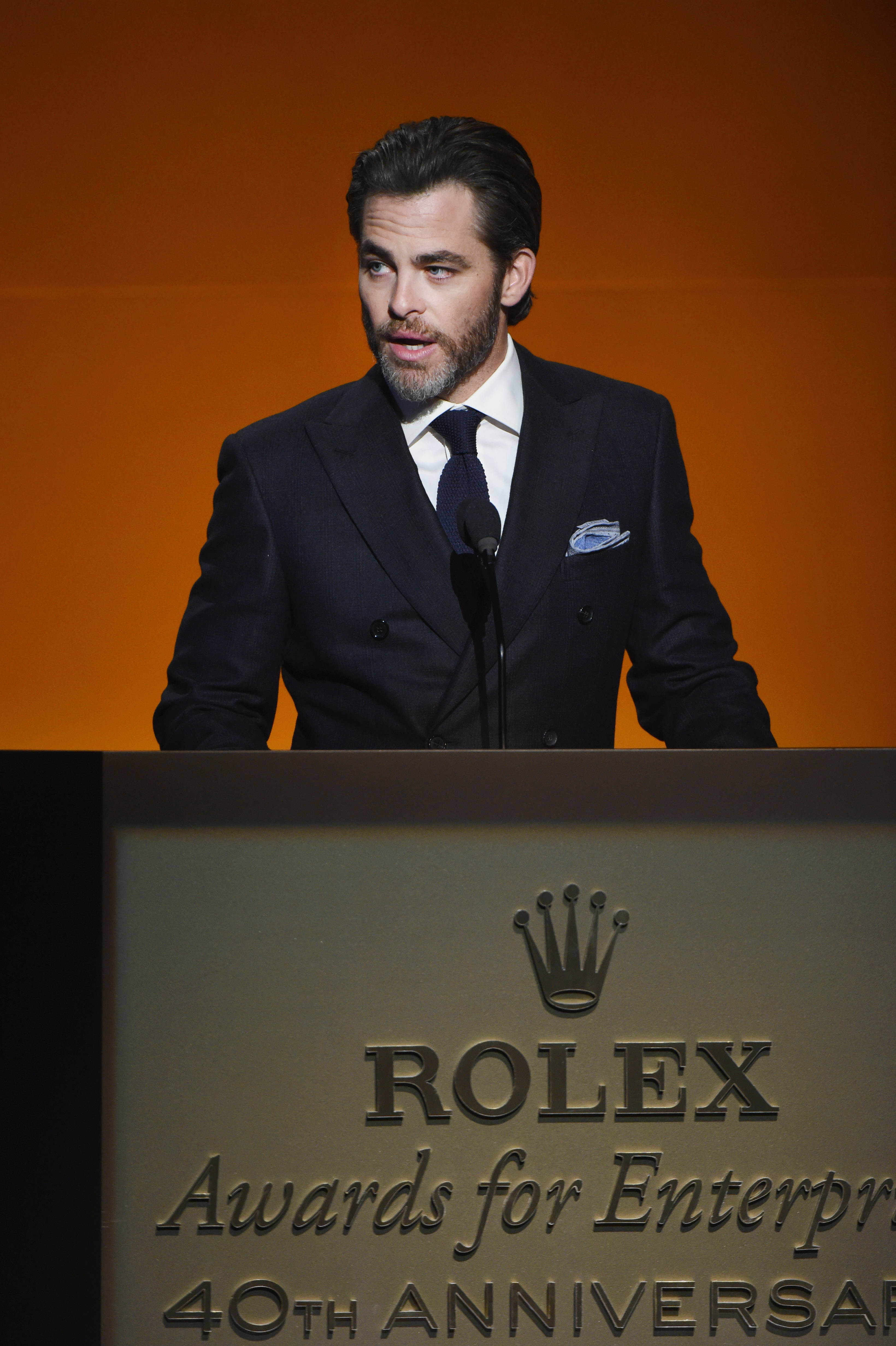 - HOLLYWOOD, CA – NOVEMBER 15: Actor/presenter Chris Pine speaks onstage during the 2016 Rolex Awards For Enterprise at the Dolby Theatre on November 15, 2016 in Hollywood, California. (Photo by Michael Kovac/Getty Images for Rolex Awards for Enterprise )