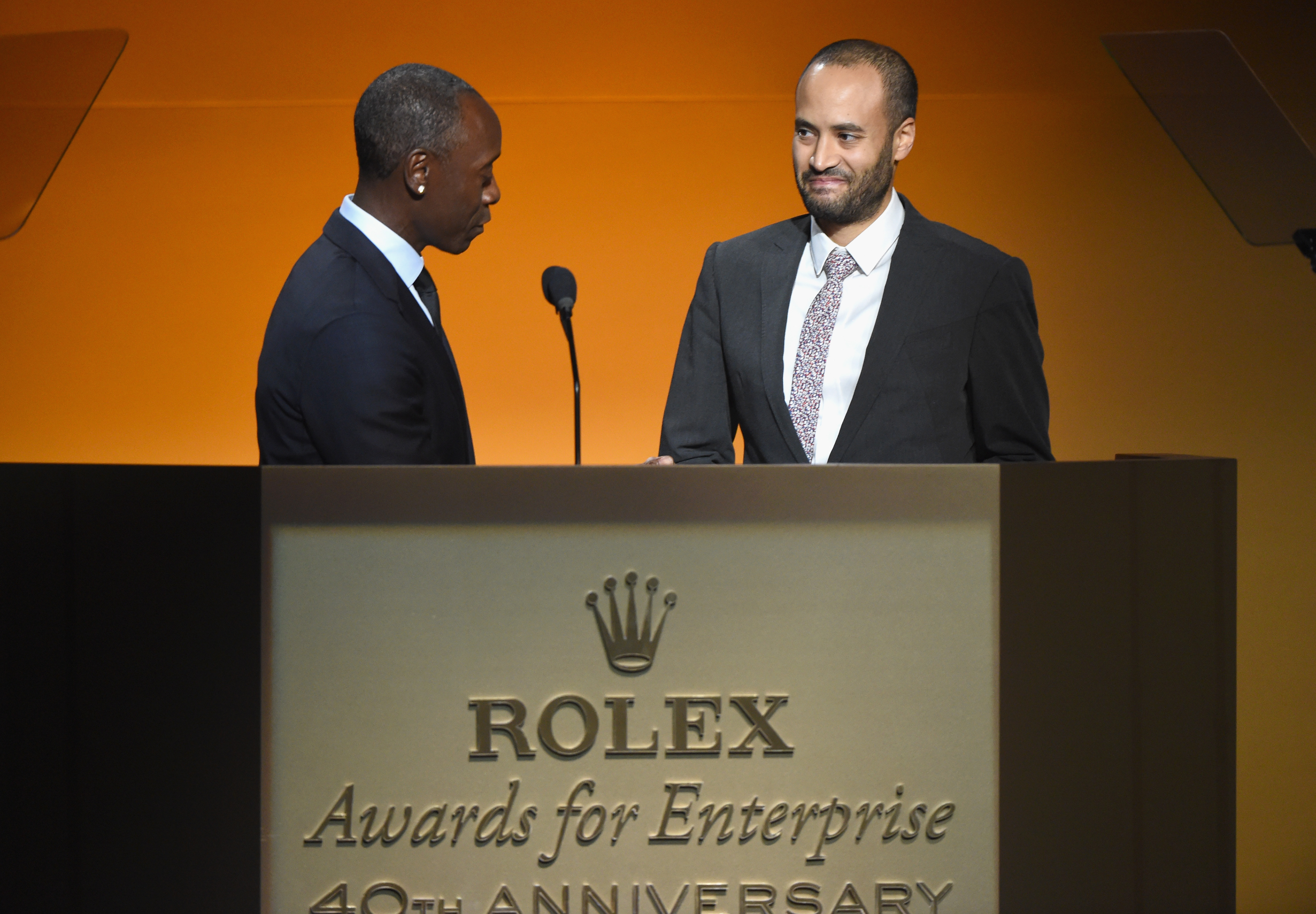 - HOLLYWOOD, CA – NOVEMBER 15: Actor/presenter Don Cheadle (L) and honoree Andrew Bastawrous onstage during the 2016 Rolex Awards For Enterprise at the Dolby Theatre on November 15, 2016 in Hollywood, California. (Photo by Michael Kovac/Getty Images for Rolex Awards for Enterprise )