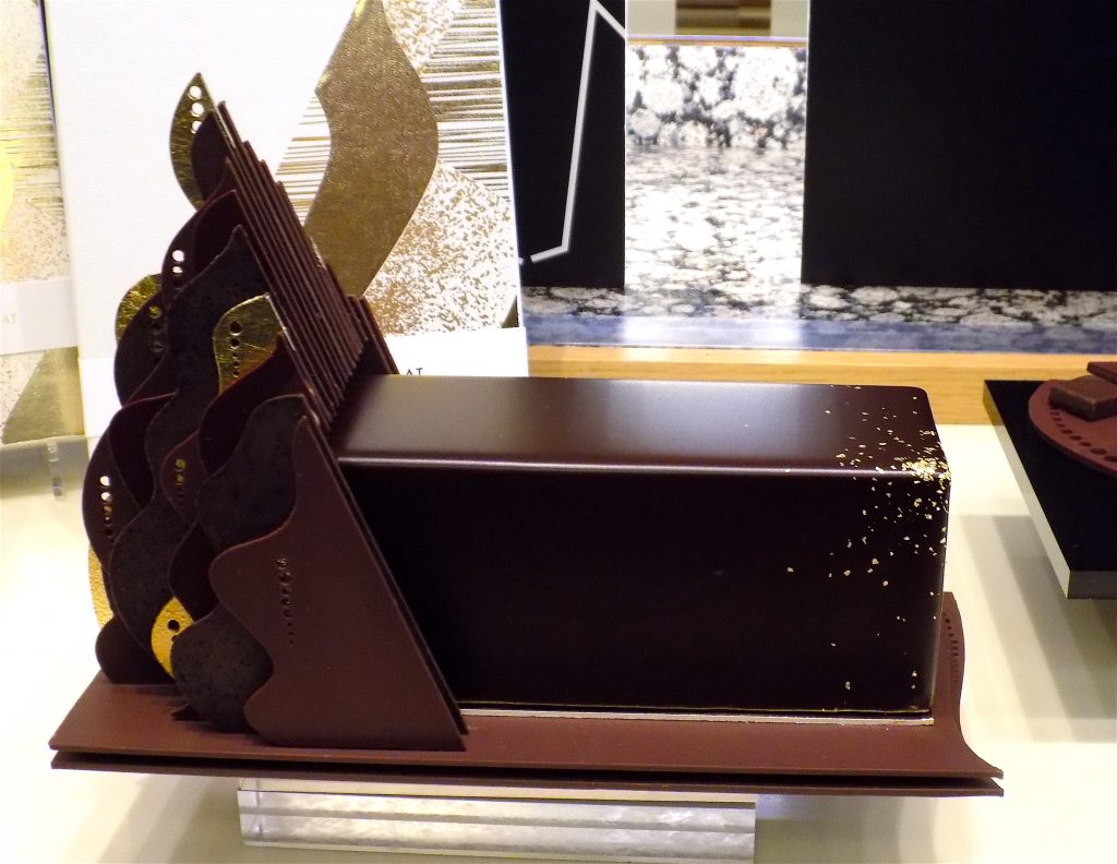 La Bûche Volupté se pare de 17 plaques de chocolat. Recherche d’accords inédits, avec des saveurs presque à contrapposto, recherche de textures, le résultat séduit immanquablement. Un biscuit cacao et des fruits exotiques font émerger des sensations nouvelles.