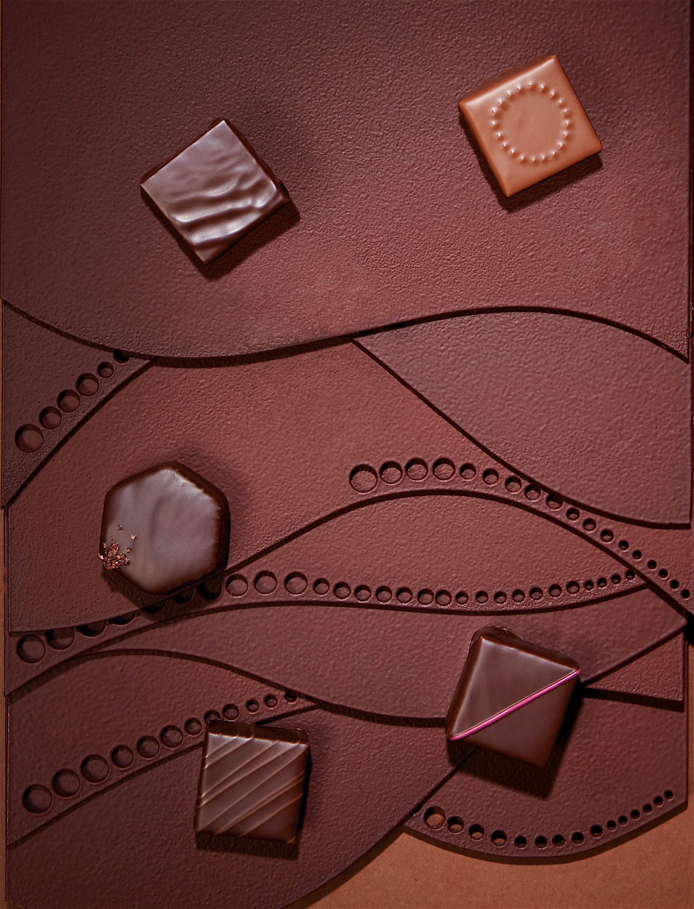 Nicolas Cloiseau, a capté la féerie de Noël fêtées autrement. Cette année, il a résolument opté pour l’Extravagance, ses Extravagances, celles des couleurs, des goûts, des formes. Dans un jeu graphique, il crée la surprise par un effet de matitude et de brillance, entre chocolats et effets d’optique.