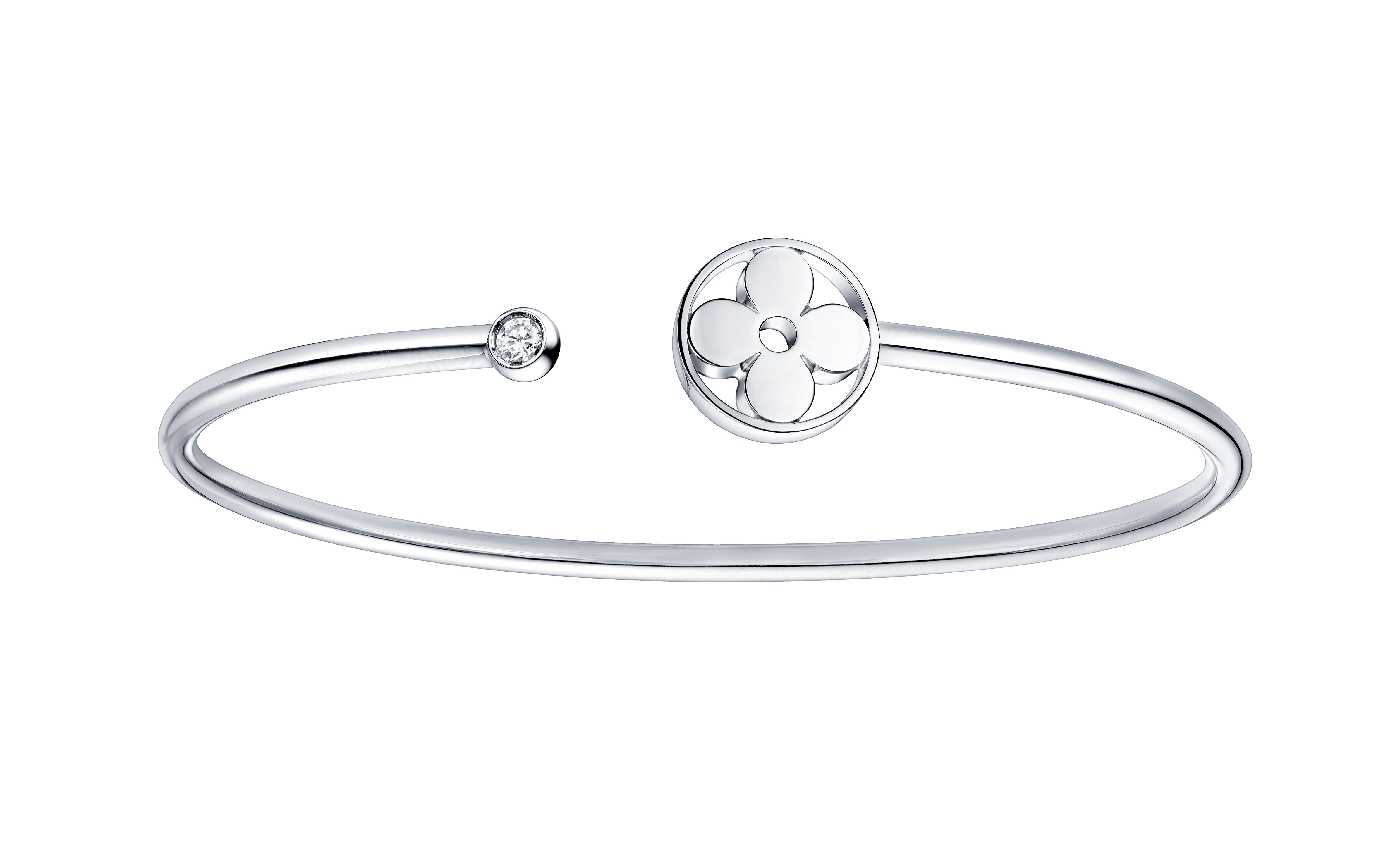 Les trois Fleurs de Monogram, symboles de la Maison Louis Vuitton, se déclinent au fil des collections. Libres ou enchâssées dans un cercle ou un losange, elles sont toujours les mêmes, et pourtant jamais tout à fait identiques. Elles se greffent cette fois-ci, sur un bracelet ouvert simplissime. Un jonc en trois couleurs d’or, rose, blanc ou jaune, dont elles terminent l’une des extrémités tandis que sur l’autre, en face à face, brille un diamant serti clos.
