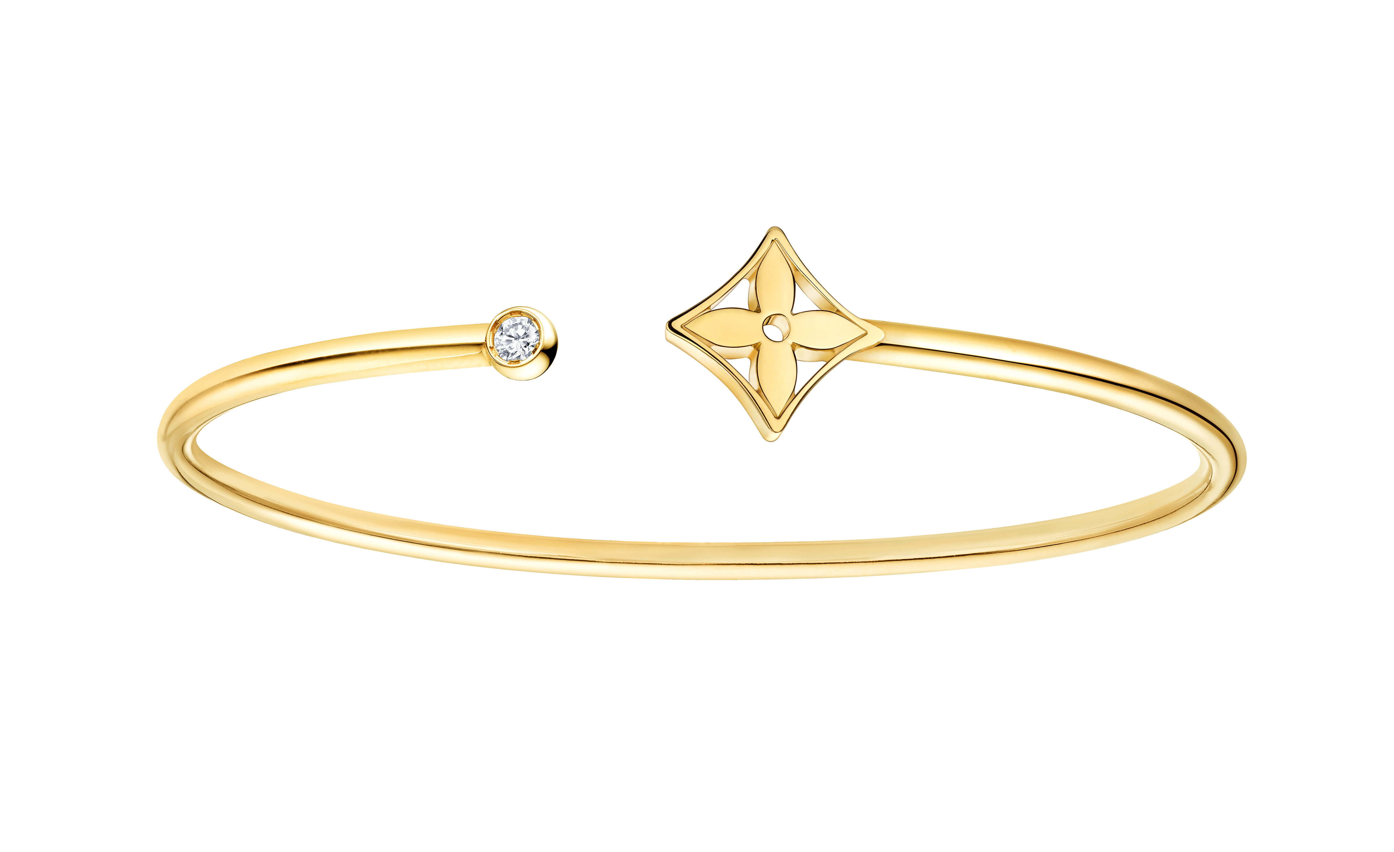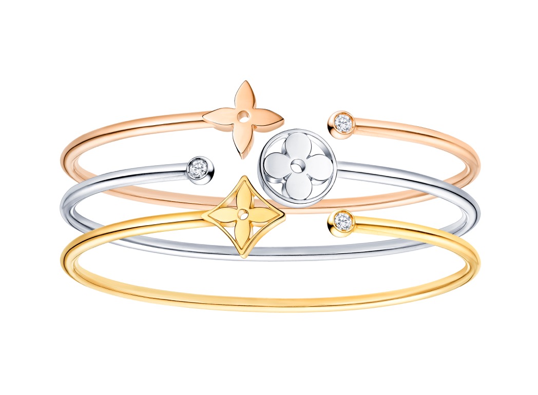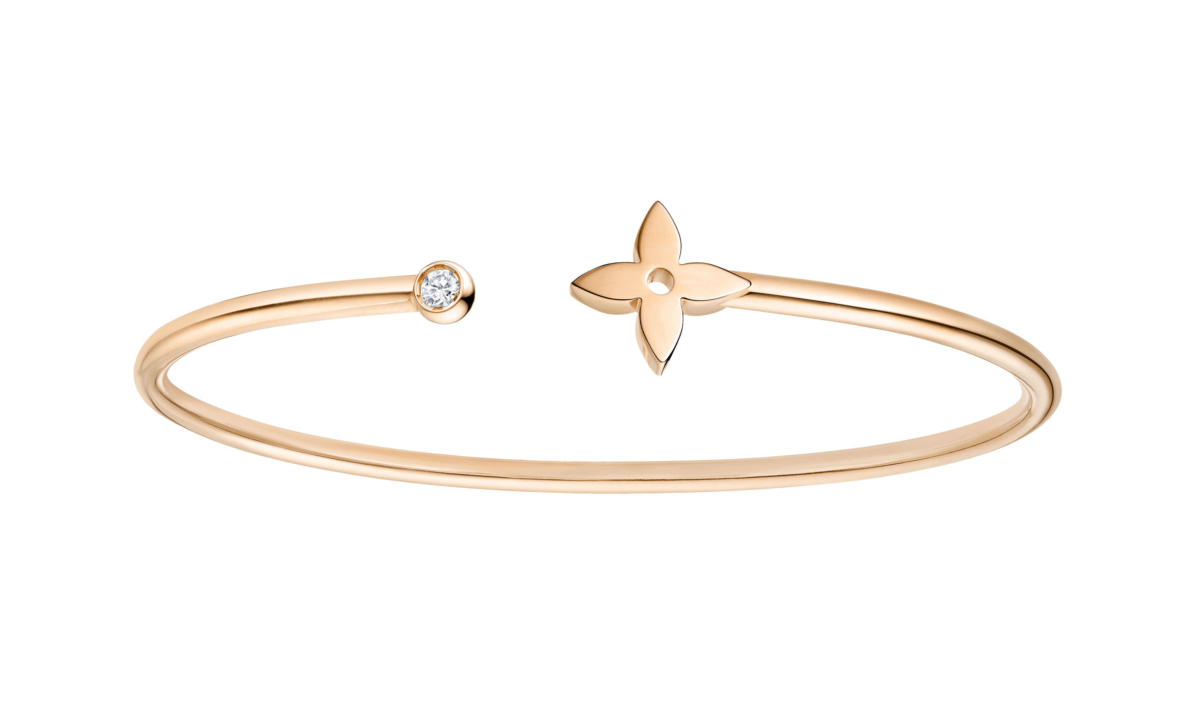 Les trois Fleurs de Monogram, symboles de la Maison Louis Vuitton, se déclinent au fil des collections. Libres ou enchâssées dans un cercle ou un losange, elles sont toujours les mêmes, et pourtant jamais tout à fait identiques. Elles se greffent cette fois-ci, sur un bracelet ouvert simplissime. Un jonc en trois couleurs d’or, rose, blanc ou jaune, dont elles terminent l’une des extrémités tandis que sur l’autre, en face à face, brille un diamant serti clos.