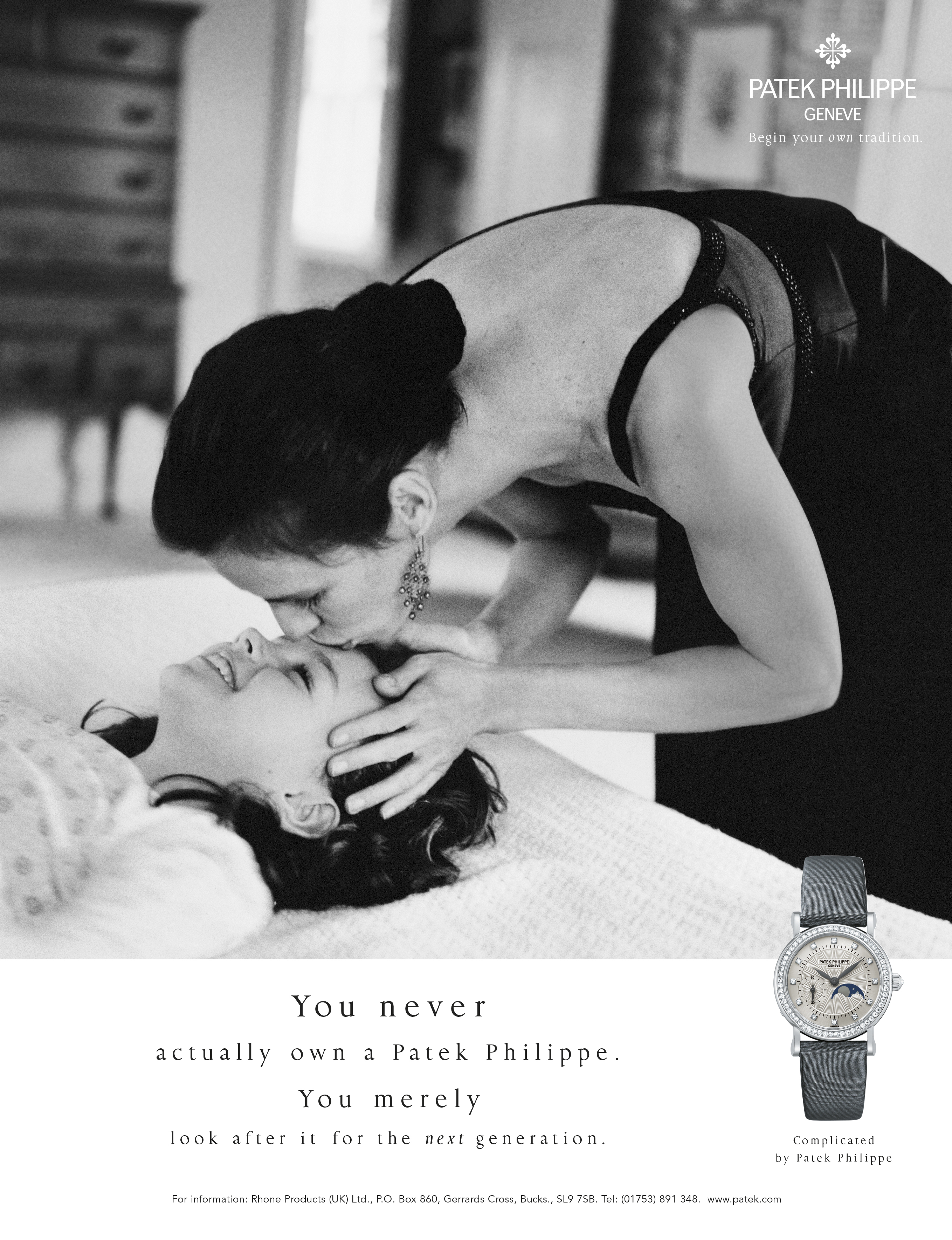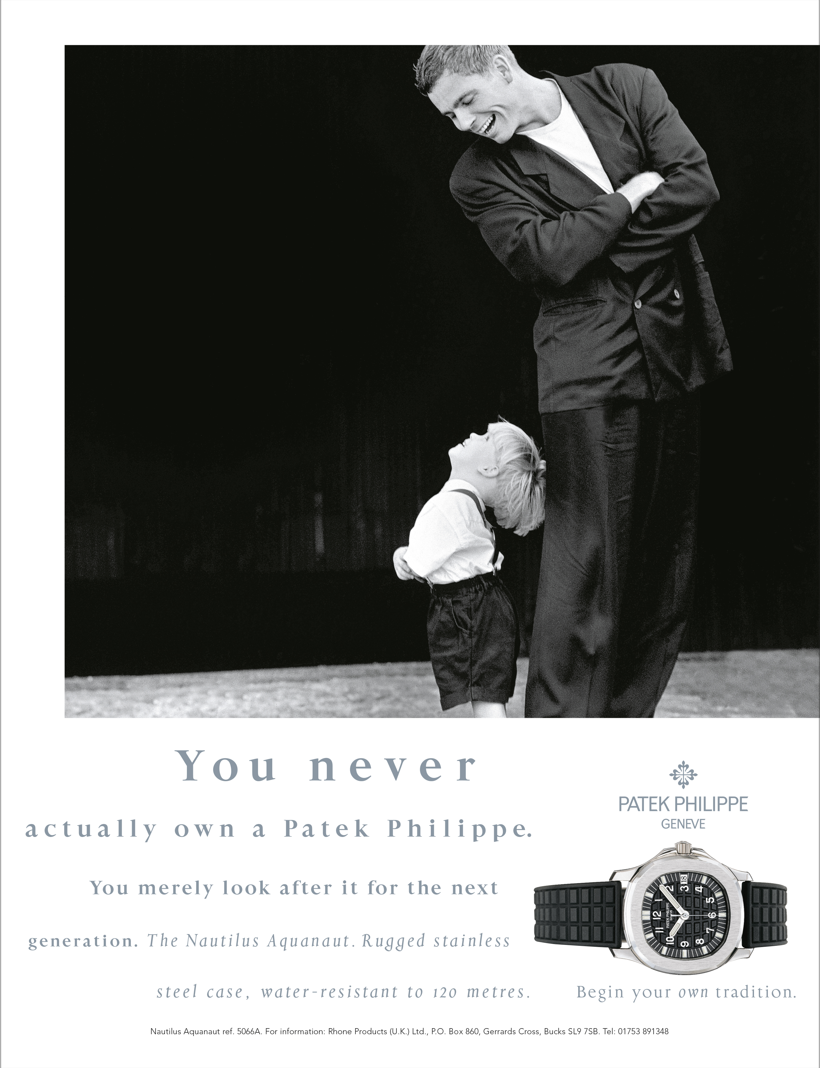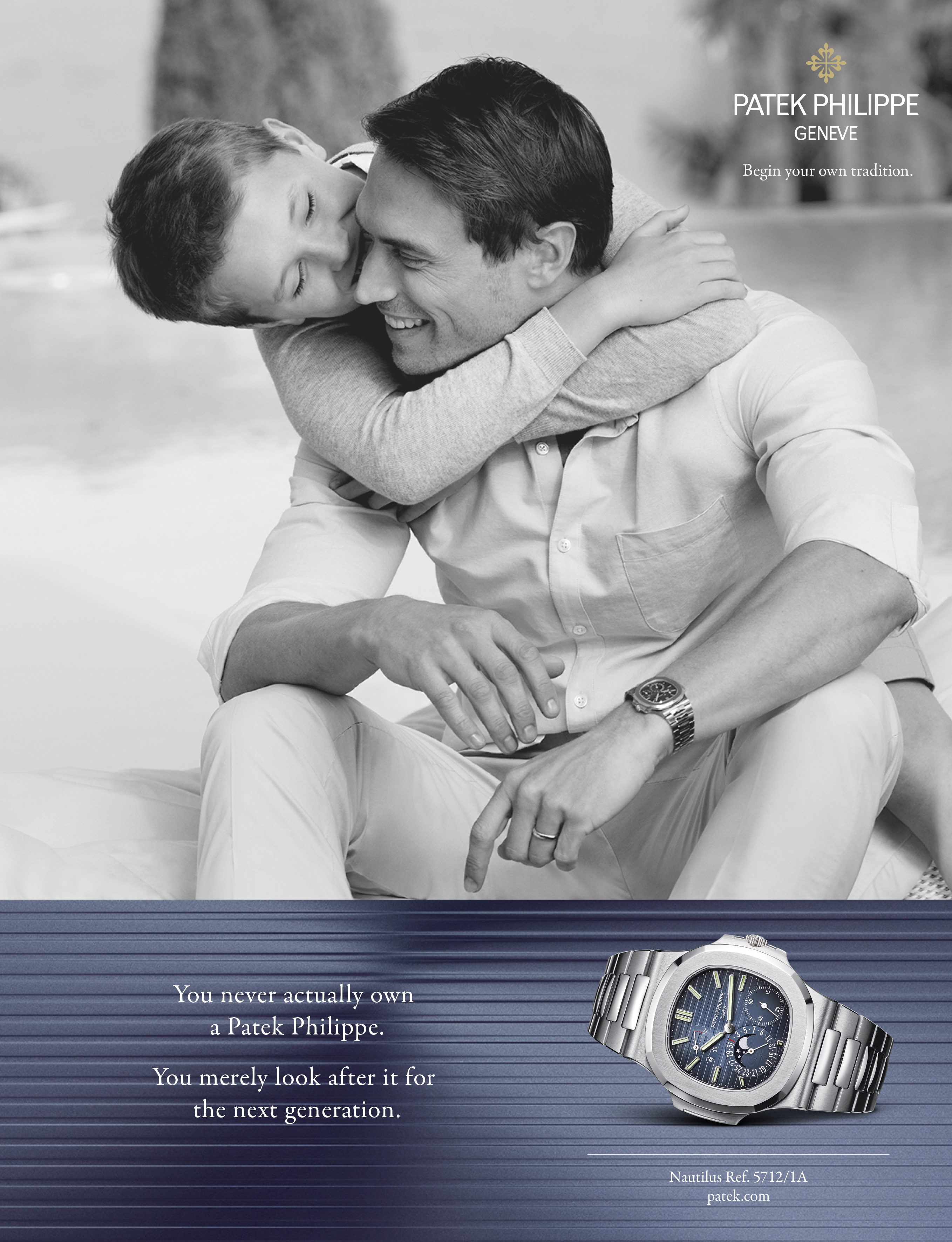Campagne publicitaire Générations: un message fort et universel Lancée à l’automne 1996, la campagne d’annonces Générations tranchait avec la publicité horlogère de l’époque par son approche résolument émotionnelle. Elle mettait en effet l’accent sur le lien fort et unique unissant tout propriétaire d’une Patek Philippe à sa montre. Cette certitude de posséder une création d’exception, reflet d’un riche héritage culturel, artistique et scientifique. Cette conscience d’avoir acquis un objet de valeur, conçu pour durer et accompagner plusieurs générations. Mettant en vedette le client plutôt que le produit, cette approche originale développée par l’agence londonienne Leagas Delaney se démarquait également de la communication traditionnelle pour l’horlogerie de très haut de gamme par deux autres aspects. Au lieu de s’intéresser à ses destinataires sous l’angle du statut économique ou professionnel, elle se concentrait sur leur personnalité privée, sur l’expression de leurs émotions, dans le cadre familial. Et loin de refléter une image passéiste, elle offrait une vision dynamique, tournée vers l’avenir – incarnée dans le slogan «Fondez votre propre tradition». Pour illustrer ce concept inédit, la campagne s’est basée sur des visuels photographiques évoquant les rapports privilégiés entre pères et fils ou mères et filles. Des moments de complicité entre générations. Des instants d’apprentissage et de transmission. Piano à quatre mains, premier nœud de cravate, premier rasage, parties de pêche à deux, découvertes sportives, regards échangés: autant d’expériences intimes et précieuses dans lesquelles chacun et chacune se reconnaissent. Autant d’images en noir-blanc, au style intemporel, complétées par un slogan un peu provocateur («Jamais vous ne posséderez complètement une Patek Philippe. Vous en serez juste le gardien, pour les générations futures.») et par la présence discrète de la montre.
