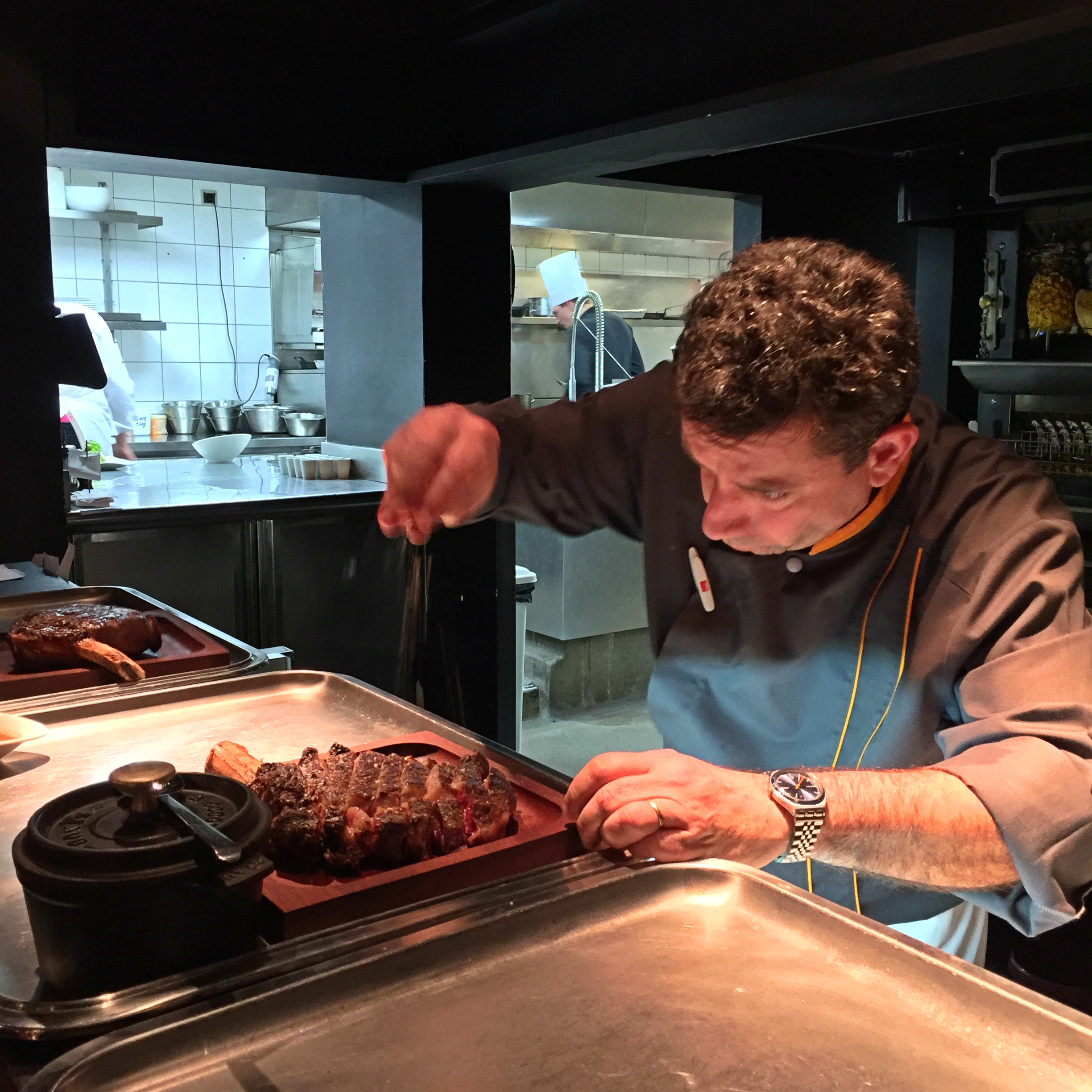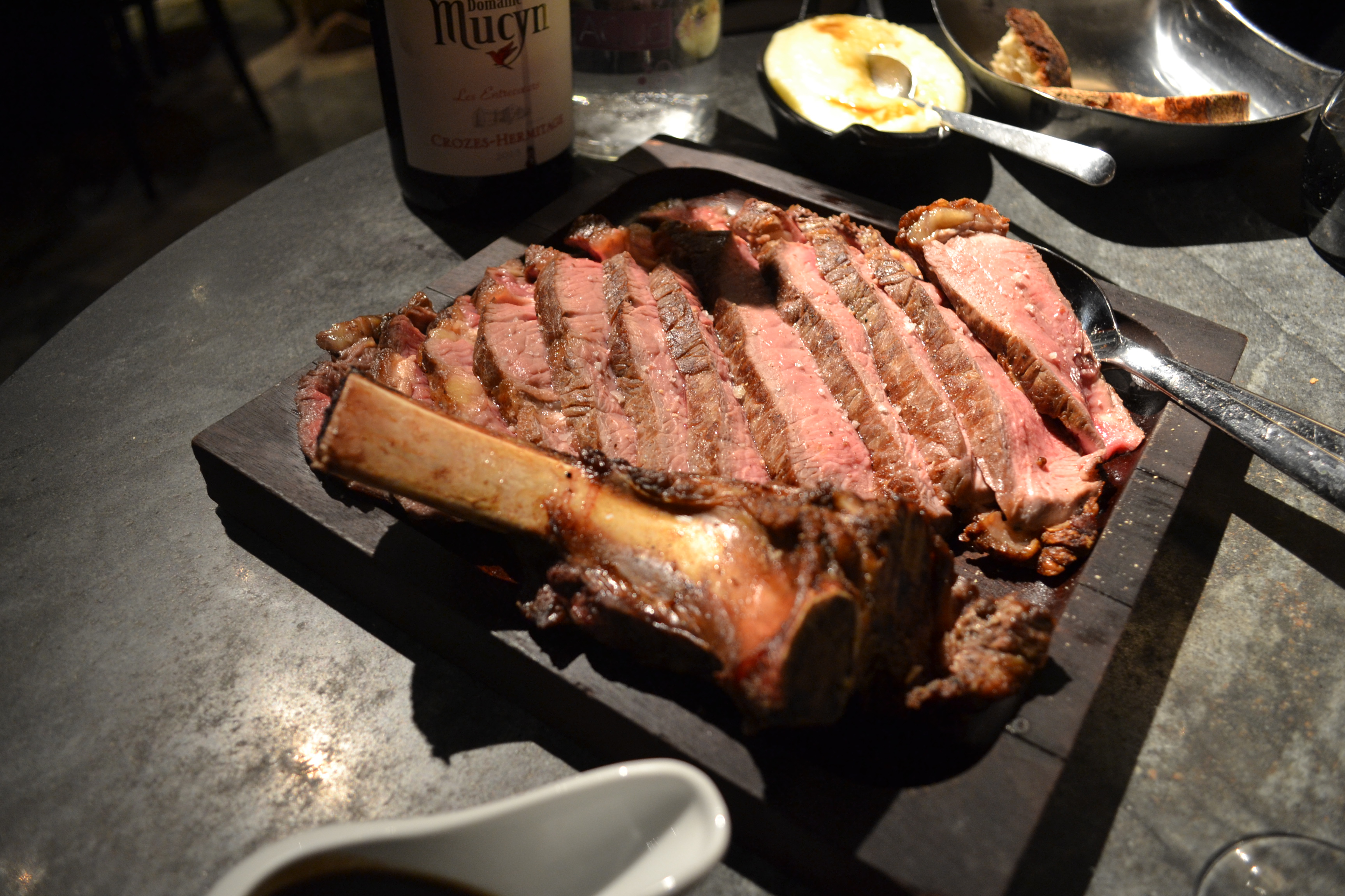 Ensuite, vient le plat de résistance et là, c’est du sérieux. Emmanuel Monsallier est le chef qui prépare les viandes. On se laisse tenter par l’énorme côte de bœuf pour deux personnes. Saignante, c’est un vrai régal. Avec un Crozes-Hermitage, l’alliance est parfaite. Les garnitures : purée ou langues d’oiseaux changent un peu de l’ordinaire.