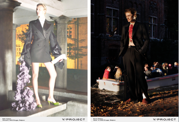Une durne lueur apparait : Glenn Martens , glaneur des cultures, arrivée par hasard dans la mode et profondément habité par Bruges . Dans son musée imaginaire, les accents gothiques de la ville médiévale, froide et majestueuse s’immiscent au milieu des baraques à frites et boutiques de souvenirs clinquantes pour touristes. Ressort de la ville qui séduit Martens. La rencontre de la peinture flamande et d’une affiche Miss Tuning : c’est un peu ça le projet Y/project. Plus de hiérarchies entre les cultures: notre génération est parvenue à tout renverser. Du moins on l’espère. Y/Project nous en donne l’illusion.