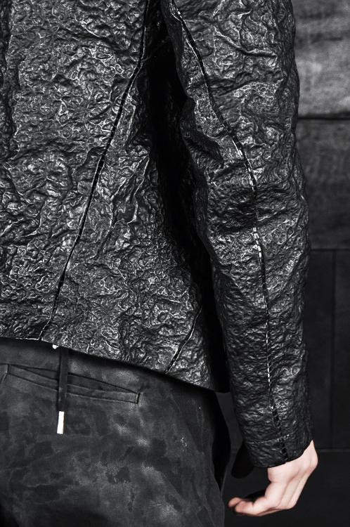 L’image ne montre pas ce que l’on croit. Le vêtement n’est plus porté comme on se l’était imaginé et persuadé. Il se suffit à lui-meme. Un corps à la recherche d’un autre-mais pas celui d’un androïd . L’histoire de la vie, l’histoire de la mode : une sculpture souple et flottante, une pièce unique qui ne demande qu’a s’unir à un corps qui vie, et vagabonde dans la rue. Boris Bidjan tire son inspiration de la culture skateboard. Là où les espaces ne sont la propriété de personne. De cette référence, il prélève le besoin d’adrénaline et la précision requise, sans laquelle il est impossible de s’élancer : sans laquelle on s’écrase sur le bitume. Une texture qui rappelle l’aspect des vestes de sa dernière collection.