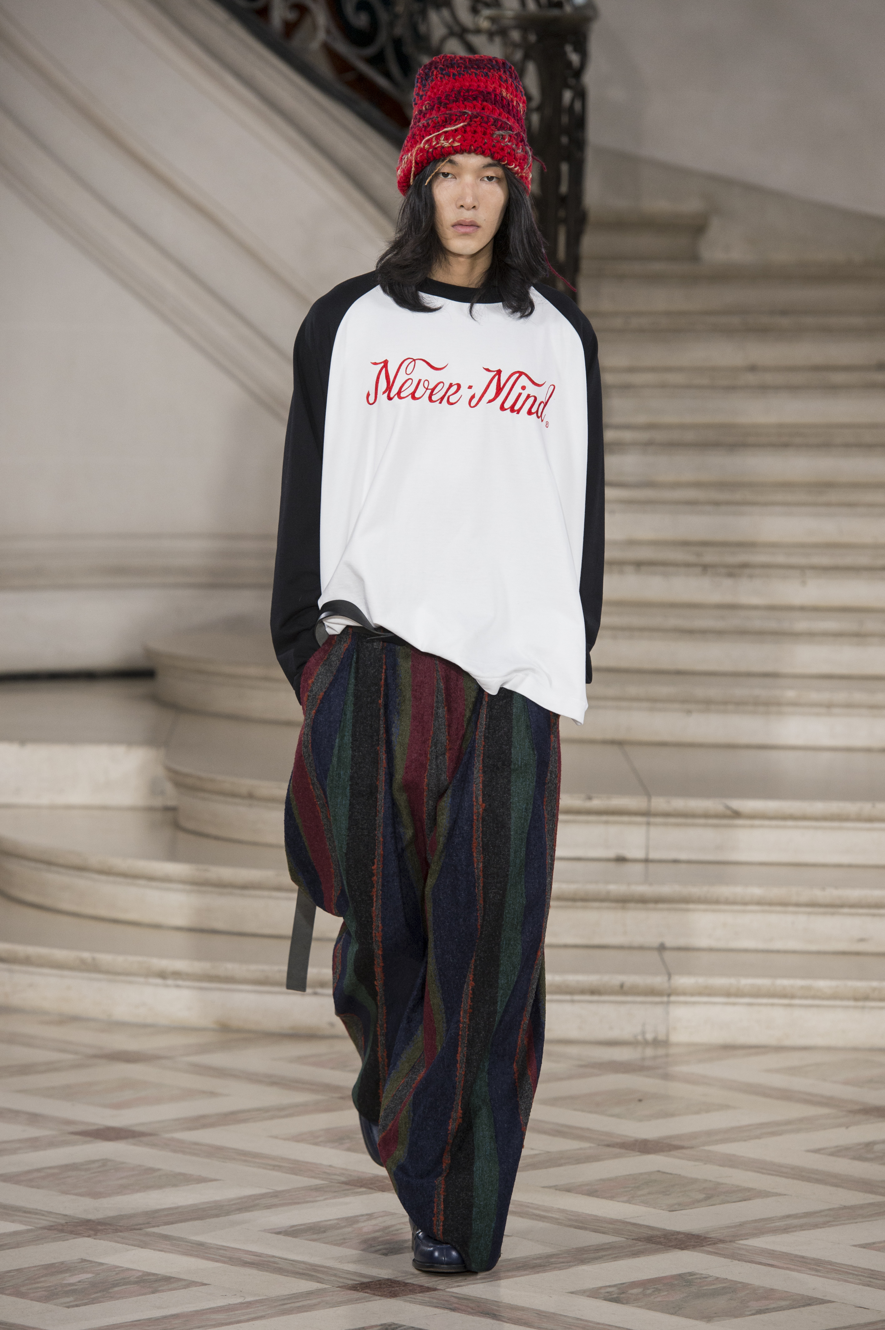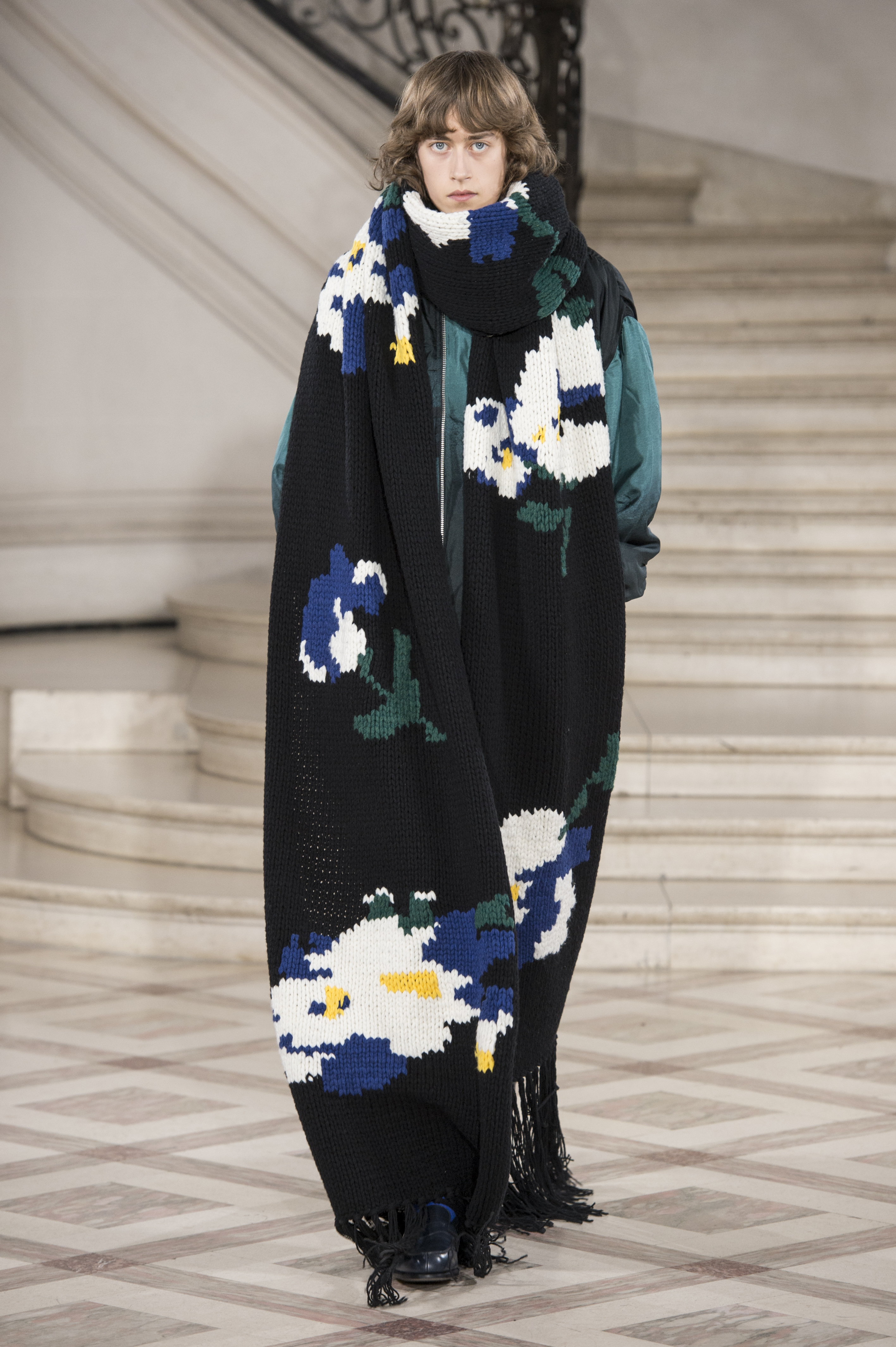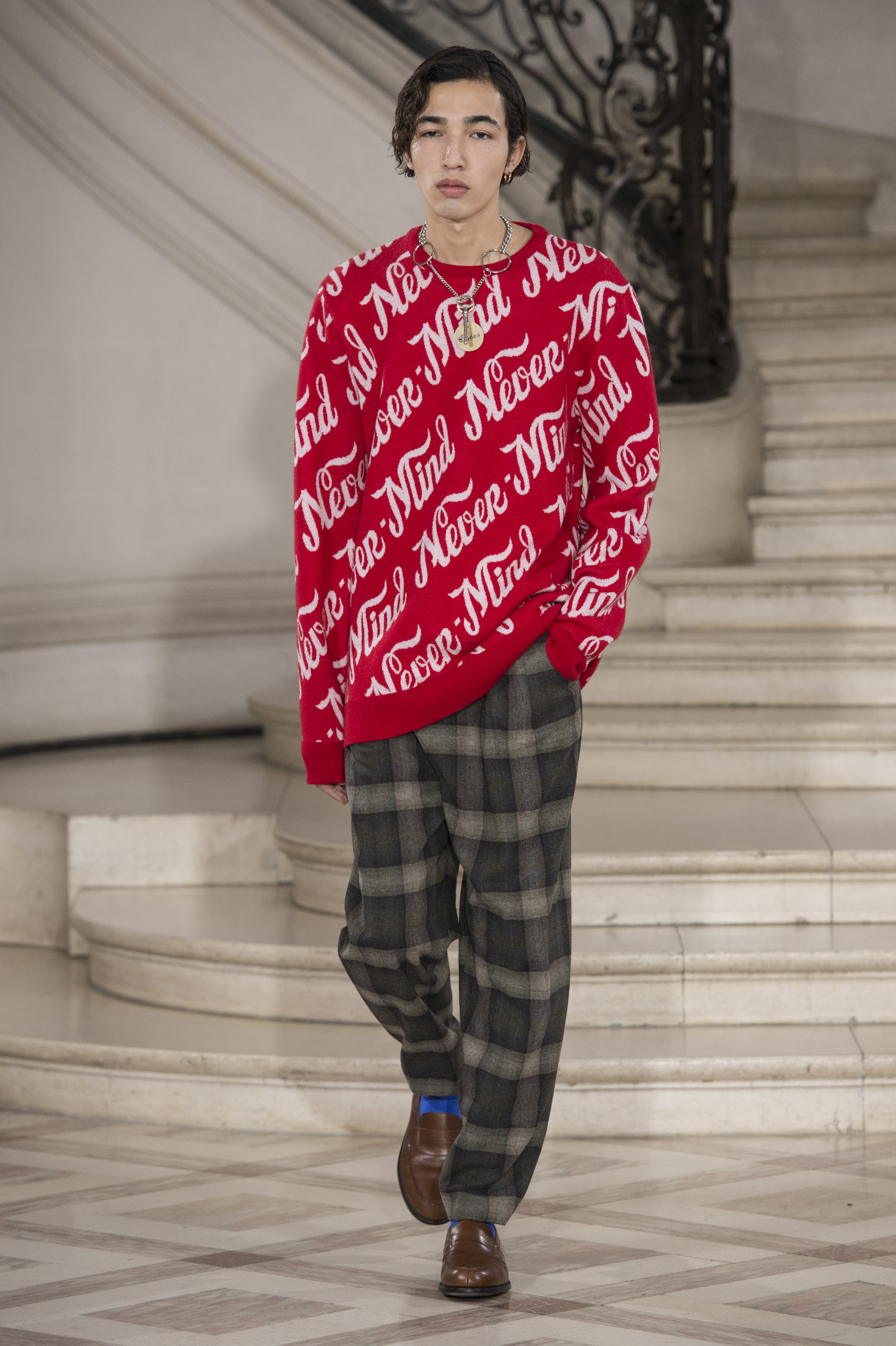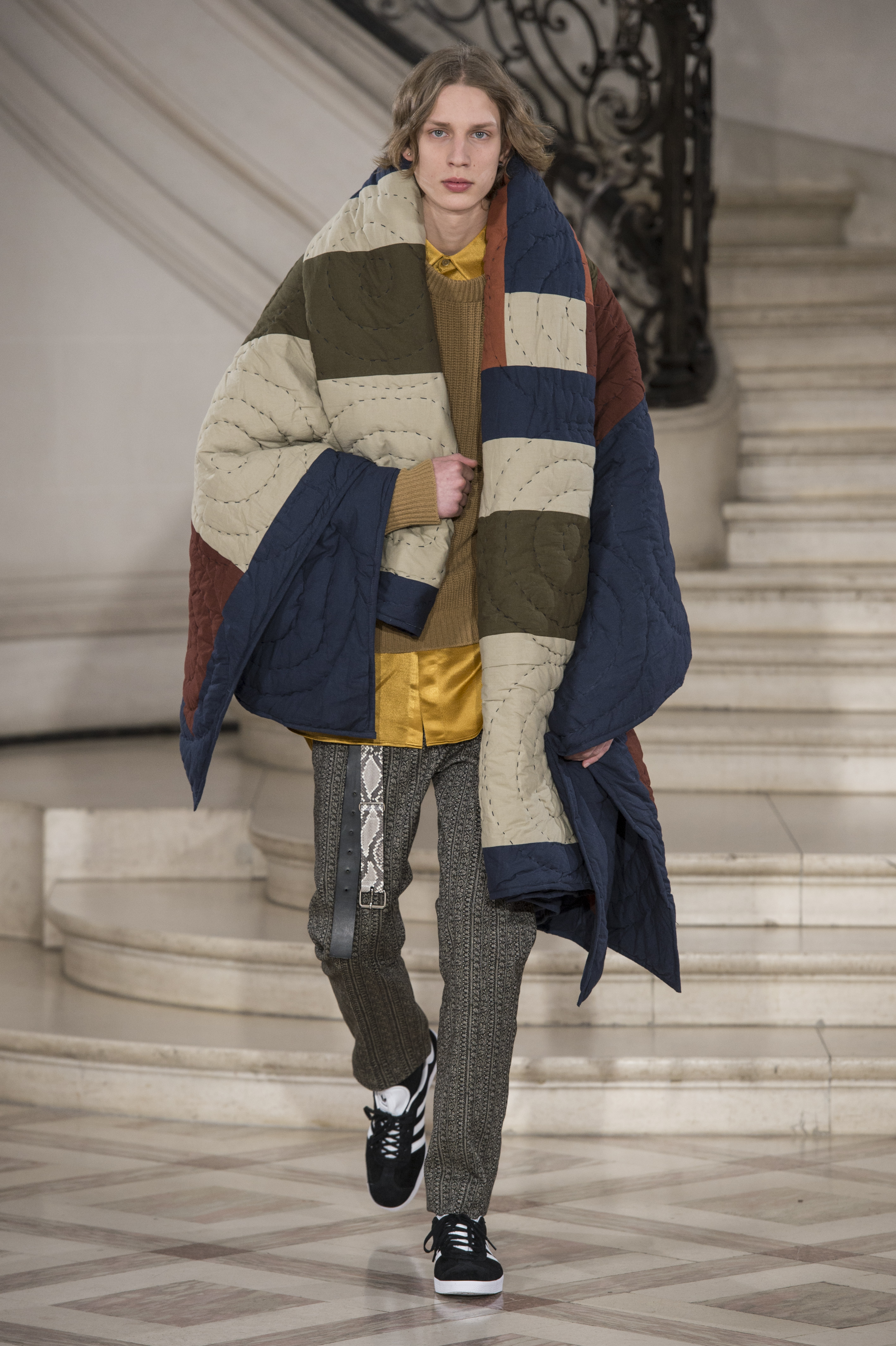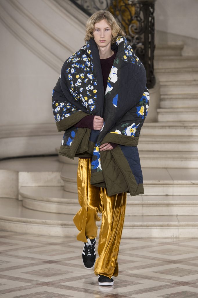 Aux antipodes d’une mode outrancière, Etudes studios créé en 2012, discret label créatif mais redoutable, présente sa dernière collection à Paris. Le défilé « NEVERMIND » est une ode à la procrastination, aux cycles et aux ablutions de la vie quotidienne urbaine. Une collection réconfortante où l’élégance se mélange au confort, la chemise esprit pyjama floral apprivoise le costume plus strict. Les silhouettes sont nonchalantes et généreuses grâce aux dimensions faramineuses des vêtements. Les pantalons sont larges, les écharpes en tricot descendent jusqu’au sol et les manches dépassent généreusement les mains. Quant aux matières, noblesse oblige, la dégaine est décontractée mais mesurée grâce à l’utilisation de beaux matériaux. La brillance du satin côtoie la légèreté du coton matelassé, du cuir suède et de la laine angora. La grosse maille, omniprésente retrouve son utilité première : la chaleur et le réconfort. Les pulls et gilets tricotés sont hors-normes, surplombés de motifs floraux ou de références pop. Trompe l’œil, les manteaux se déguisent en plaids matelassés, les mêmes qu’on enroule autour de soi lors des froides soirées d’hiver. Une palette de couleurs tout aussi chaude grâce à une dominance de bleu, d’aubergine, de tabac, de marron foncé, de rouille qui contrastent avec le rouge écarlate et le doré.