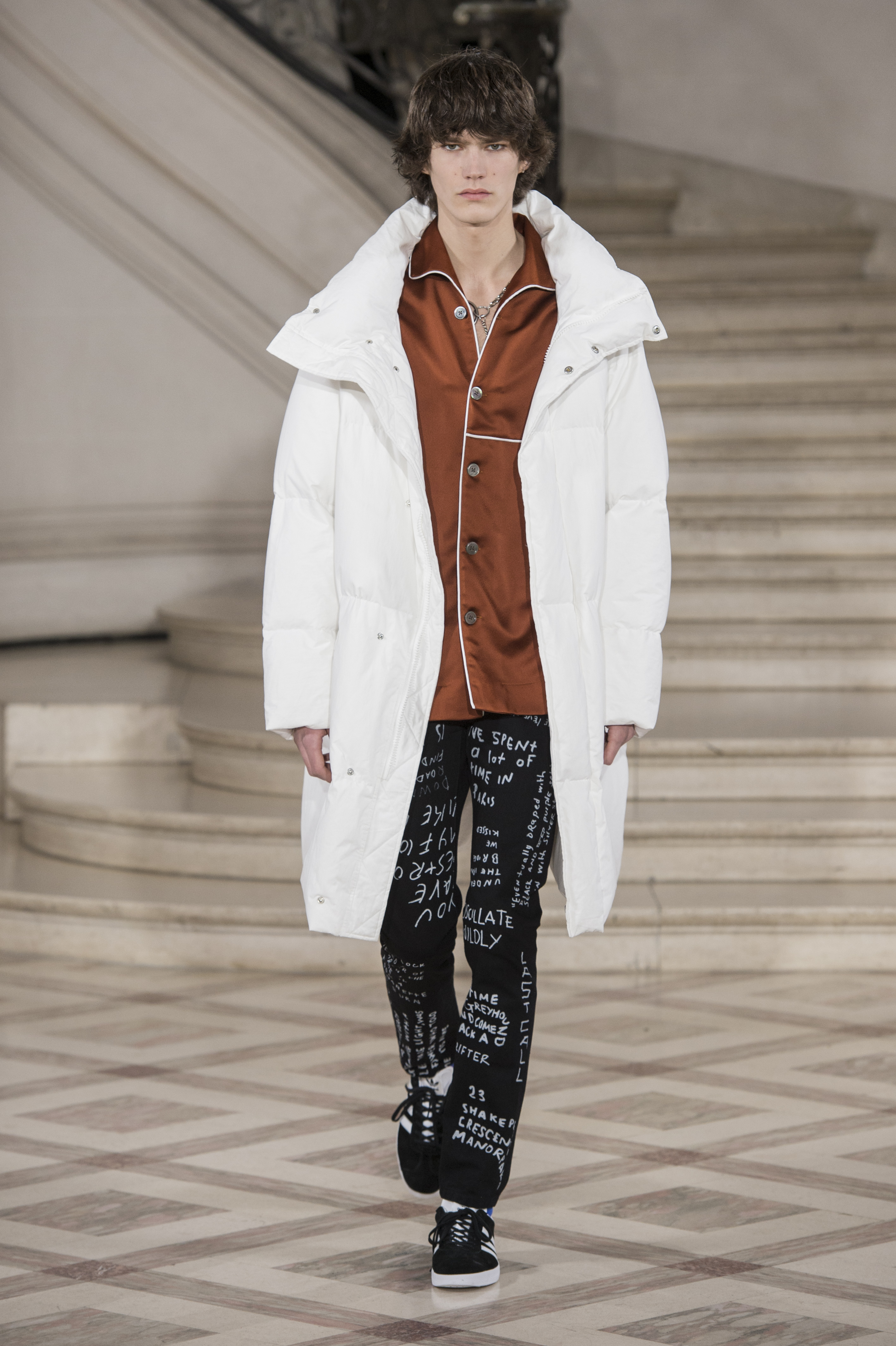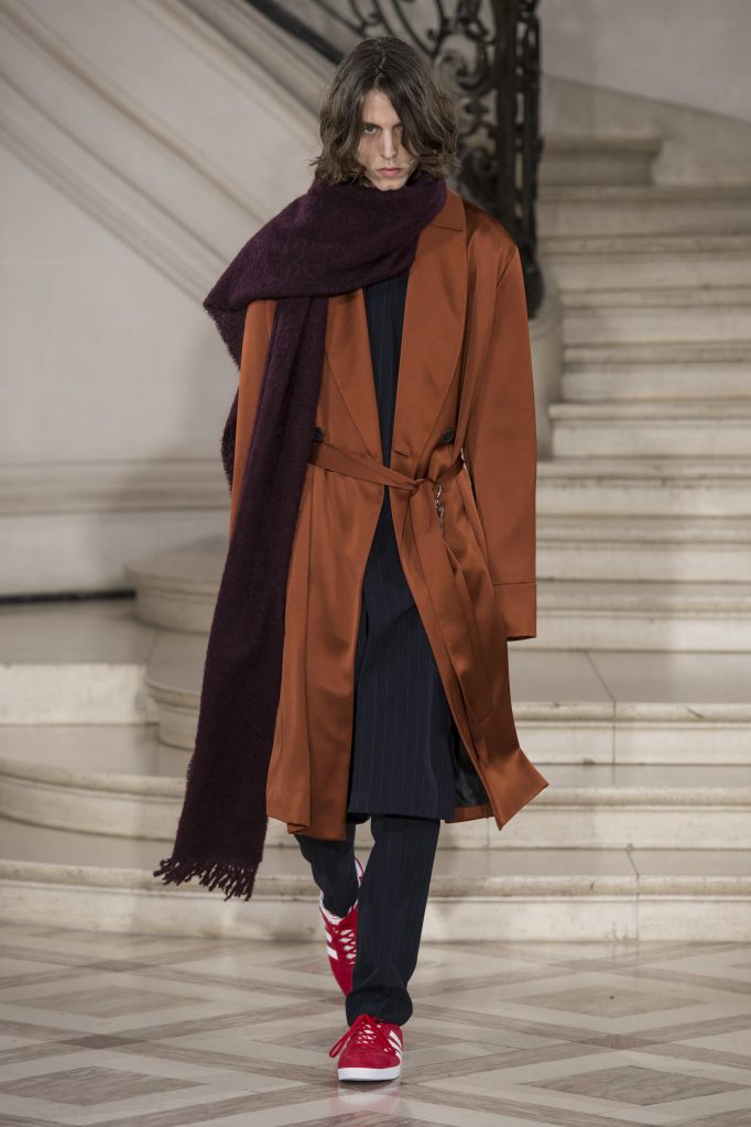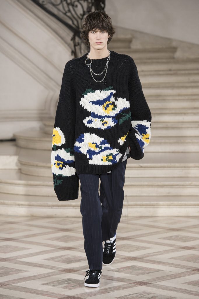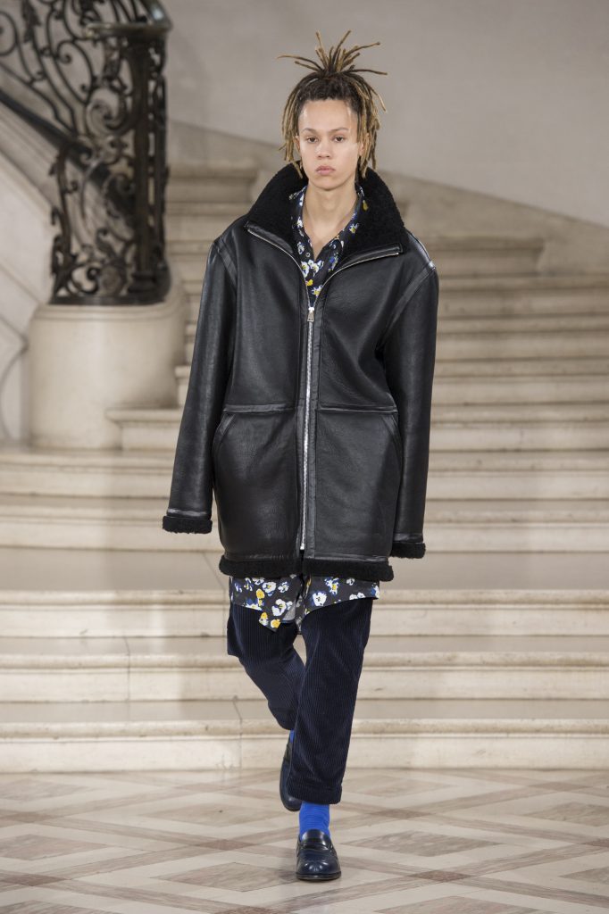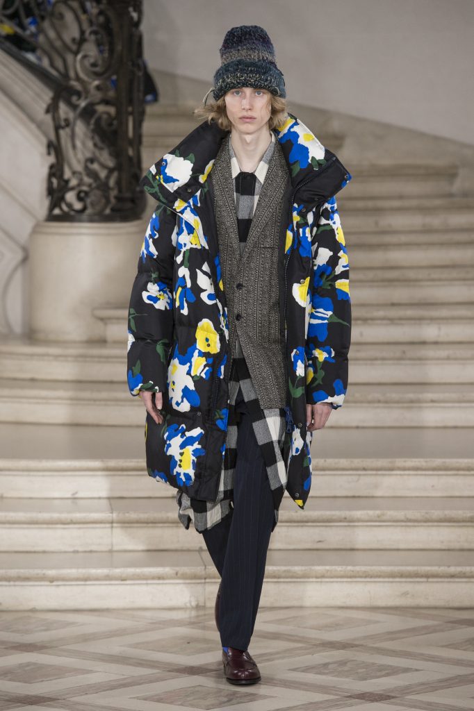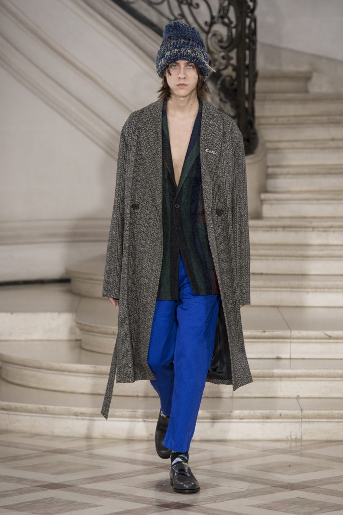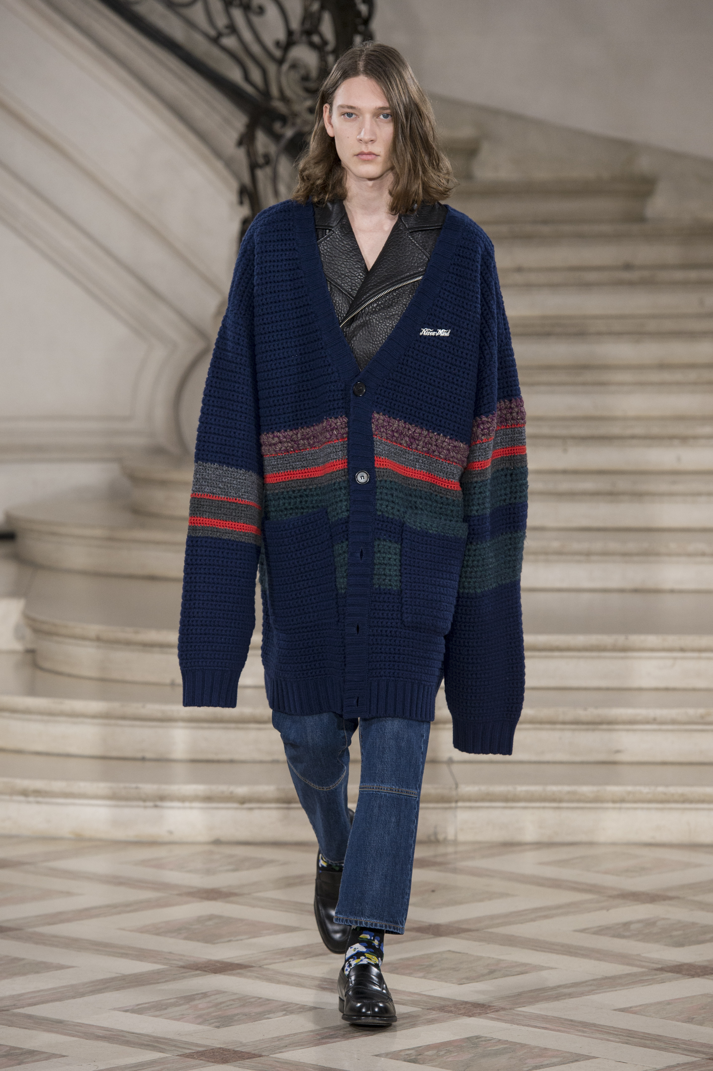 Aux antipodes d’une mode outrancière, Etudes studios créé en 2012, discret label créatif mais redoutable, présente sa dernière collection à Paris. Le défilé « NEVERMIND » est une ode à la procrastination, aux cycles et aux ablutions de la vie quotidienne urbaine. Une collection réconfortante où l’élégance se mélange au confort, la chemise esprit pyjama floral apprivoise le costume plus strict. Les silhouettes sont nonchalantes et généreuses grâce aux dimensions faramineuses des vêtements. Les pantalons sont larges, les écharpes en tricot descendent jusqu’au sol et les manches dépassent généreusement les mains. Quant aux matières, noblesse oblige, la dégaine est décontractée mais mesurée grâce à l’utilisation de beaux matériaux. La brillance du satin côtoie la légèreté du coton matelassé, du cuir suède et de la laine angora. La grosse maille, omniprésente retrouve son utilité première : la chaleur et le réconfort. Les pulls et gilets tricotés sont hors-normes, surplombés de motifs floraux ou de références pop. Trompe l’œil, les manteaux se déguisent en plaids matelassés, les mêmes qu’on enroule autour de soi lors des froides soirées d’hiver. Une palette de couleurs tout aussi chaude grâce à une dominance de bleu, d’aubergine, de tabac, de marron foncé, de rouille qui contrastent avec le rouge écarlate et le doré.