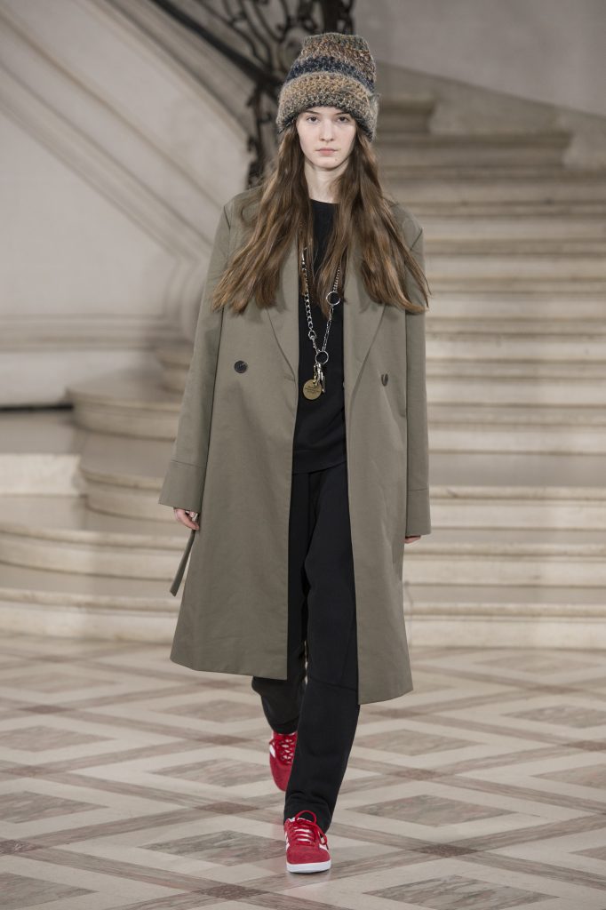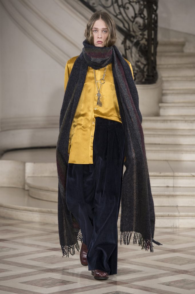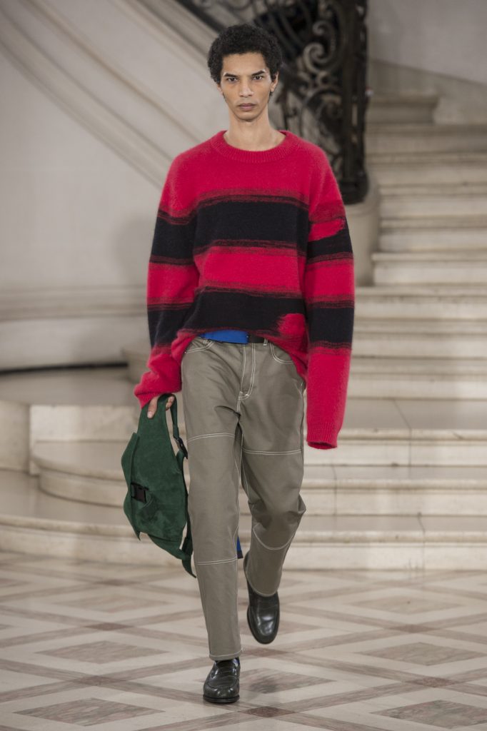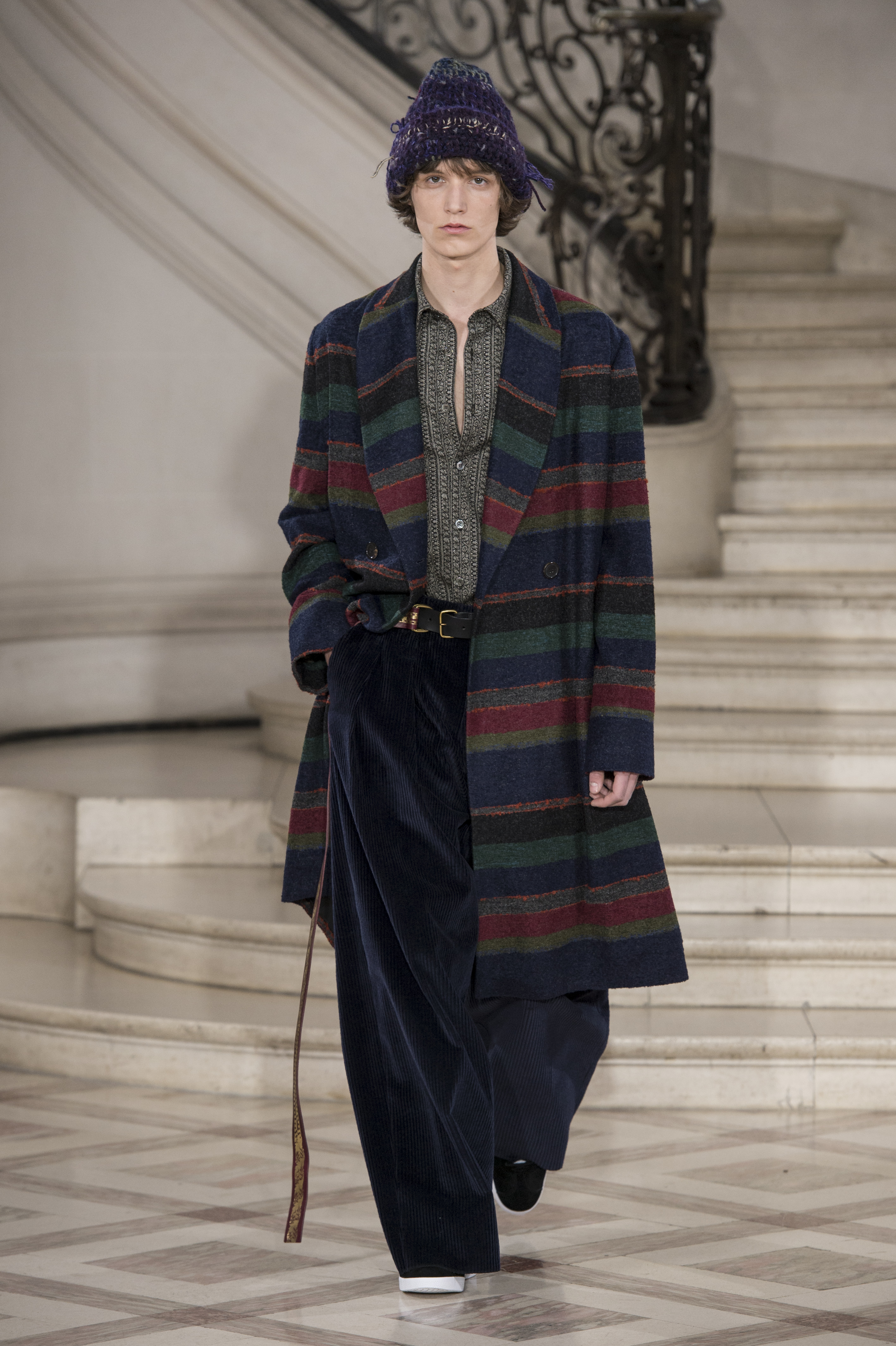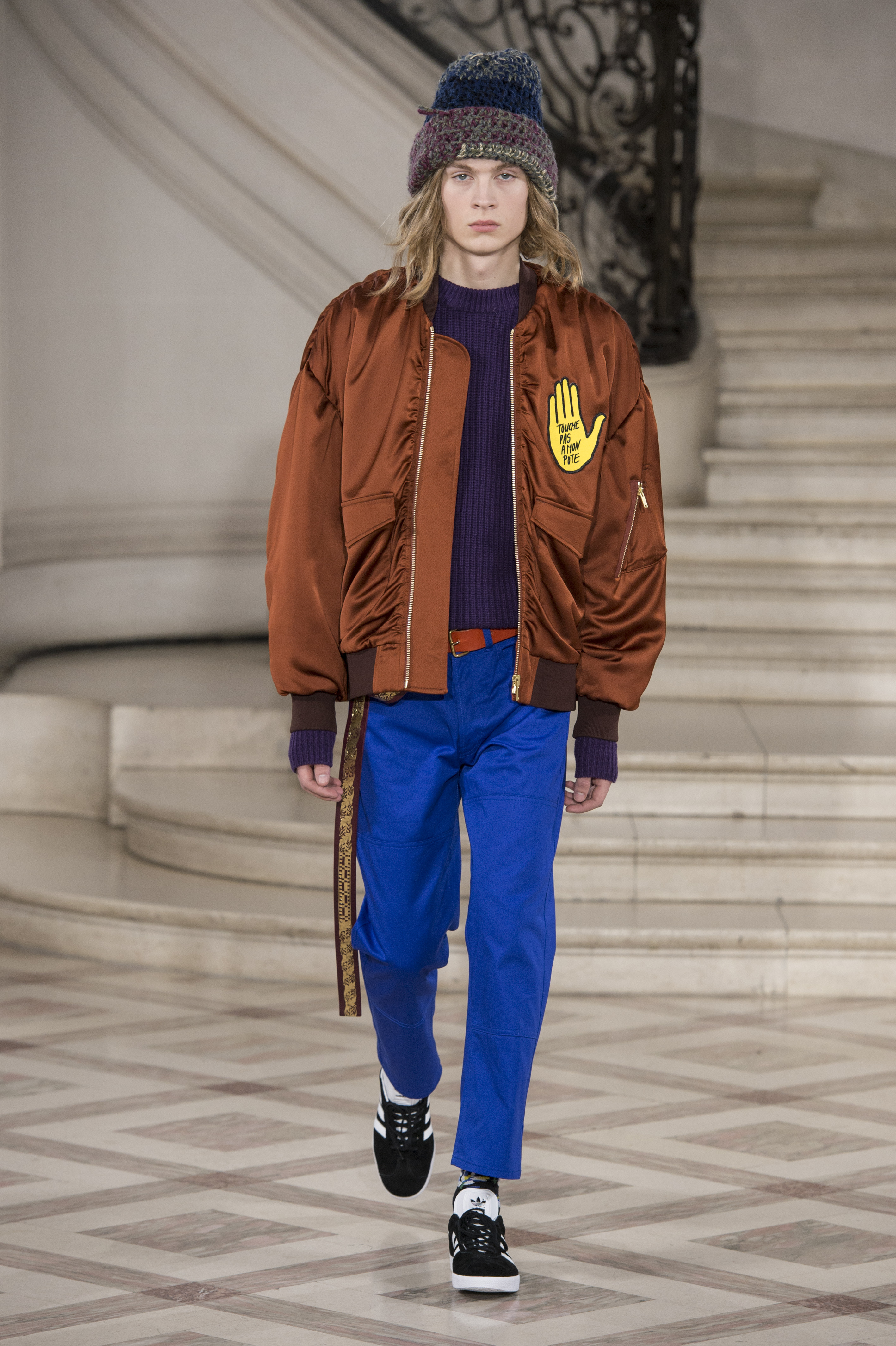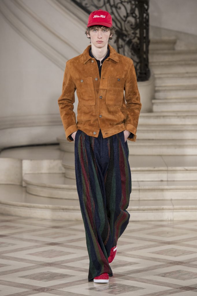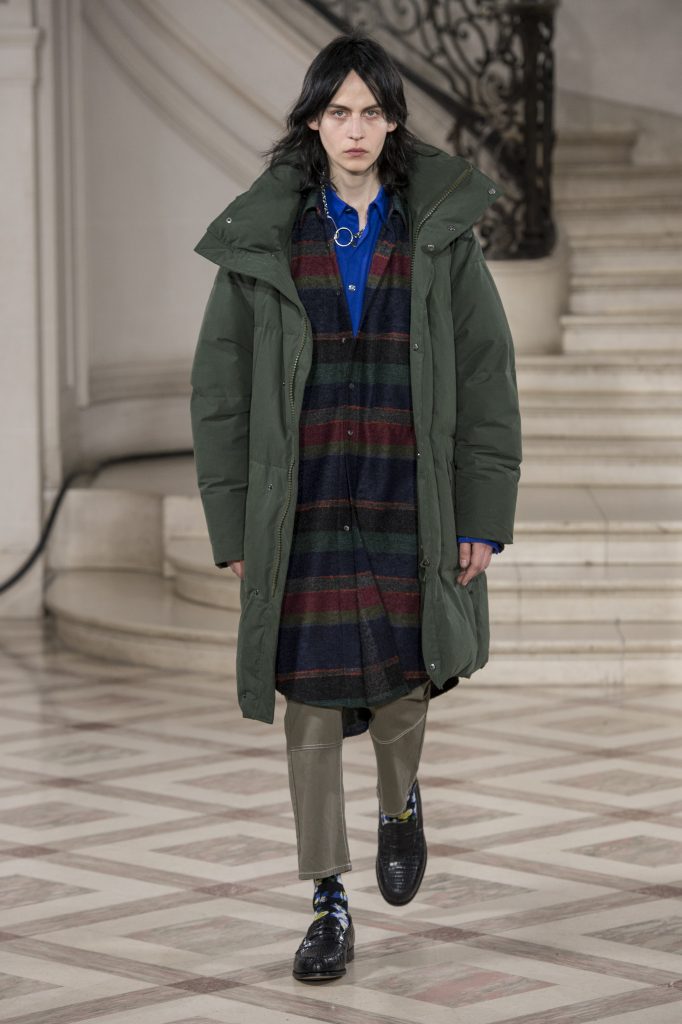 Aux antipodes d’une mode outrancière, Etudes studios créé en 2012, discret label créatif mais redoutable, présente sa dernière collection à Paris. Le défilé « NEVERMIND » est une ode à la procrastination, aux cycles et aux ablutions de la vie quotidienne urbaine. Une collection réconfortante où l’élégance se mélange au confort, la chemise esprit pyjama floral apprivoise le costume plus strict. Les silhouettes sont nonchalantes et généreuses grâce aux dimensions faramineuses des vêtements. Les pantalons sont larges, les écharpes en tricot descendent jusqu’au sol et les manches dépassent généreusement les mains. Quant aux matières, noblesse oblige, la dégaine est décontractée mais mesurée grâce à l’utilisation de beaux matériaux. La brillance du satin côtoie la légèreté du coton matelassé, du cuir suède et de la laine angora. La grosse maille, omniprésente retrouve son utilité première : la chaleur et le réconfort. Les pulls et gilets tricotés sont hors-normes, surplombés de motifs floraux ou de références pop. Trompe l’œil, les manteaux se déguisent en plaids matelassés, les mêmes qu’on enroule autour de soi lors des froides soirées d’hiver. Une palette de couleurs tout aussi chaude grâce à une dominance de bleu, d’aubergine, de tabac, de marron foncé, de rouille qui contrastent avec le rouge écarlate et le doré.
