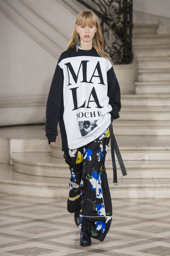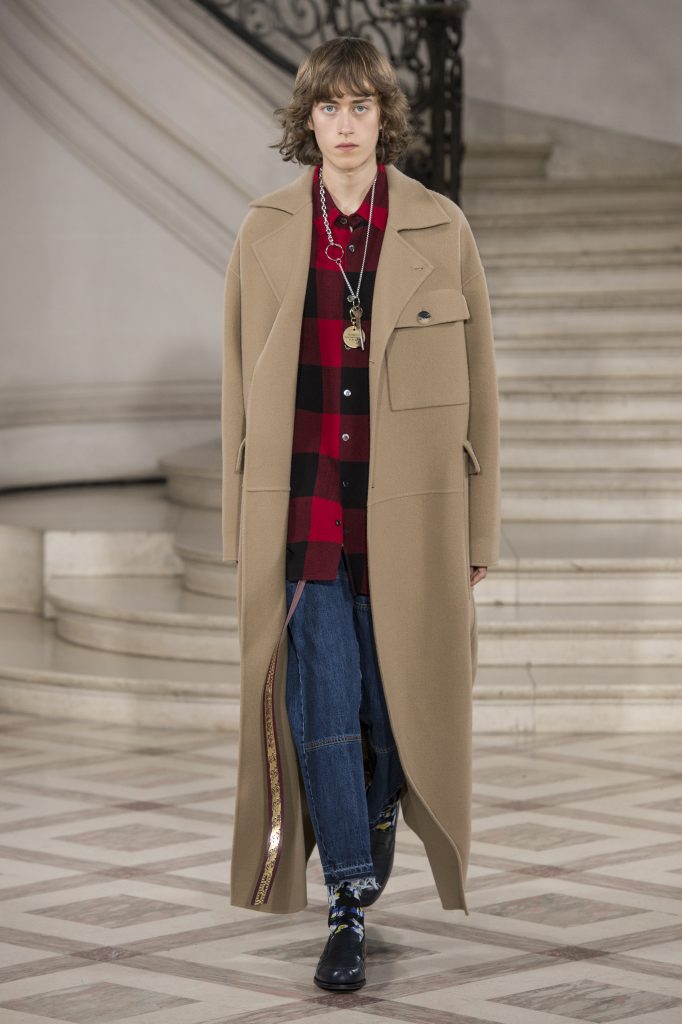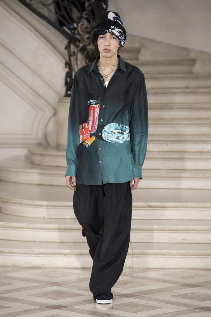 Le grunge, subtil, s’invite dans cette garde-robe hautement élaborée. On ne peut s’empêcher de faire le lien avec le premier album du groupe Nirvana « Nevermind » sorti en 1991, emblème de ce mouvement alternatif. Motifs carreaux, messages subversifs manuscrits, chaînes de cou agrémentées de formes géométriques et de grandes clés, qui ouvrent des portes imaginaires. Nombreuses sont les références artistiques de la collection. Les motifs floraux tachetés ont été imaginé par Matthew Chambers. Un mannequin arbore un tee oversize « Mala Noche », le premier film du réalisateur esthète Gus Van Sant. Un autre, porte une chemise de soie imprimée d’un cendrier consommé et d’une cannette de Coca cola, œuvre signée Digue Blair.