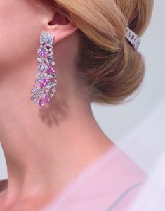 Morganite, perles, spinelles, pierres de lune et saphirs Padparadscha se marient aux diamants.