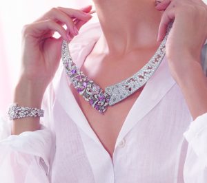 En or et en pierres précieuses, la dentelle et le ruban se déclinent ici dans des dégradés subtils de roses et de gris.