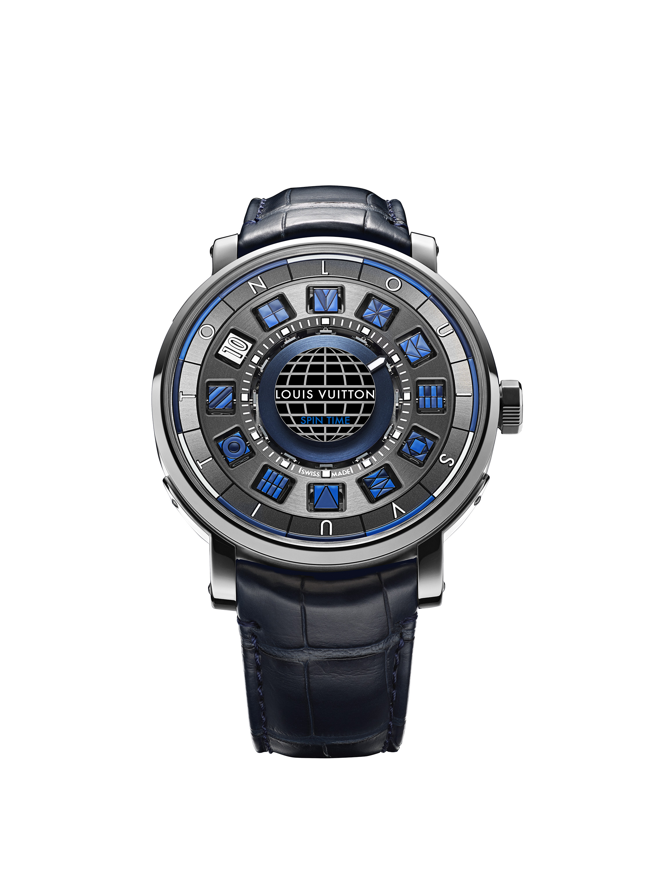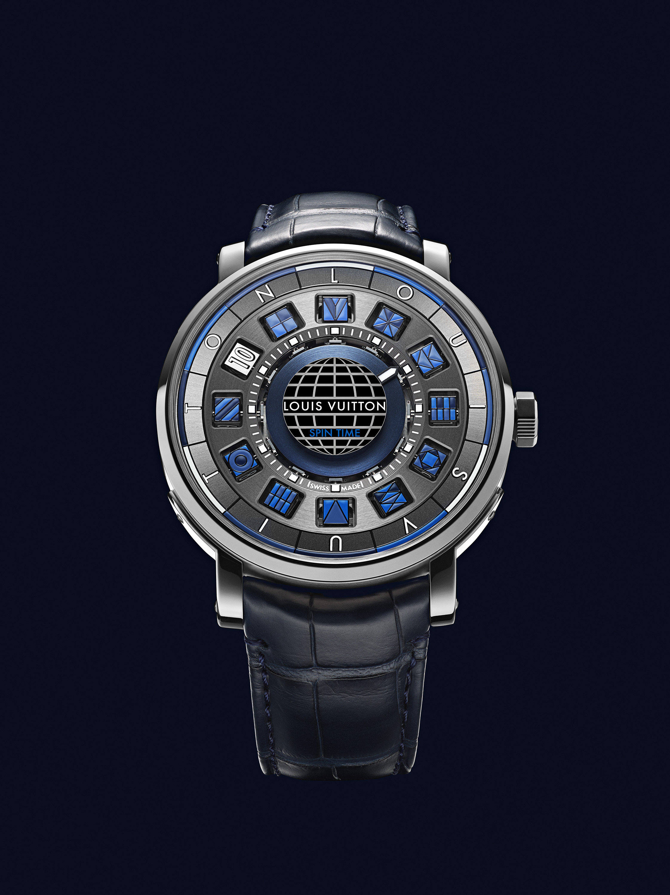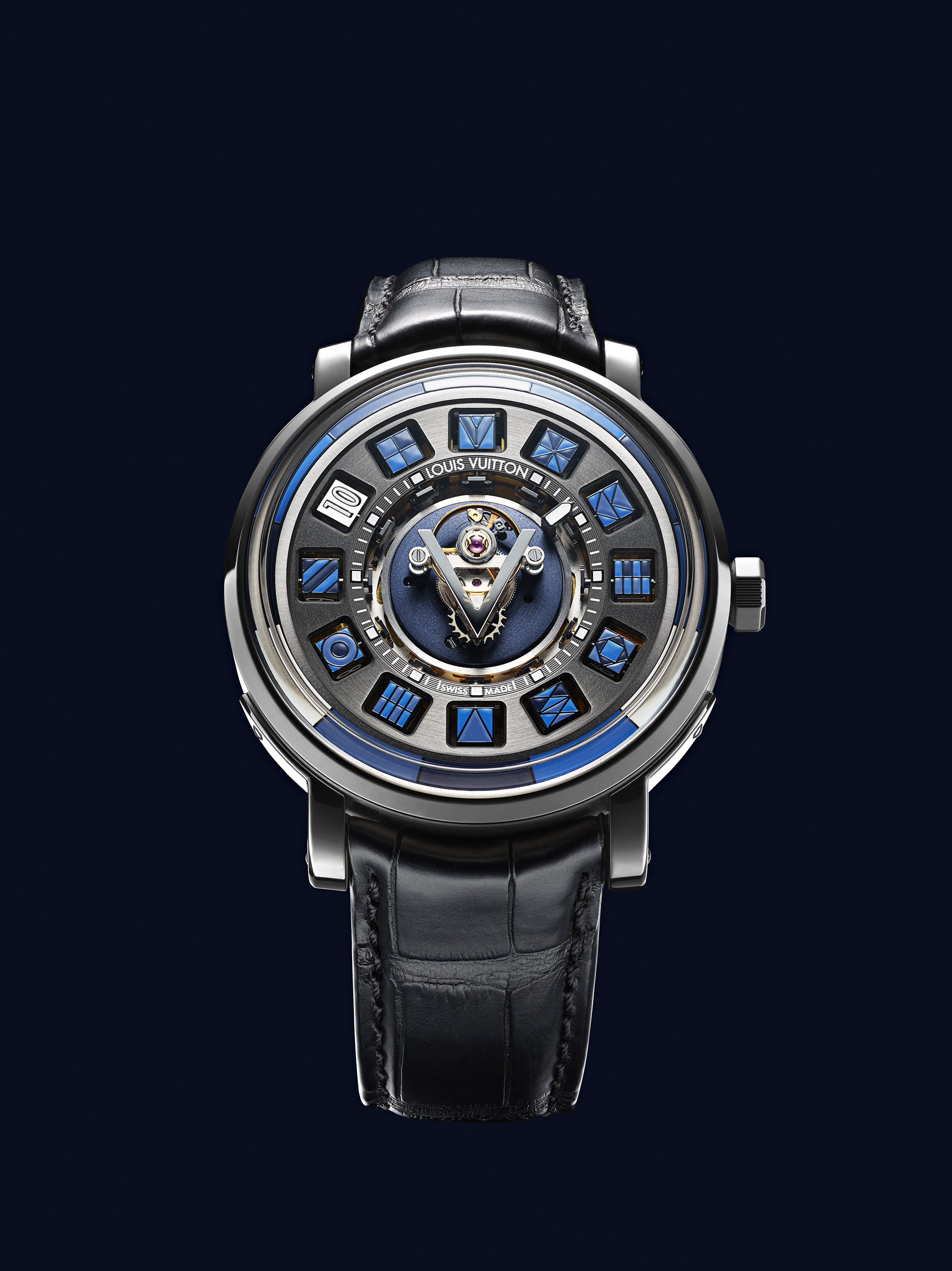 En jouant sur de subtiles variations de bleu, cette nouvelle création Louis Vuitton intègre un tourbillon volant placé au centre du cadran, effectuant sa rotation en une minute. Véritable défi technique et esthétique, l’association du tourbillon volant central et du dispositif d’affichage Spin Time est une première dans l’histoire horlogère. Avec sa conception et son design uniques, la cage du tourbillon semble littéralement flotter au centre de la montre. Une glace saphir spécifique a ainsi été dessinée et conçue pour souligner cet effet sans pour autant augmenter de manière trop importante l’épaisseur de la montre.