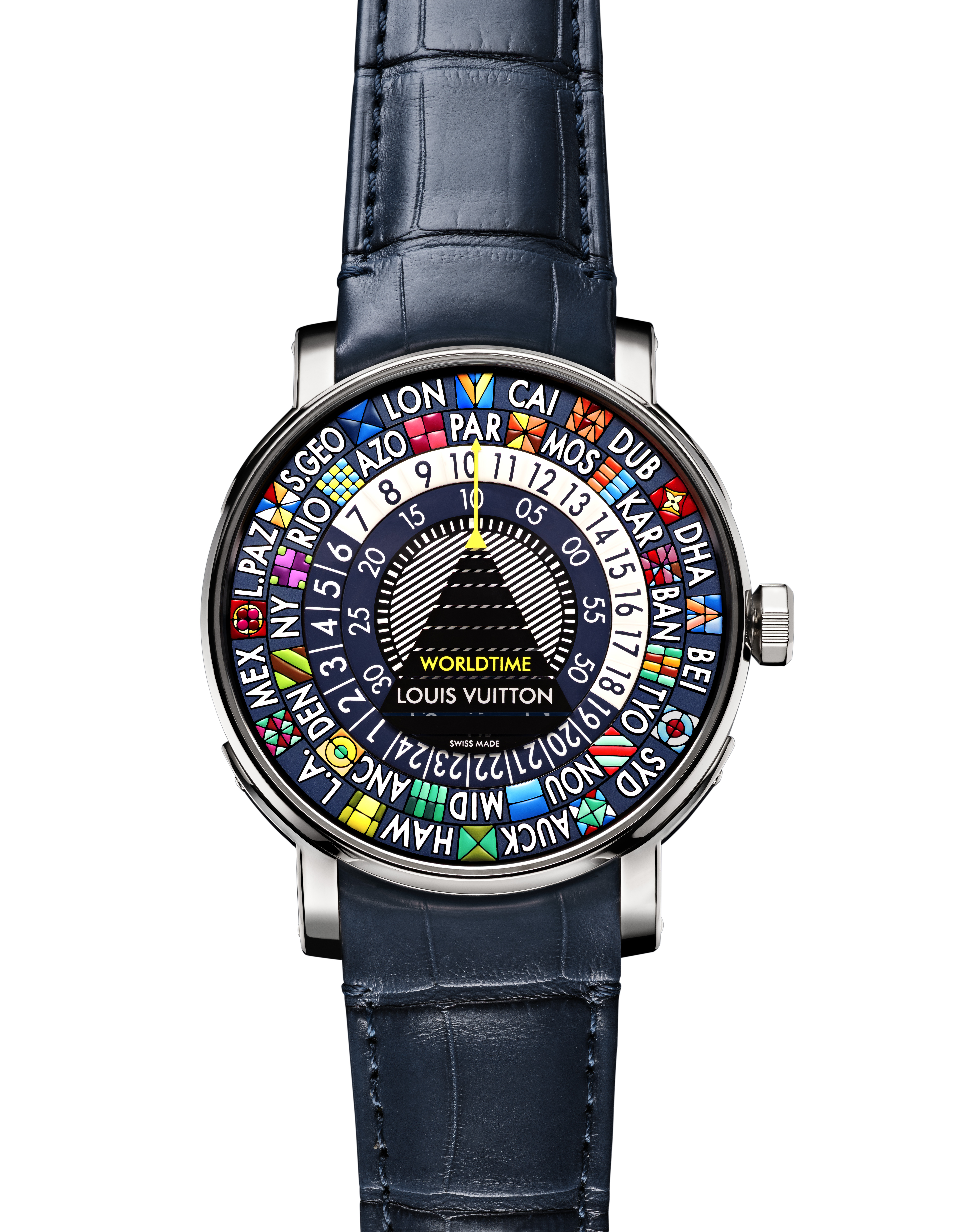 Positionné au centre de la glace saphir, un disque aux rayures sobres – portant l’inscription Louis Vuitton Spin Time – évoque la forme d’un globe terrestre stylisé et perpétue la tradition globe-trotteuse de Louis Vuitton. 1 Une lecture ludique et innovante de l’heure En 2010, Louis Vuitton présente la Tambour Spin Time GMT et propose une nouvelle façon de lire l’heure, innovante et ludique, grâce à un ingénieux système de douze cubes rotatifs par un mouvement manufacture (LV119) révolutionnant le principe des heures sautantes. En 2014, la Maison va encore plus loin en lançant une autre montre totalement inédite : un garde-temps singulier dans sa forme – un nouveau boîtier baptisé Escale inspiré des malles de la Maison, captivant par ses fonctions, une interprétation inédite de la fonction Worldtime, et au cadran coloré s’inspirant de la personnalisation des malles par des bandes de couleurs, initiales, blasons, peints à la main. Cet univers, qui a servi d’inspiration pour la création des cadrans des Escale Worldtime et Escale Time Zone, a également été réinterprété lors de la conception du cadran de la montre Escale Spin Time. Ici, l’affichage de l’heure résulte de la rotation simultanée de deux des douze axes dont chaque extrémité est pourvue d’un cube présentant quatre faces différentes : les heures du jour et de la nuit (10 h/22 h) sur deux faces, ainsi que deux drapeaux différents colorés inspirés des malles personnalisées de la Maison sur les deux autres. Plus traditionnel, l’affichage des minutes se fait, quant à lui, grâce à une aiguille. Un boîtier bi-matière à la silhouette unique Comme une malle de voyage miniature renfermant un trésor mécanique, le boîtier de la montre Escale Spin Time Bleue reprend le design iconique des coins des malles Louis Vuitton et les transforme en cornes qui le protègent élégamment des agressions du temps. D’un diamètre de 41 mm et d’une épaisseur de 11,2 mm, le boîtier de la montre Escale Spin Time Bleue est en titane brossé avec une lunette, des cornes et une couronne en or blanc 18 carats. Sa fine lunette offre une belle ouverture sur le cadran, permettant une lisibilité optimale de l’heure et du ballet des cubes rotatifs. Au dos, le fond saphir dévoile un disque en aluminium couplé à une masse oscillante tournoyant avec précision autour d’un grand LV aux contours très graphiques. Proposée sur un bracelet en alligator bleu marine doublé de veau effet caoutchouc jaune et pourvue d’une boucle ardillon en or blanc 18 carats, la montre Escale Spin Time Bleue de Louis Vuitton est un garde-temps unique en son genre.