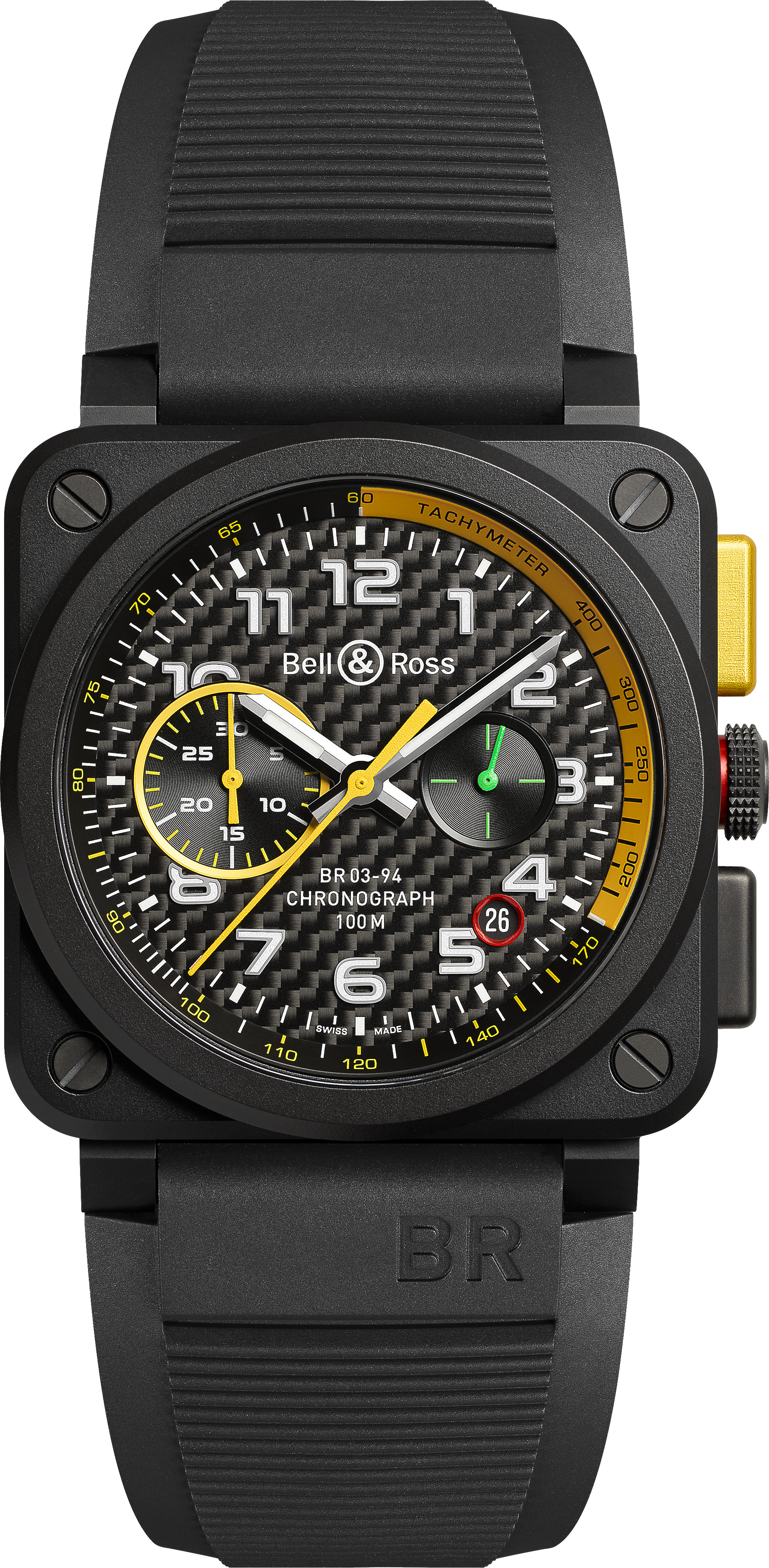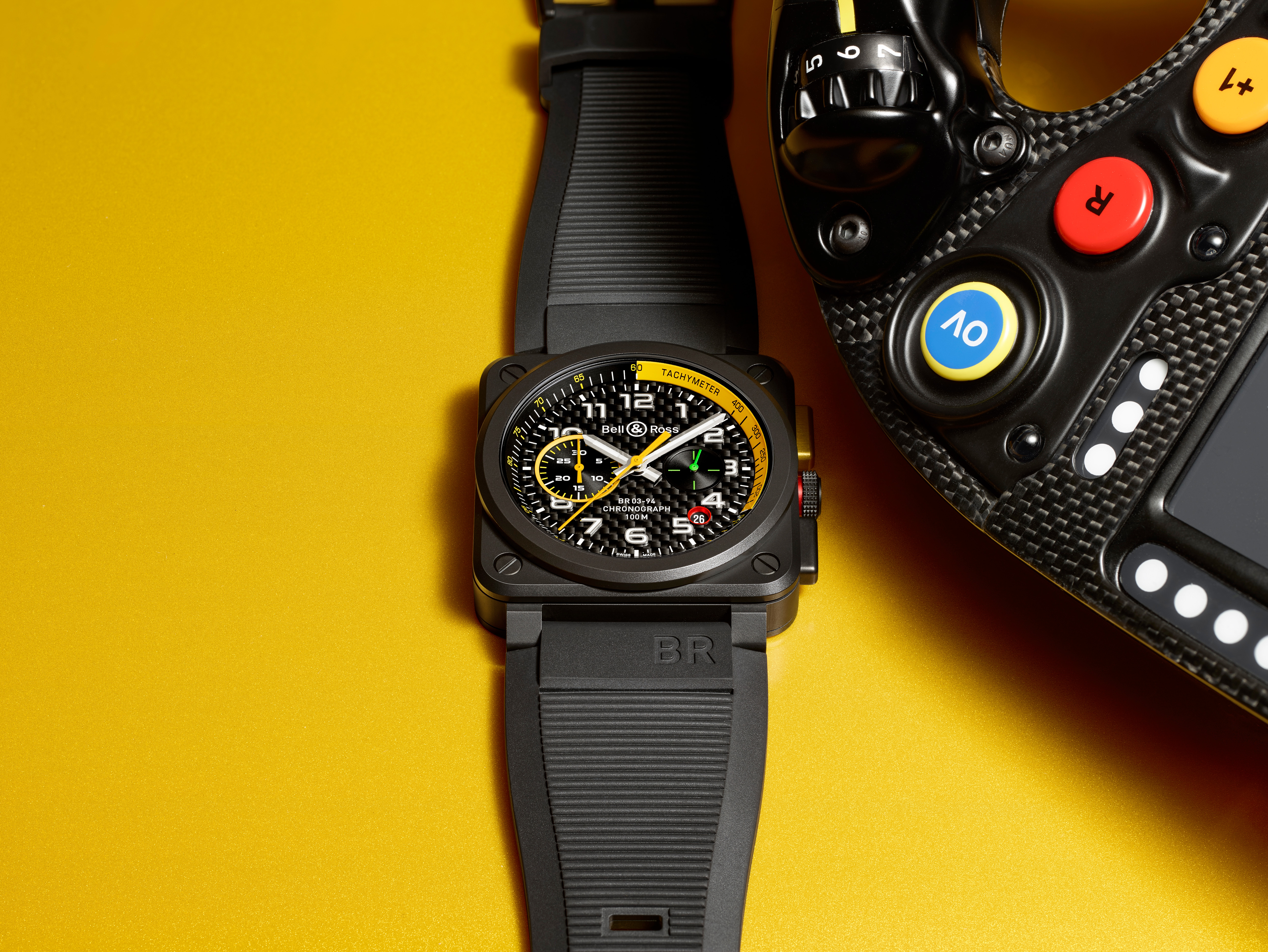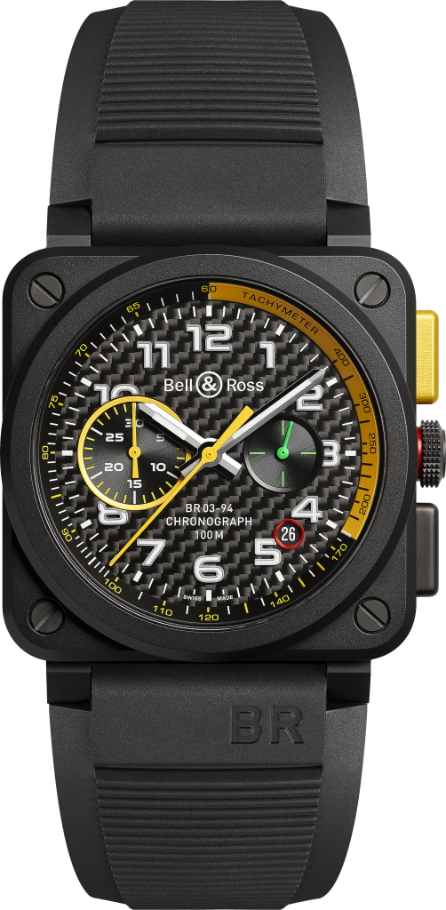 La nouvelle BR03-94 RS17 avec sa conception inspirée de la Formule1, s’appuie sur les dernières avancées technologiques et les matériaux les plus innovants imaginés pour cette discipline. Ce garde-temps s’habille d’un boîtier en céramique conçu pour résister aux chocs. Il est particulièrement adapté à la pratique de la course automobile. Son cadran en fibre de carbone lui donne un aspect très sportif. Ce matériau léger et résistant, rappelle le volant de la monoplace Renault. Le poussoir start & stop du chronographe se pare d’aluminium anodisé jaune. Cette teinte emblématique est utilisée par le constructeur français depuis ses débuts en Formule 1.