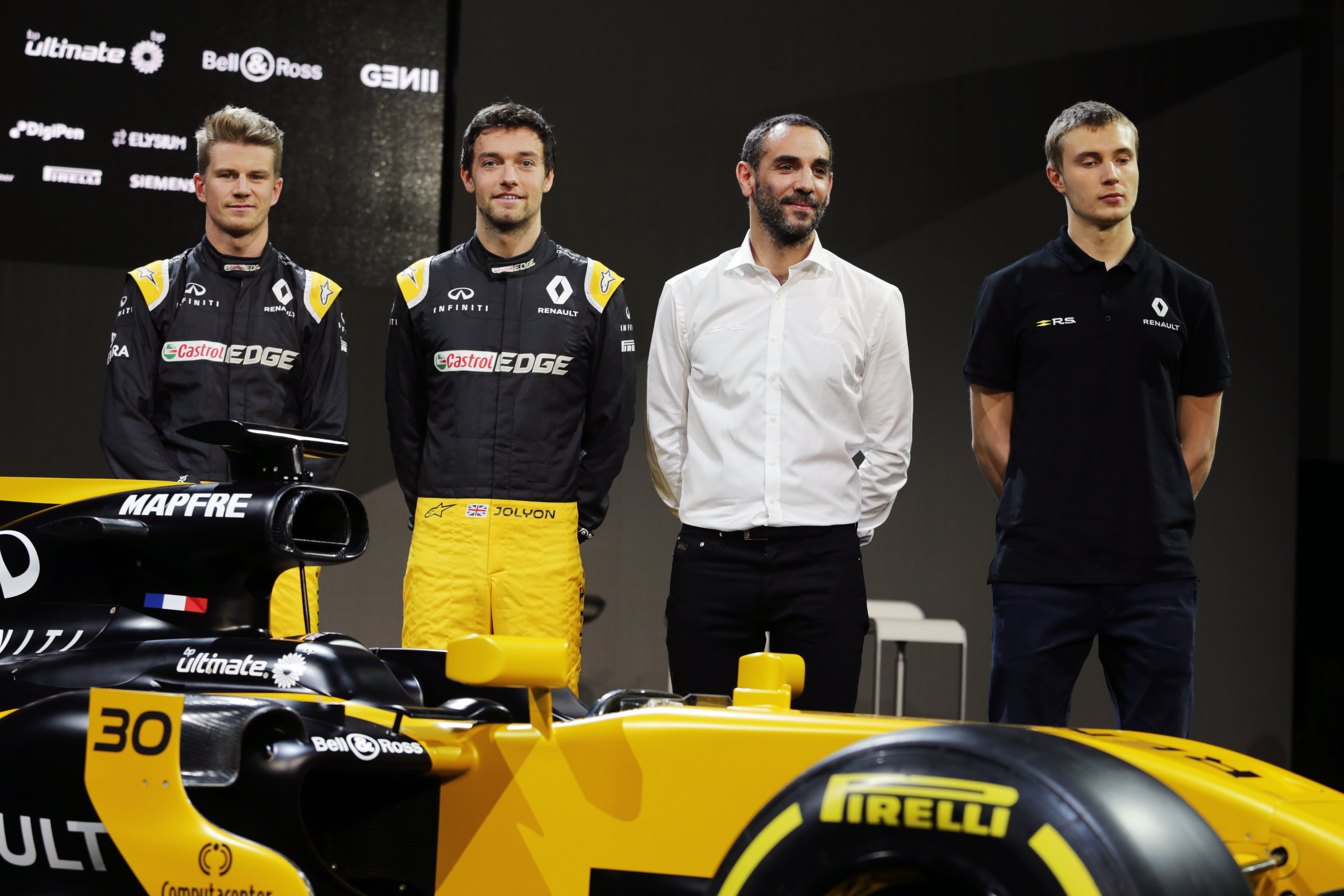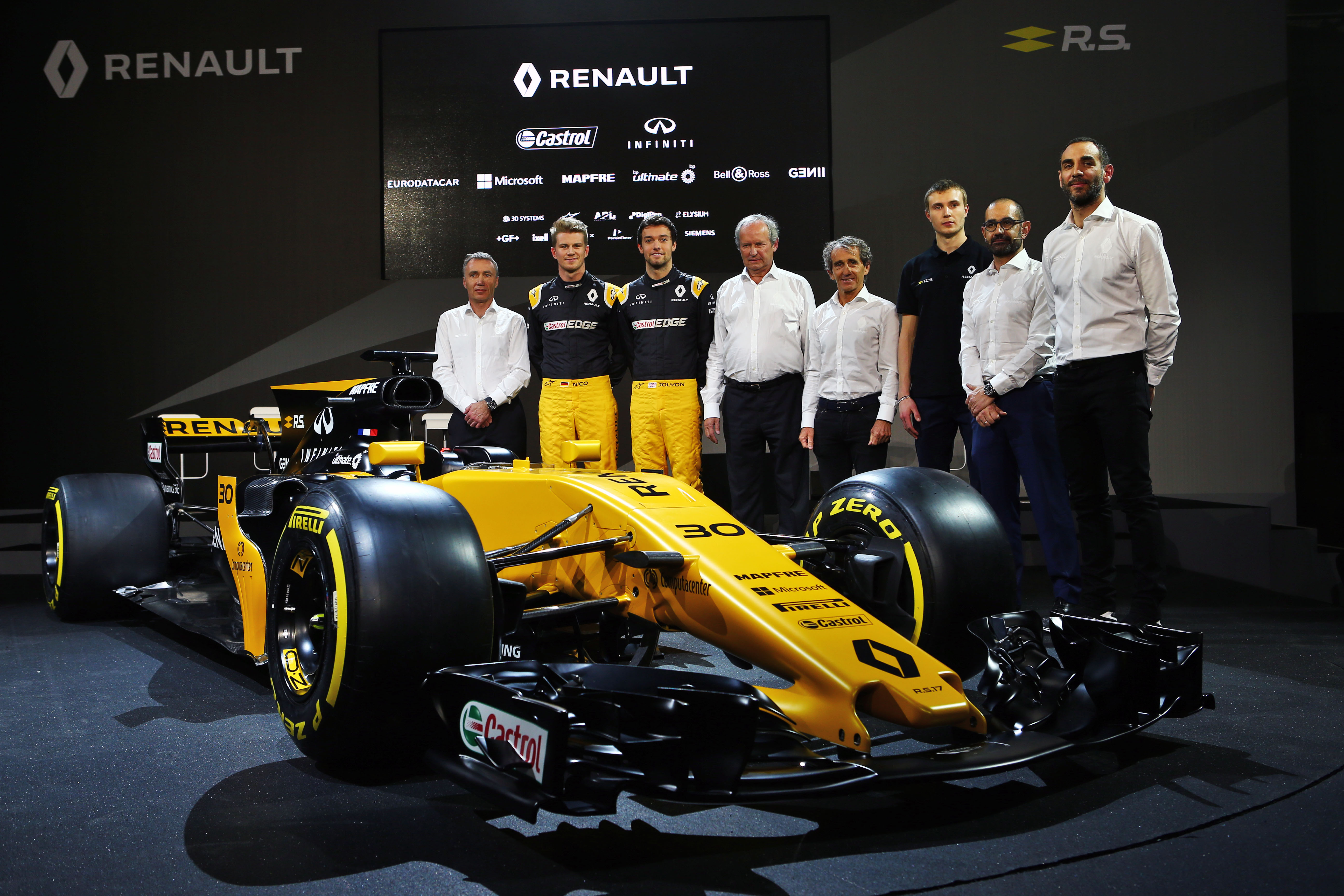 - (L to R): Bob Bell (GBR) Renault Sport F1 Team Chief Technical Officer; Nico Hulkenberg (GER) Renault Sport F1 Team; Jolyon Palmer (GBR) Renault Sport F1 Team; Jerome Stoll (FRA) Renault Sport F1 President; Alain Prost (FRA); Sergey Sirotkin (RUS) Renault Sport F1 Team Third Driver; Thierry Koskas, Renault Executive Vice President of Sales and Marketing; Cyril Abiteboul (FRA) Renault Sport F1 Managing Director, and the Renault Sport F1 Team RS17. Renault Sport Formula One Team RS17 Launch, Royal Horticultural Society Headquarters, London, England. Tuesday 21st February 2017.
