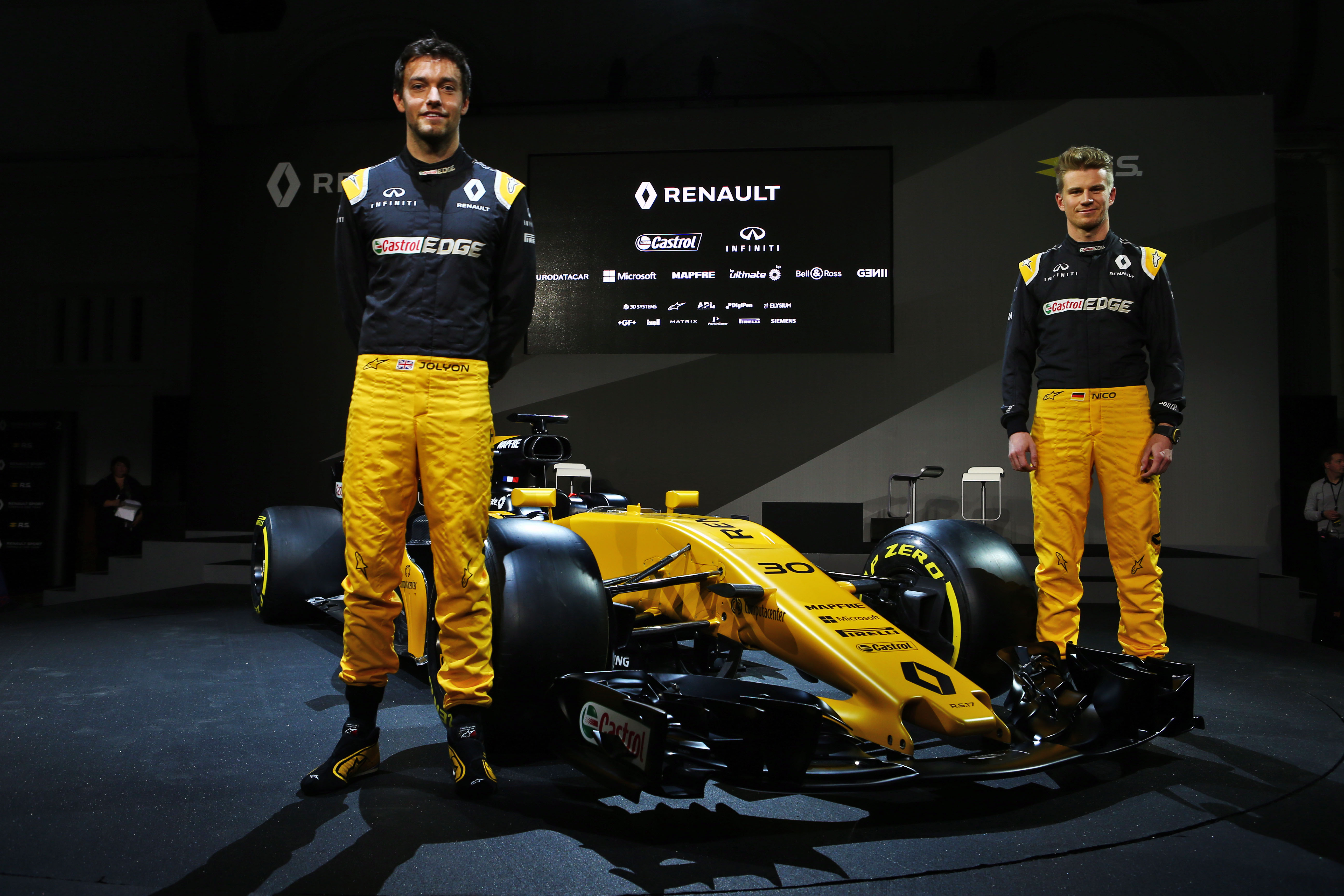 - Jolyon Palmer (GBR) Renault Sport F1 Team and team mate Nico Hulkenberg (GER) Renault Sport F1 Team with the Renault Sport F1 Team RS17. Renault Sport Formula One Team RS17 Launch, Royal Horticultural Society Headquarters, London, England. Tuesday 21st February 2017.