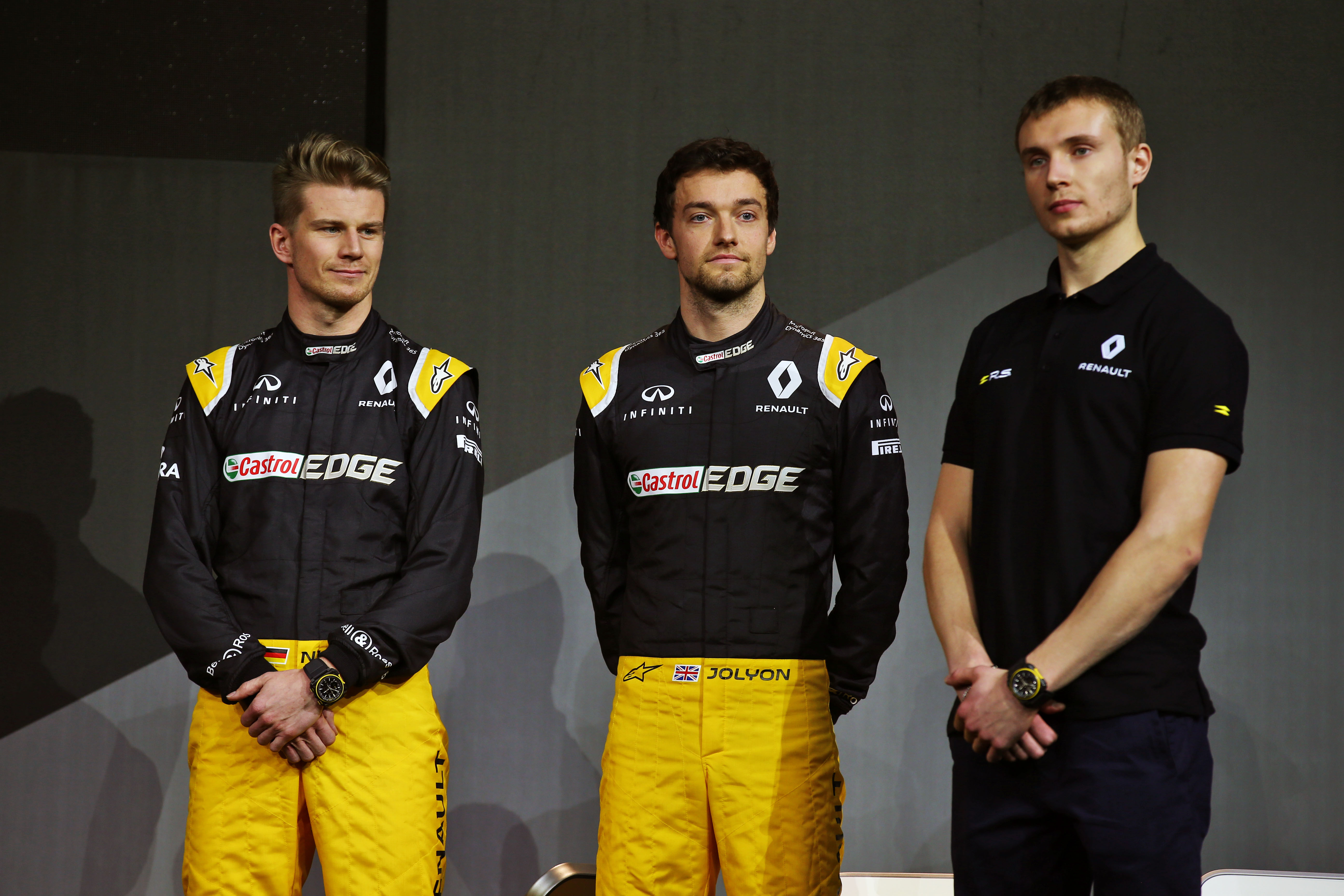 - (L to R): Nico Hulkenberg (GER) Renault Sport F1 Team with Jolyon Palmer (GBR) Renault Sport F1 Team and Sergey Sirotkin (RUS) Renault Sport F1 Team Third Driver. Renault Sport Formula One Team RS17 Launch, Royal Horticultural Society Headquarters, London, England. Tuesday 21st February 2017.
