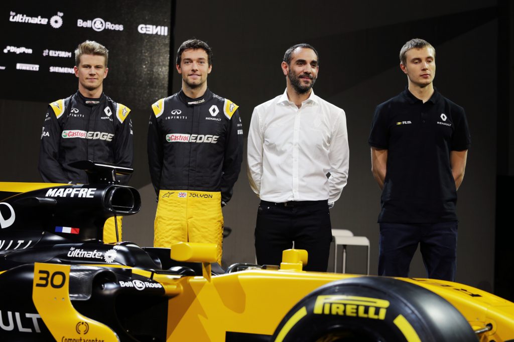 - (L to R): Nico Hulkenberg (GER) Renault Sport F1 Team with Jolyon Palmer (GBR) Renault Sport F1 Team; Cyril Abiteboul (FRA) Renault Sport F1 Managing Director; Sergey Sirotkin (RUS) Renault Sport F1 Team Third Driver, with the Renault Sport F1 Team RS17. Renault Sport Formula One Team RS17 Launch, Royal Horticultural Society Headquarters, London, England. Tuesday 21st February 2017.